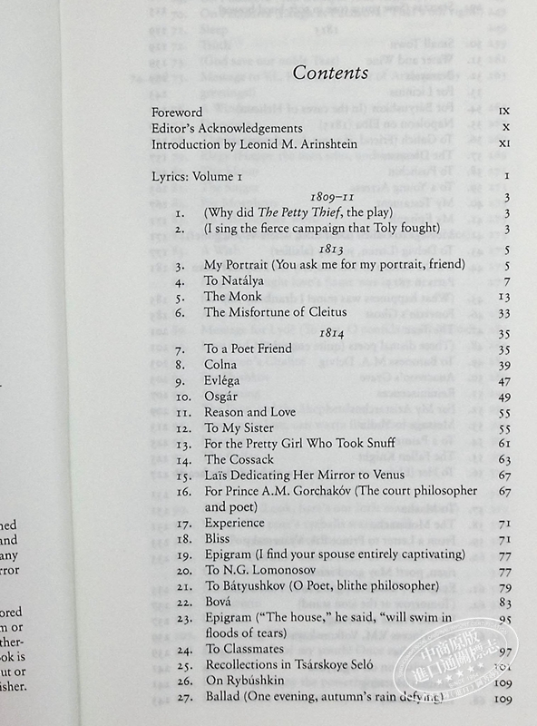 卷一收集了普希金在察尔科塞洛帝国学院还是年轻学生时写的诗,包括《眼泪》、《歌手》和《医院墙上的笔记》等早期精品。