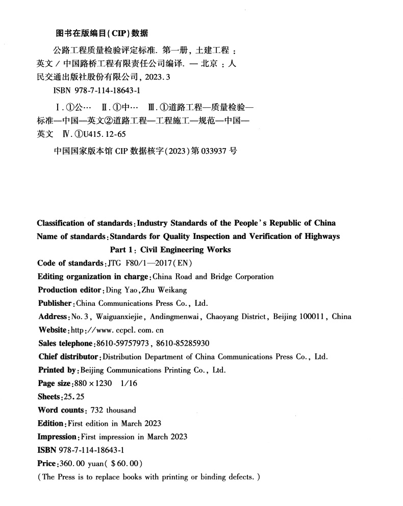 书名:公路工程质量检验评定标准 第一册 土建工程(英文版)