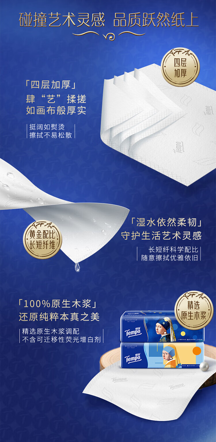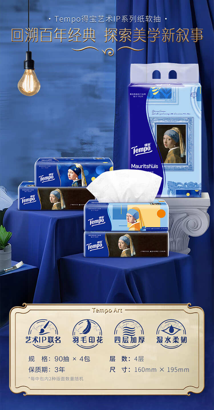 得宝(TEMPO)纸巾4层抽取式面巾纸 抽纸 (戴珍珠耳环的少女IP) 90抽*4包/提