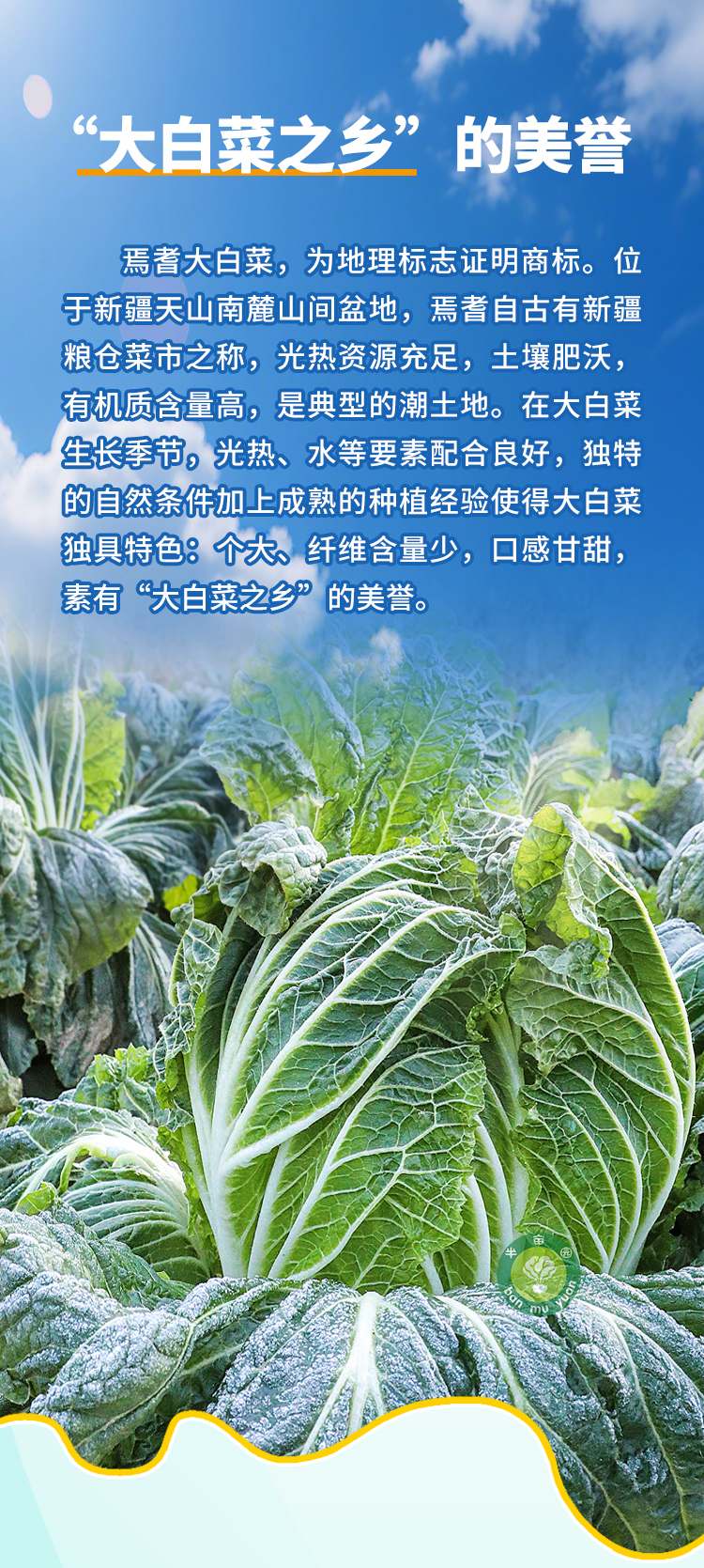 产品特点:顺应季节规律一年一茬,100多天的生长周期,打霜后采收。喝天山雪水长大,汁多甘甜,纤维细,让你瞬间找回大自然的味道