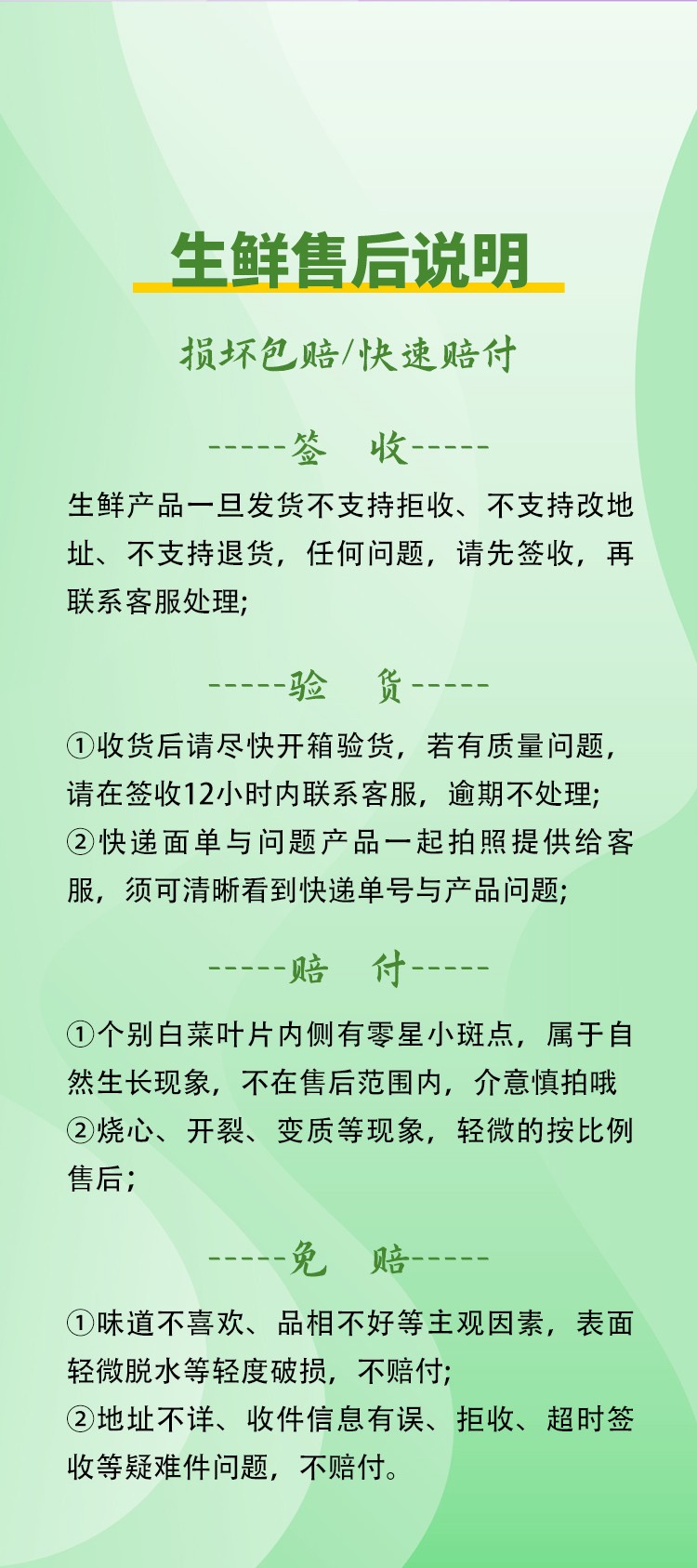6、味道不喜欢、品相不好等主观因素,表面轻微脱水等轻度破损,不赔付。