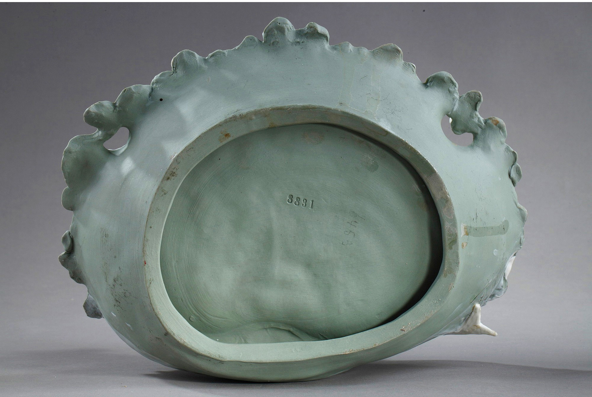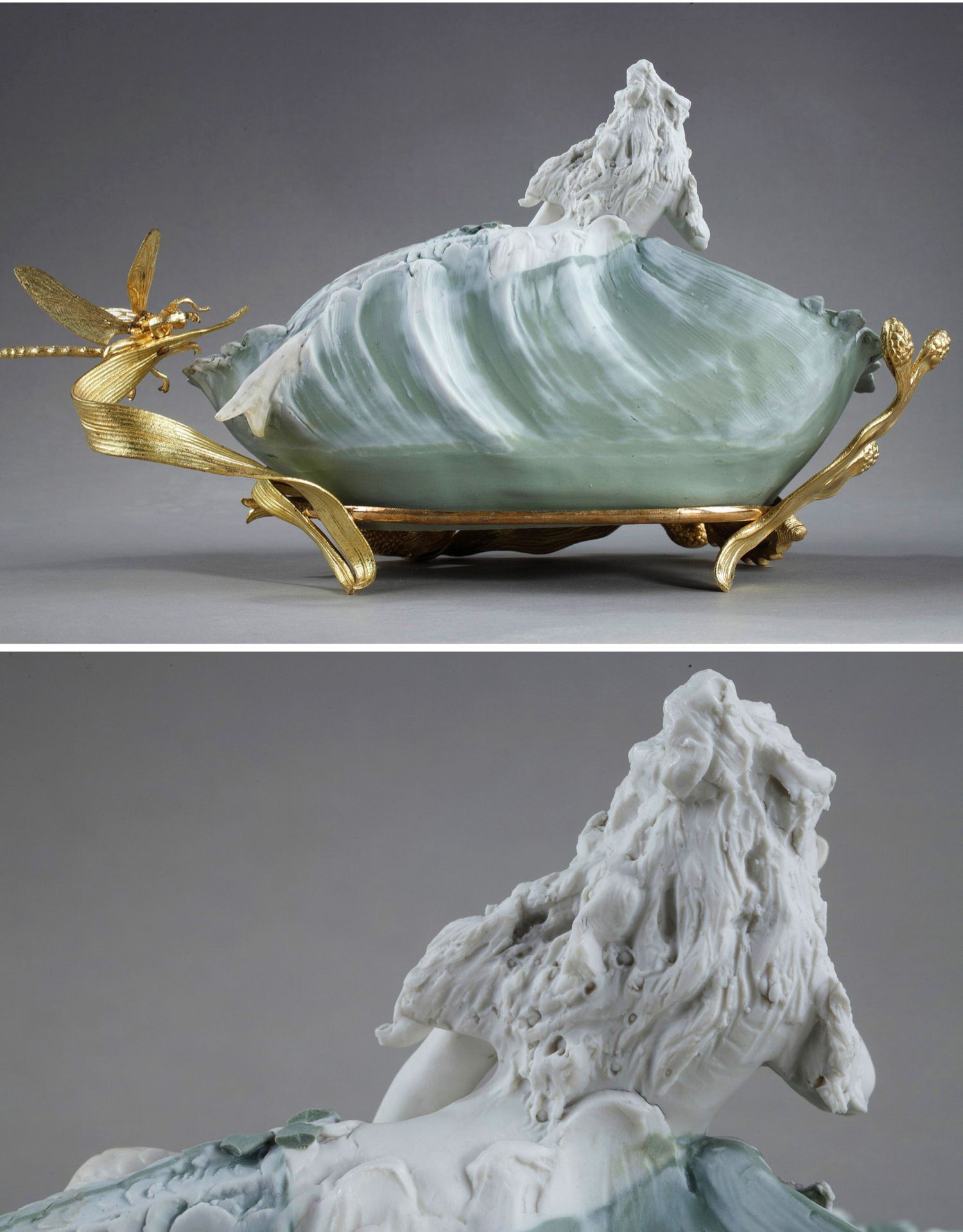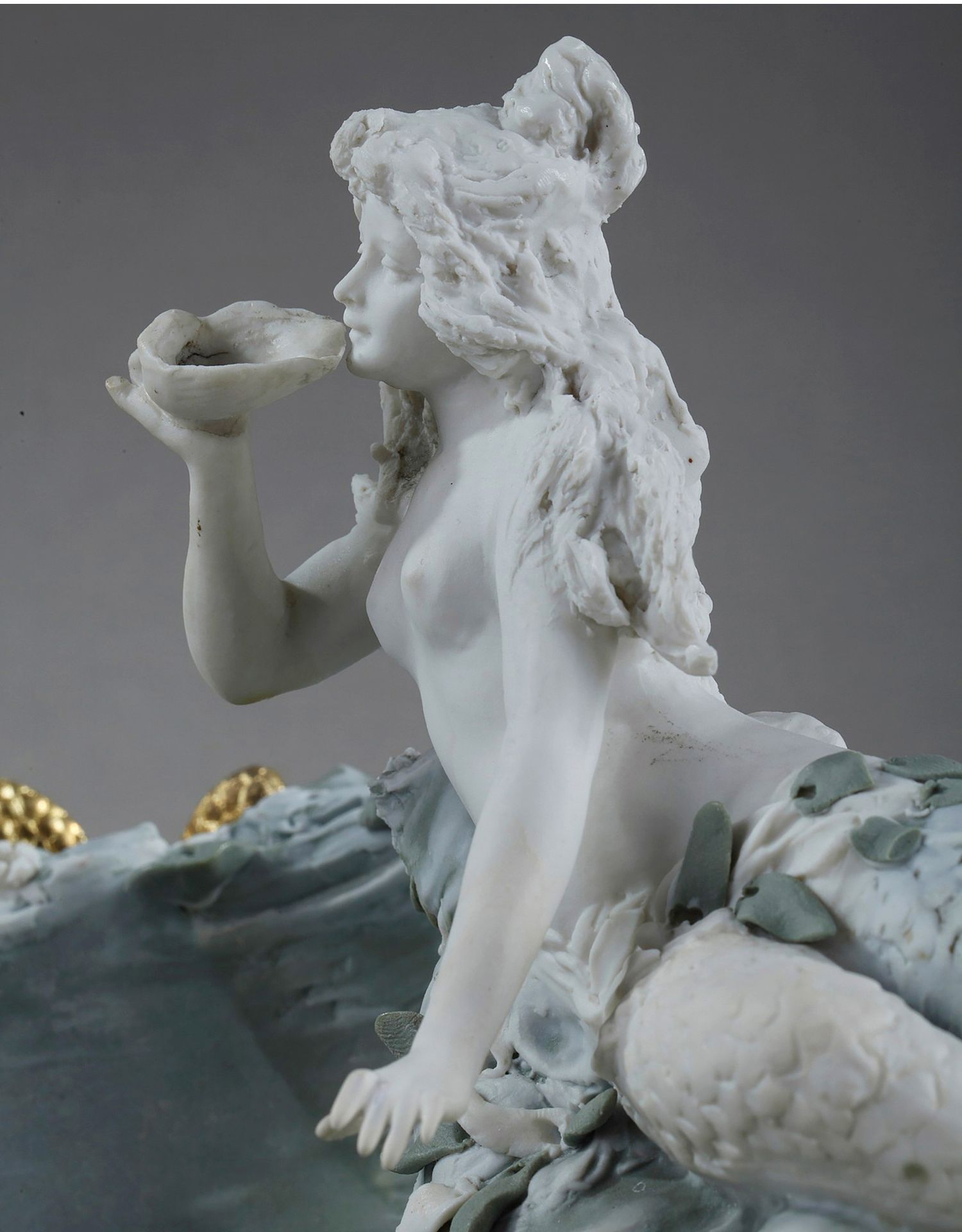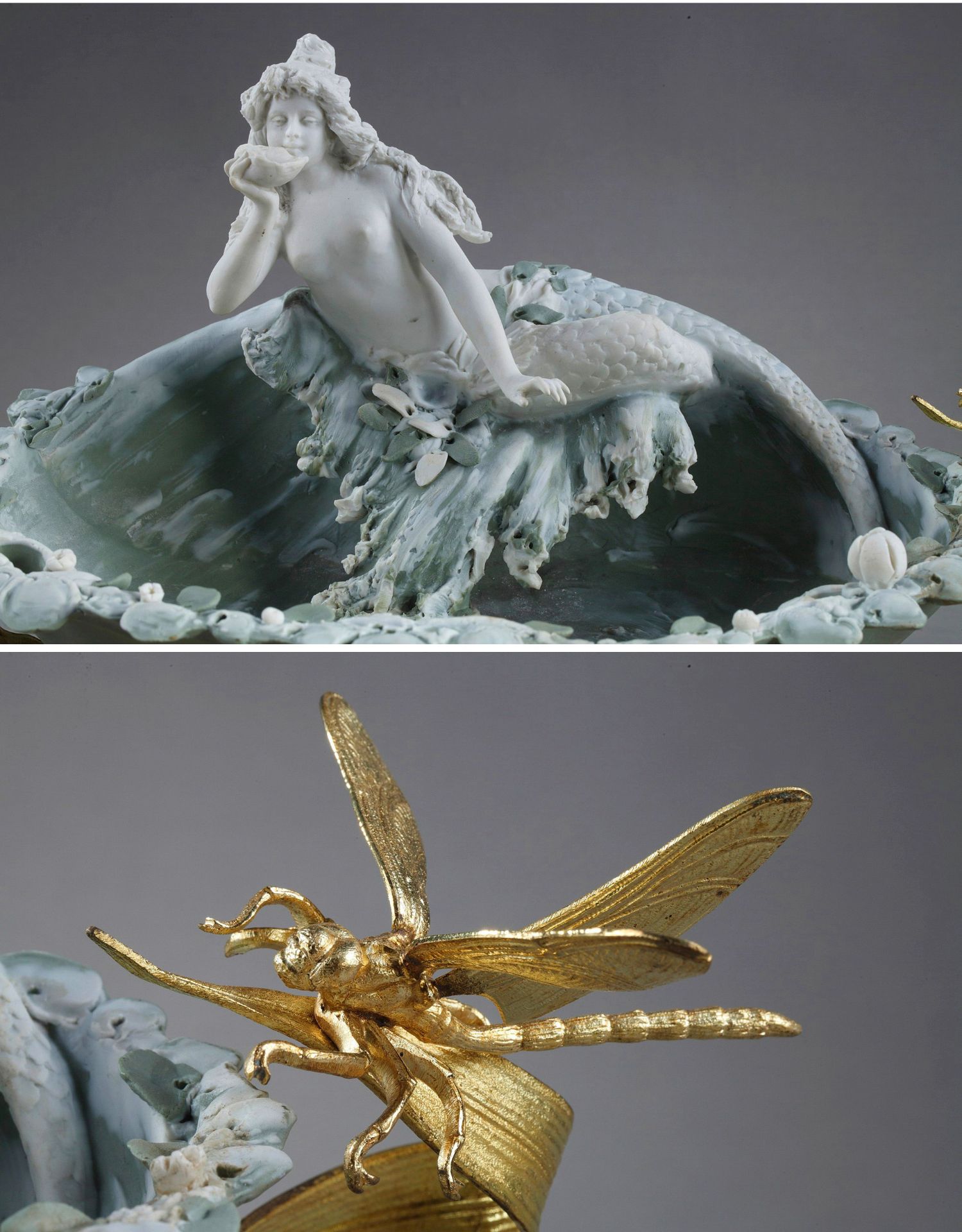独角鹿西洋古董摆件英国新艺术风格铜鎏金饰美人鱼主题素胎瓷盘