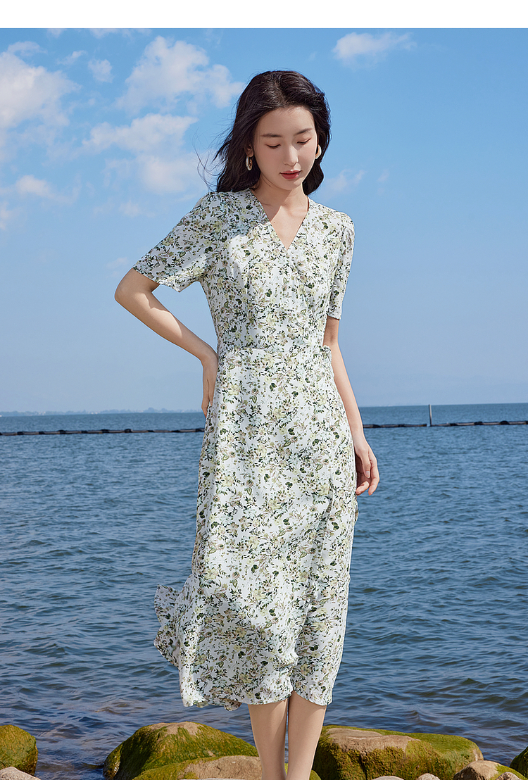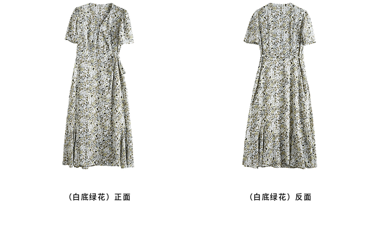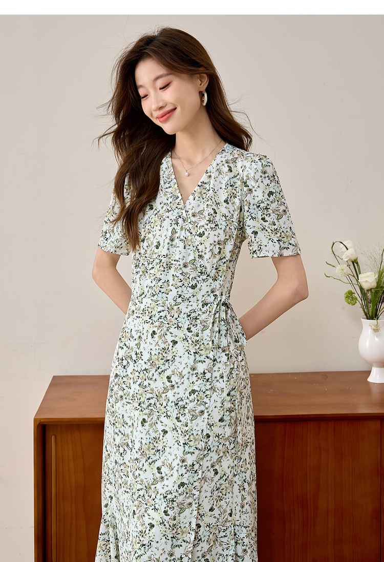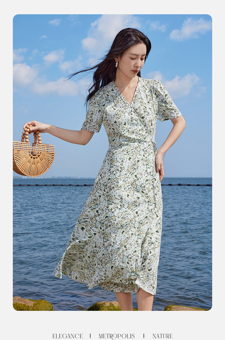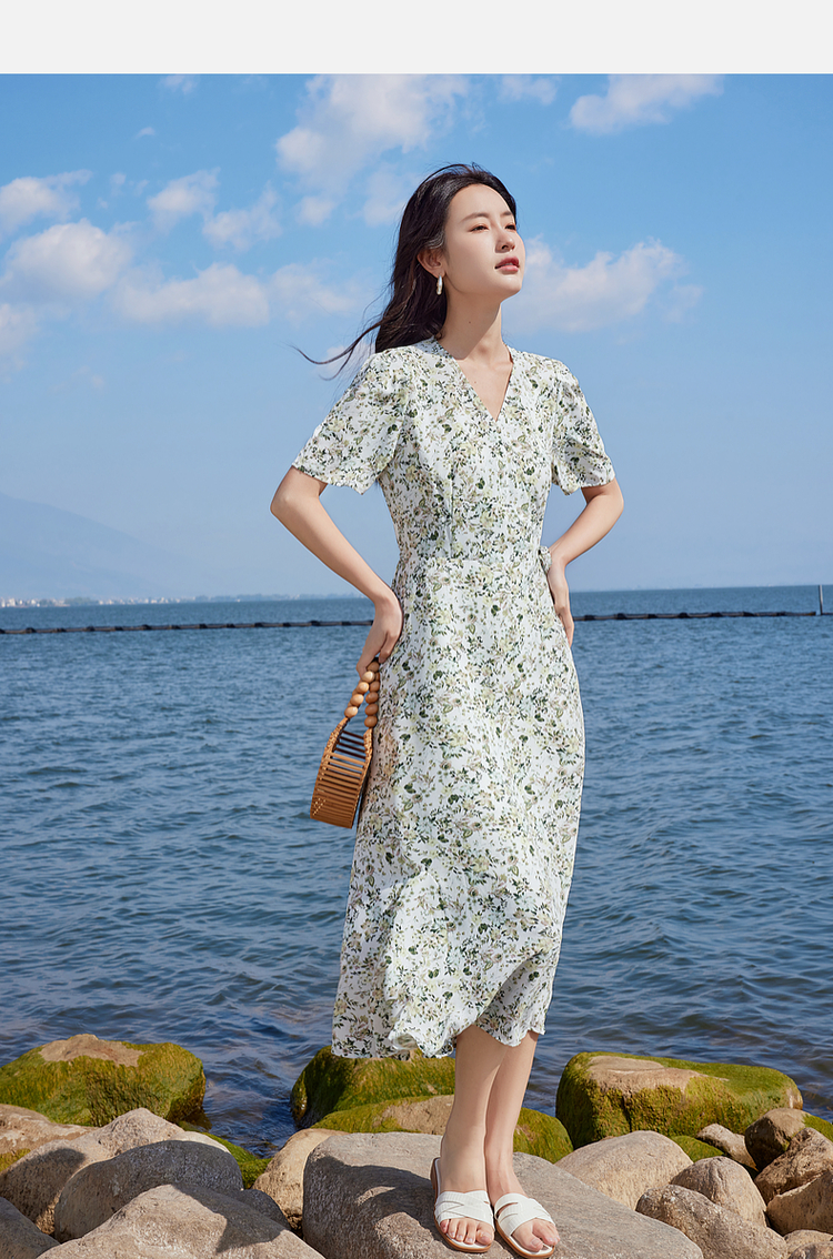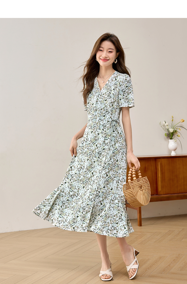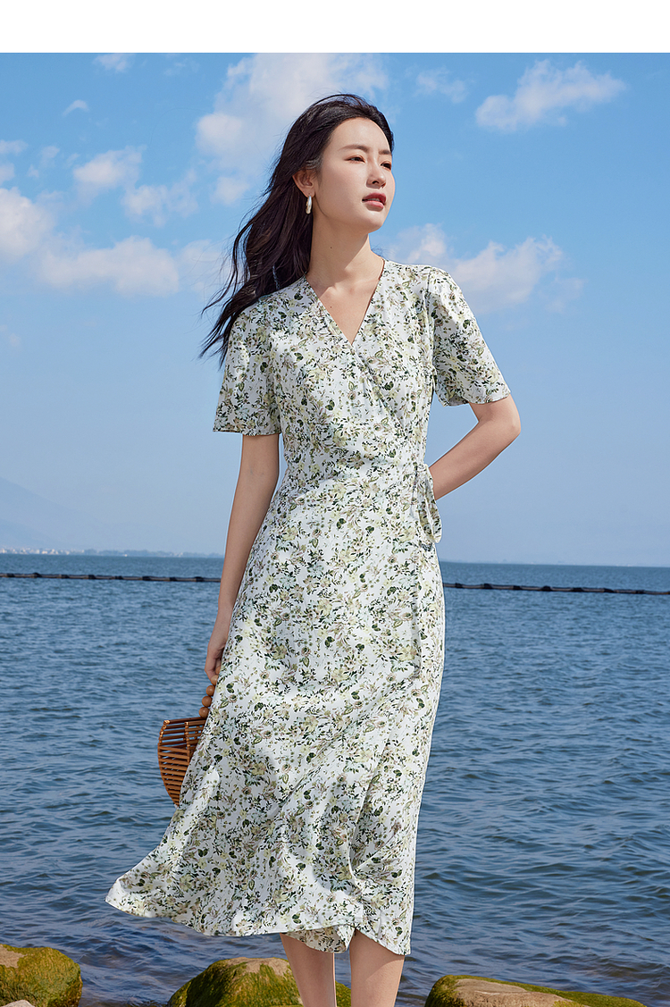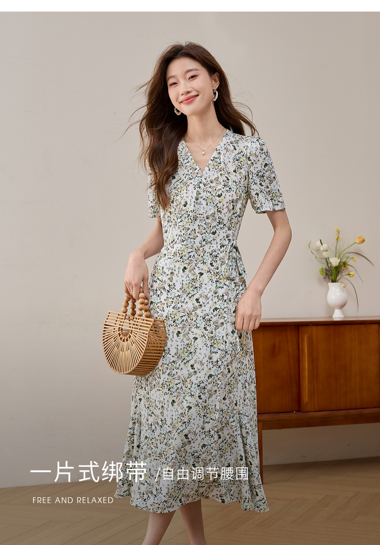 【专属特价】熙世界一片围裹式系带收腰气质碎花连衣裙夏季新款V领茶歇裙子