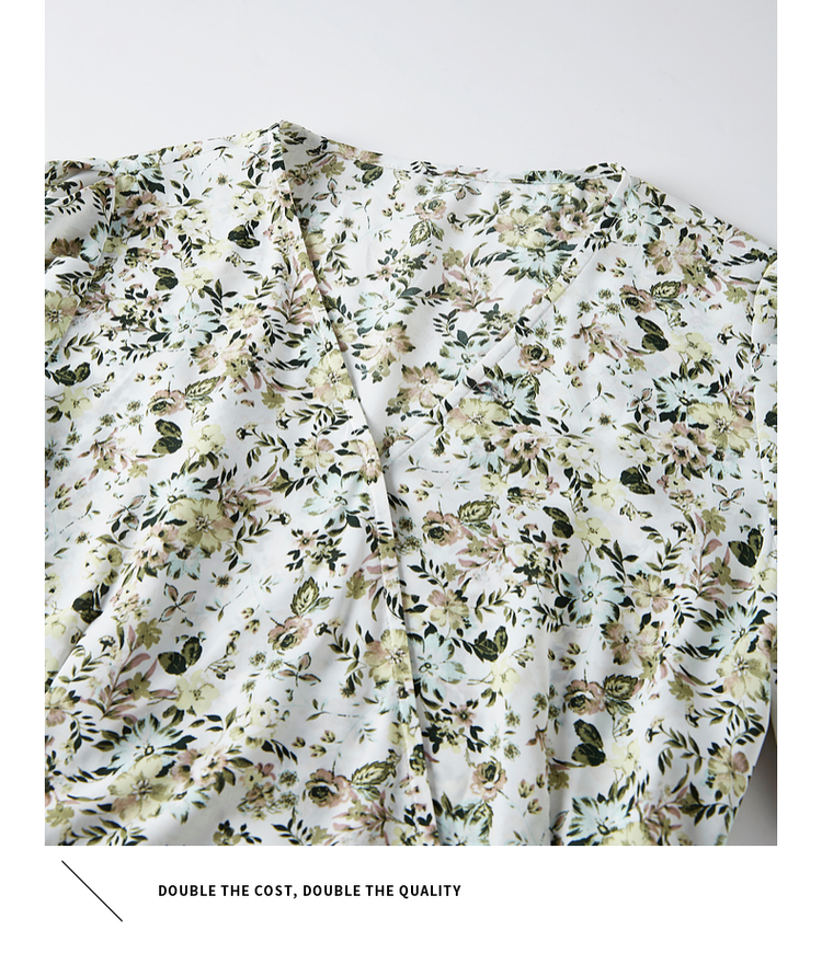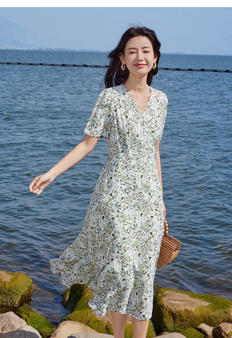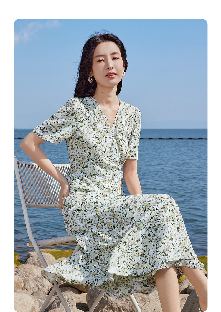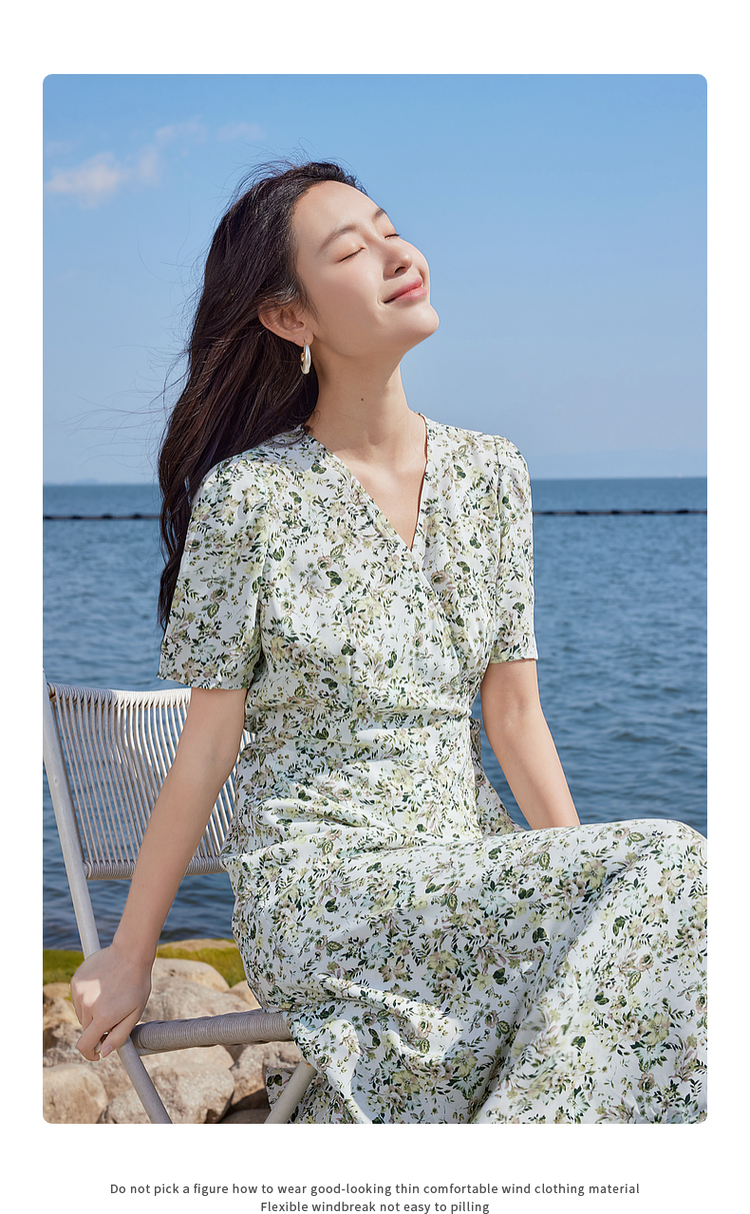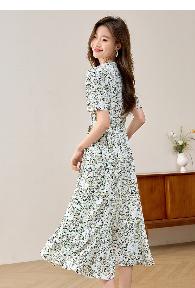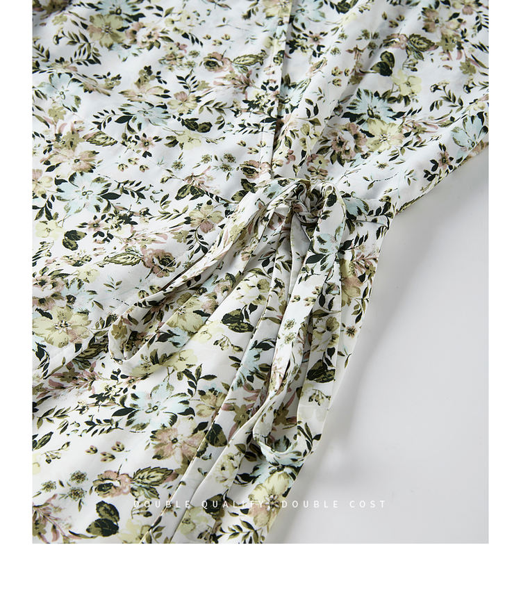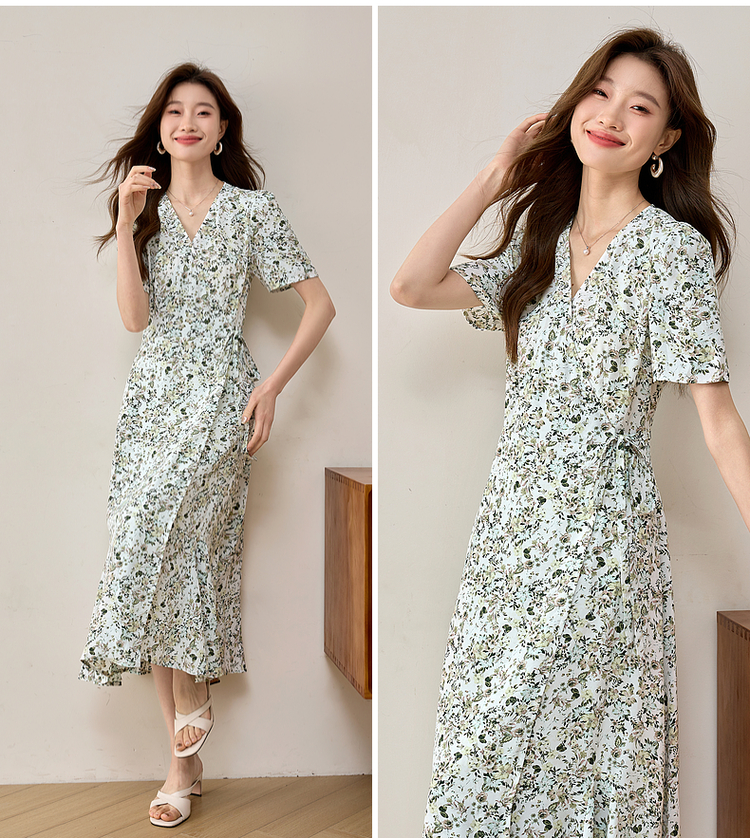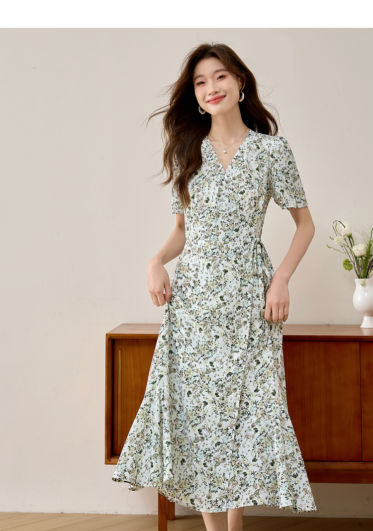 【专属特价】熙世界一片围裹式系带收腰气质碎花连衣裙夏季新款V领茶歇裙子