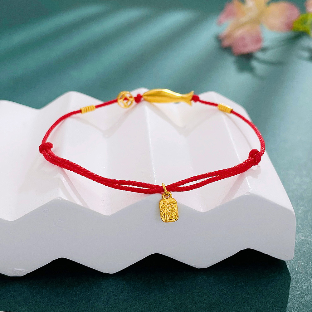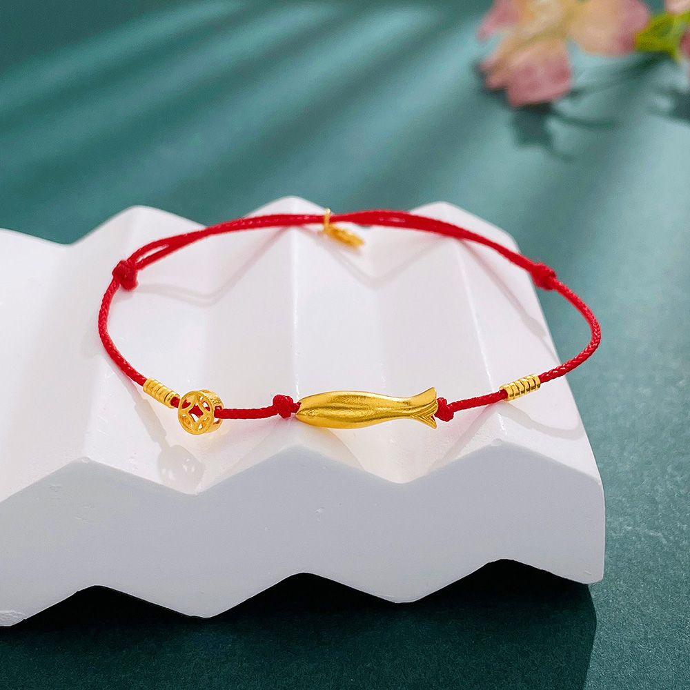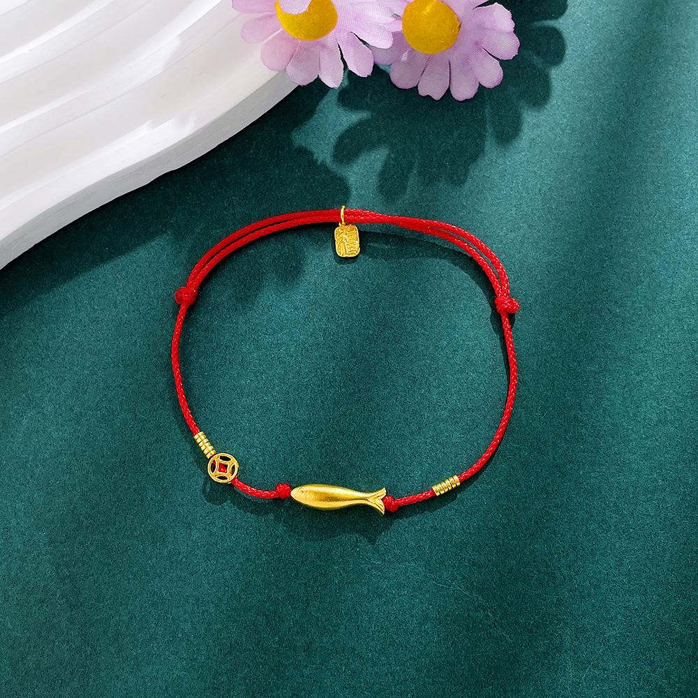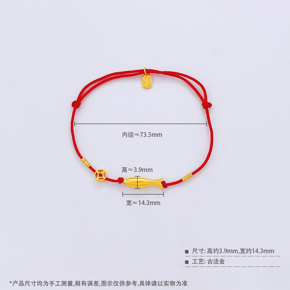 【限时克减150元】足金999 #复古风 古法空心福牌吊饰年年有余咬钱小金鱼碎金子转运红绳至简编织双向调节手链成品手串(AKGFSC00626)(预售产品下单后不退款不退货不换货不补差价)