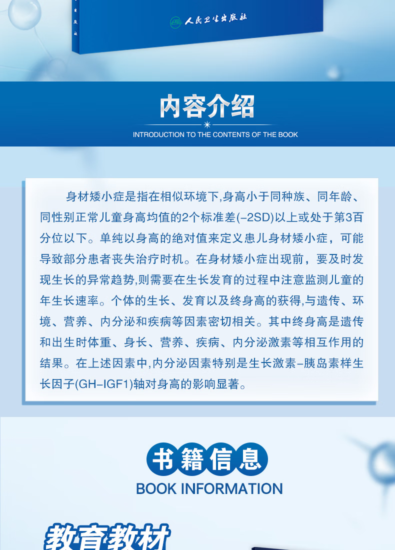 本书主要介绍矮身材的定义及分类、临床诊断、治疗和干预原则,常见矮身材疾病类型及临床诊治规范。本书为学术中心与中华医学会继续教育中心合作出版项目,该项目已经出版多部专著。本书内容为儿科领域热点之一,编写团队权威,具有儿科领域指导性。