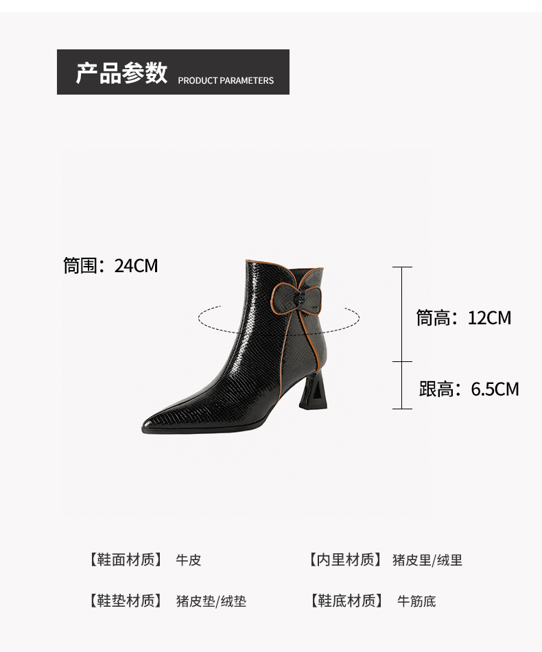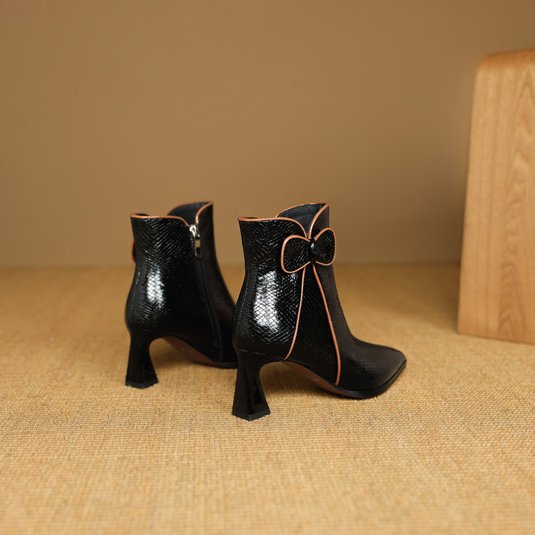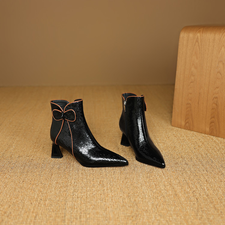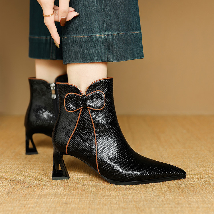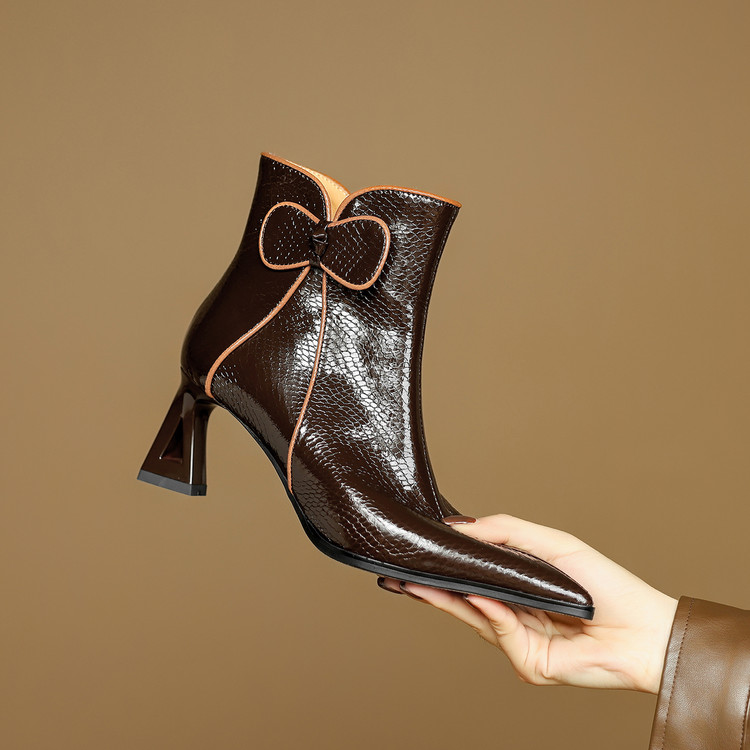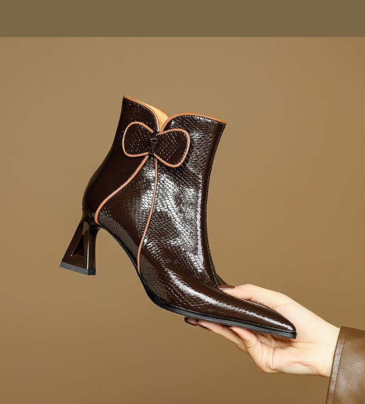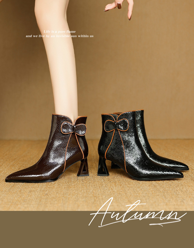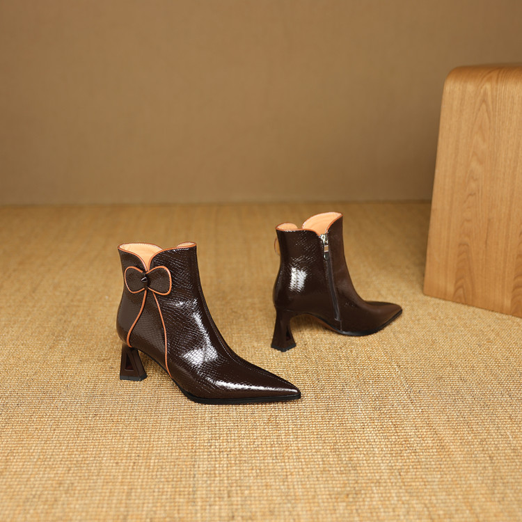 【预售5天】经典牛皮短靴女新款秋冬中跟单靴时尚蝴蝶结尖头洋气棕色皮靴DB&M6605