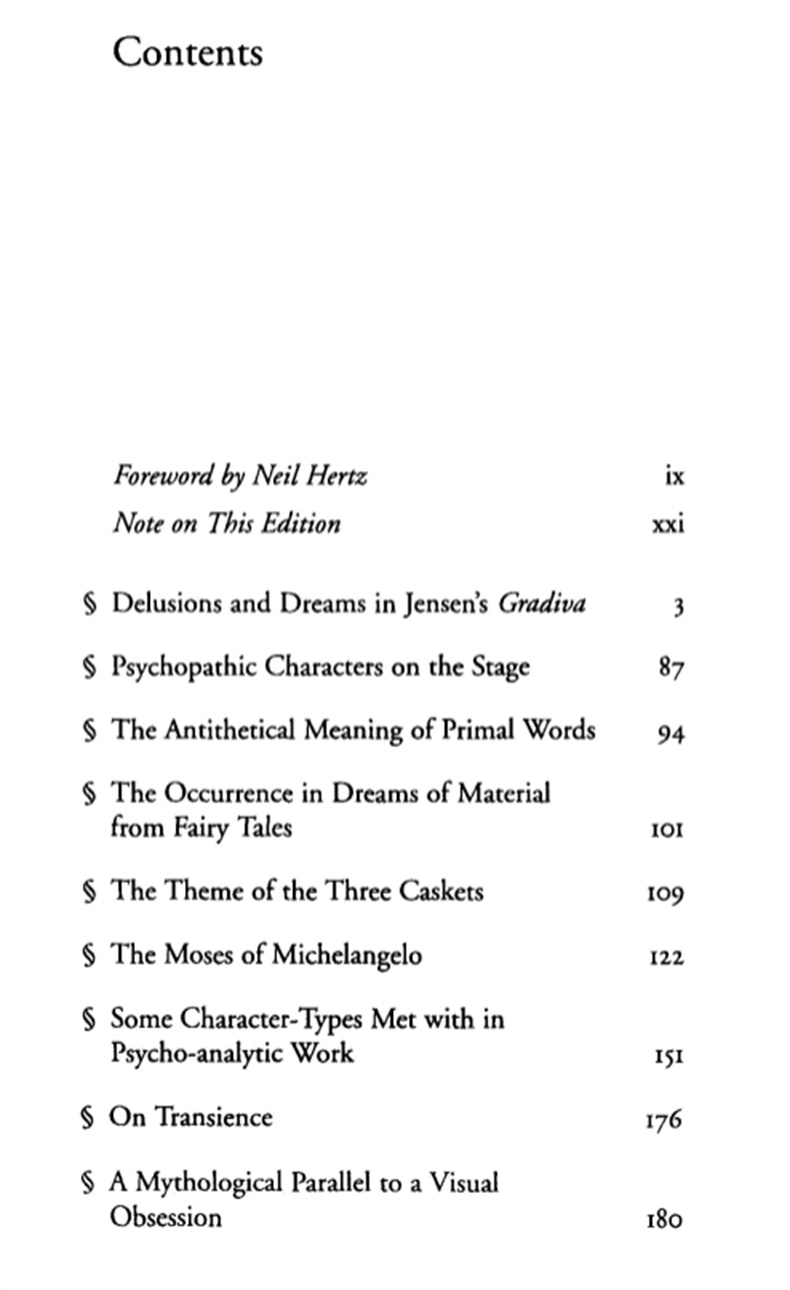 除了关于詹森的《Gradiva》和《Medusa》的著作外,还有以下文章。"原始词的反义词"、"童话故事中的素材在梦中的出现"、"三个匣子的主题"、"米开朗基罗的摩西。 "心理分析工作中遇到的一些角色类型","关于短暂性","视觉迷恋的神话学平行","Dichtung und Wahrheit中的童年回忆","不可思议","陀思妥耶夫斯基和弑君",以及 "歌德奖"。 "