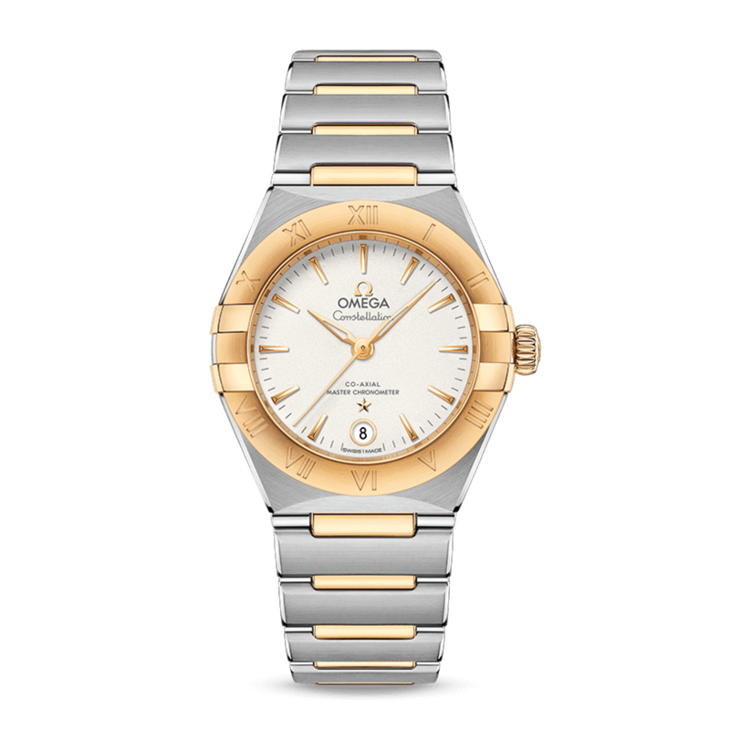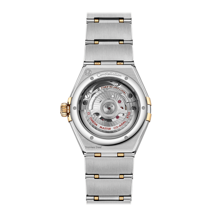 镜面材质 | 蓝宝石水晶玻璃 | 表盘 | 精钢黄色18K金与精钢表圈,星座系列特有的“托爪”设计。 黄色18K金与精钢打造,表圈镌刻罗马数字刻度,冰霜银表盘晶莹洁白,6点钟位置设有日历窗口。指针、欧米茄品牌标识、星座徽标以及小时刻度亦以黄色18K金打造而成。 透底 |