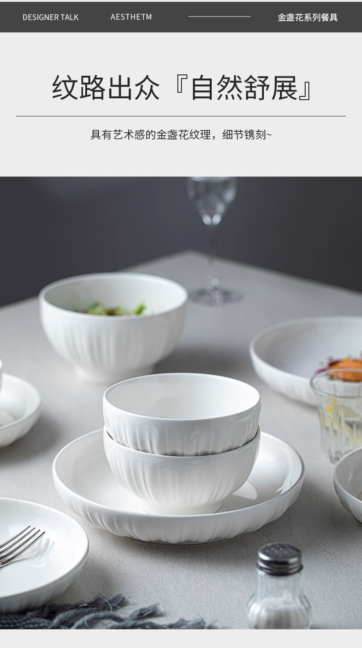✅1380℃+高温烧制,耐高温耐瞬时温差,可直接送进微波炉/烤箱/蒸锅/消毒柜/空气炸锅热环境使用 ✅优级原生态高岭土原料,釉色光洁自然,莹白温润,轻松易洗 ✅釉下彩白瓷,不褪色不掉色,无铅镉无有害重金属,安全健康可放心使用 ✅外壁金盏花立体浮雕纹理,大方简约 极具艺术美感 ✅瓷质厚实,端拿不烫手、耐磨耐用;中高足底,防滑隔热 不烫桌面