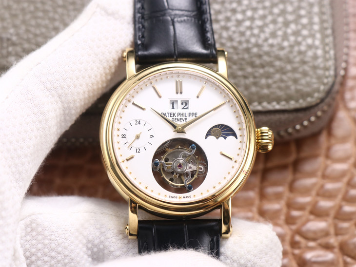 [AX]百达翡丽(大日期顯示)。(GMT显示)[拳头]月相星辰顶级手动同轴陀飞轮机芯 原装折叠扣Lin手动上链机械!雕花透底,316钢壳 烧钢蓝指针,直径42mm.厚度12.5mm,42小時储蓄动力双面蓝宝石玻璃 意大利真皮原装蝴蝶扣