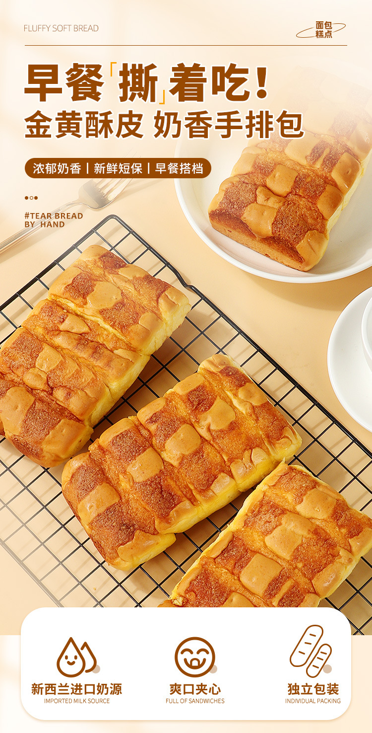 【早餐“撕”着吃!奶香手排包】手撕面包吐司软面包,金黄酥皮浓郁奶香口感绵密细腻,早餐代餐美味下午茶零食休闲零食品