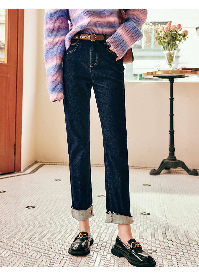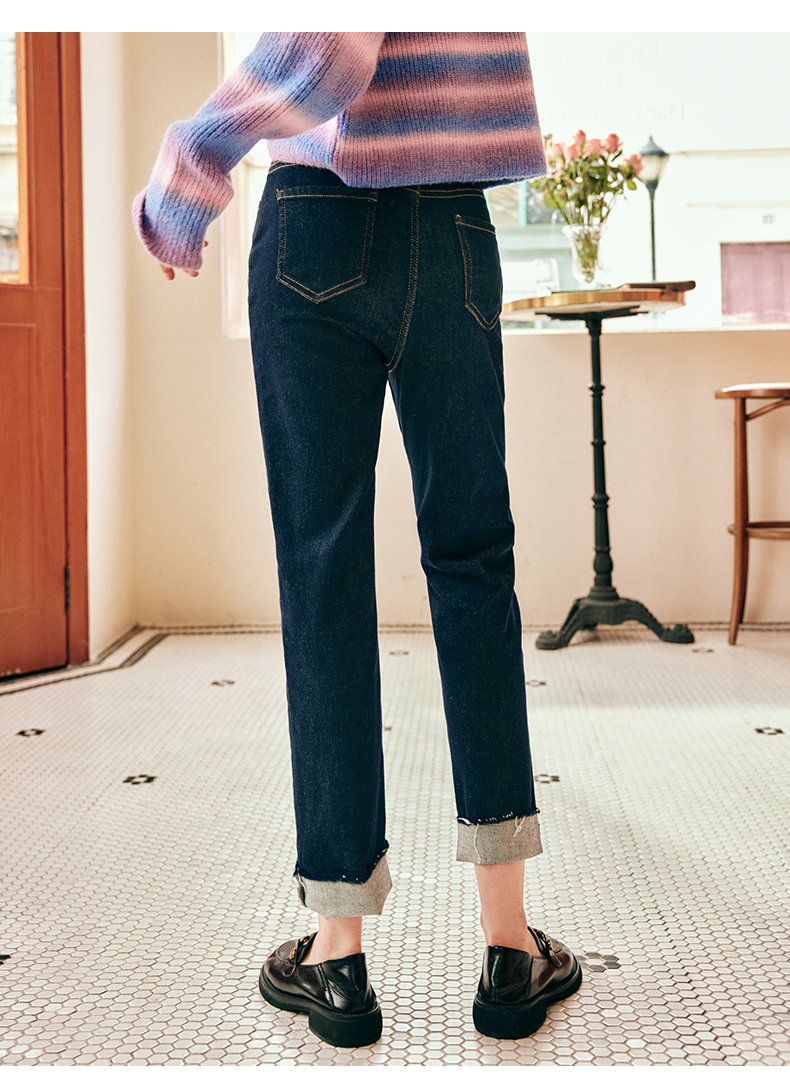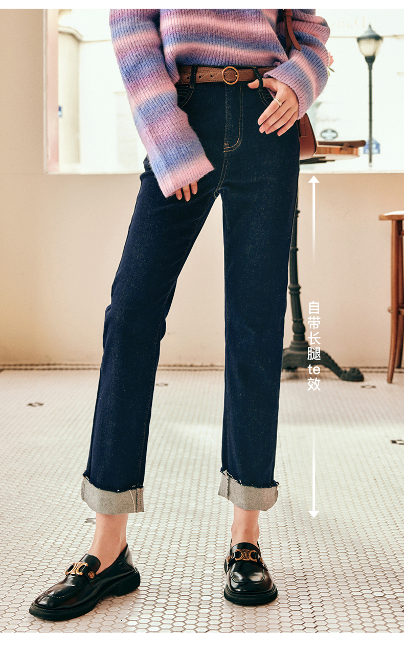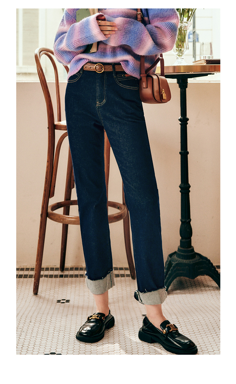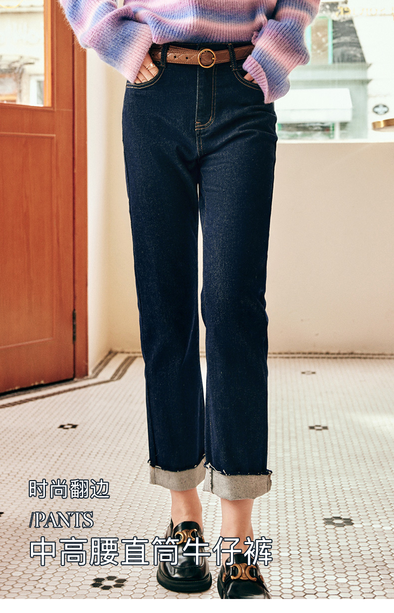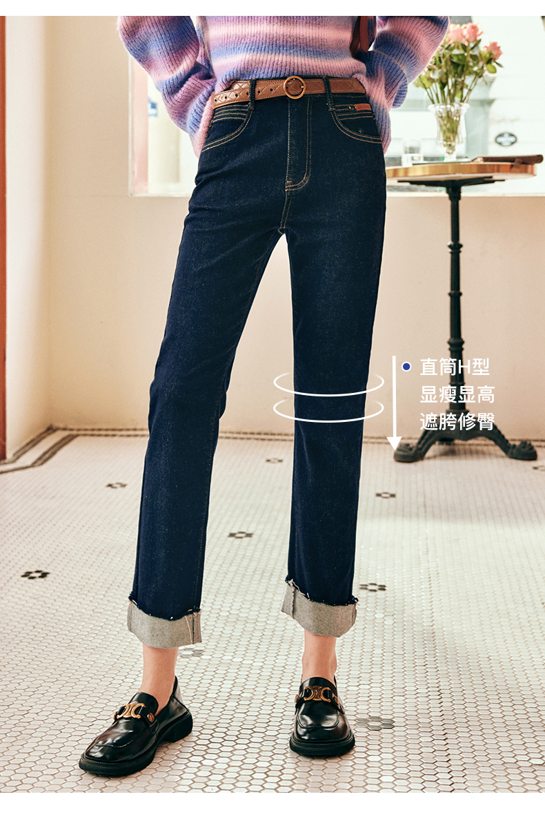 OLrain欧芮儿法式深色牛仔裤女秋冬2022年新款高腰直筒翻边阔腿裤