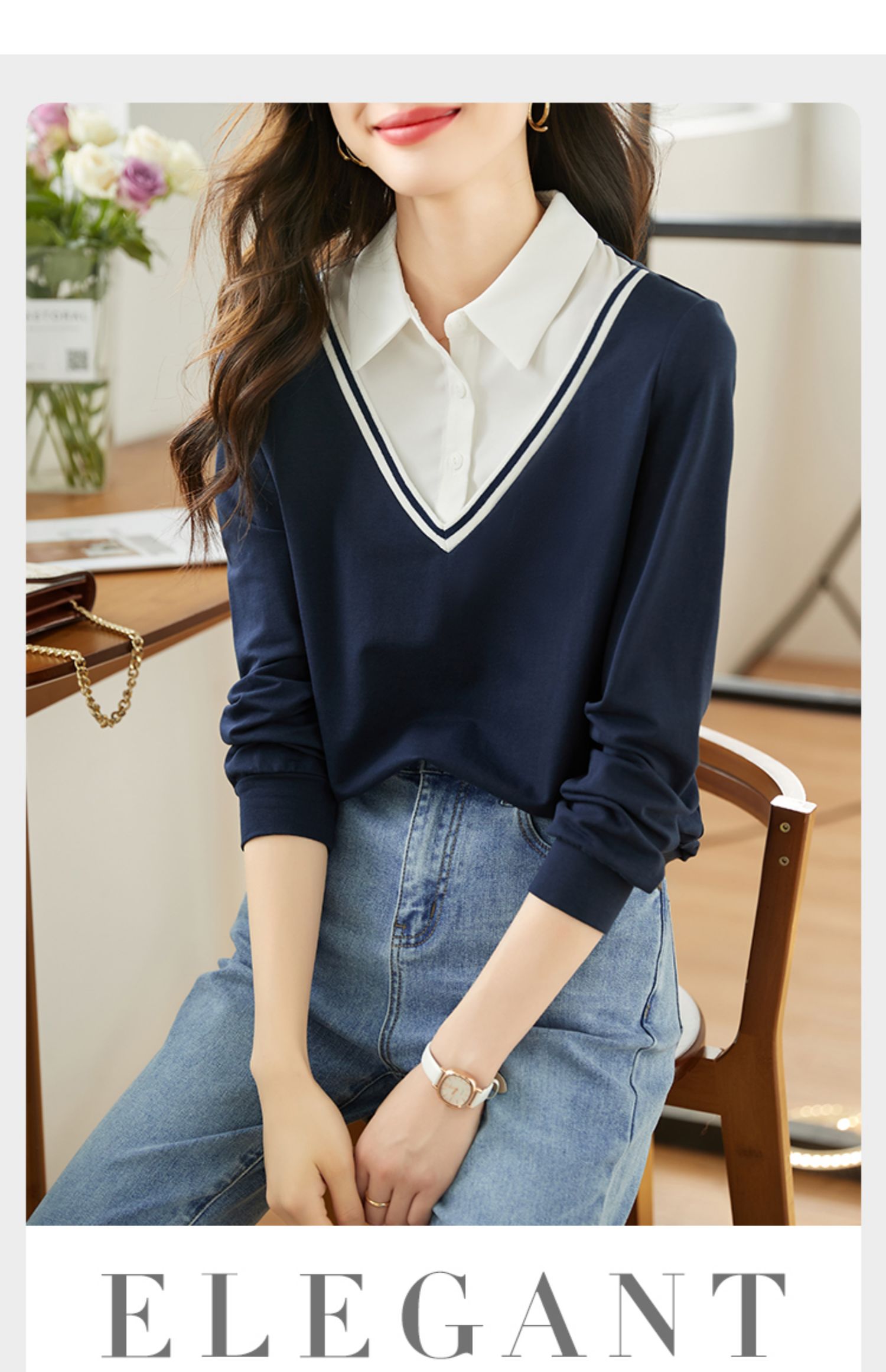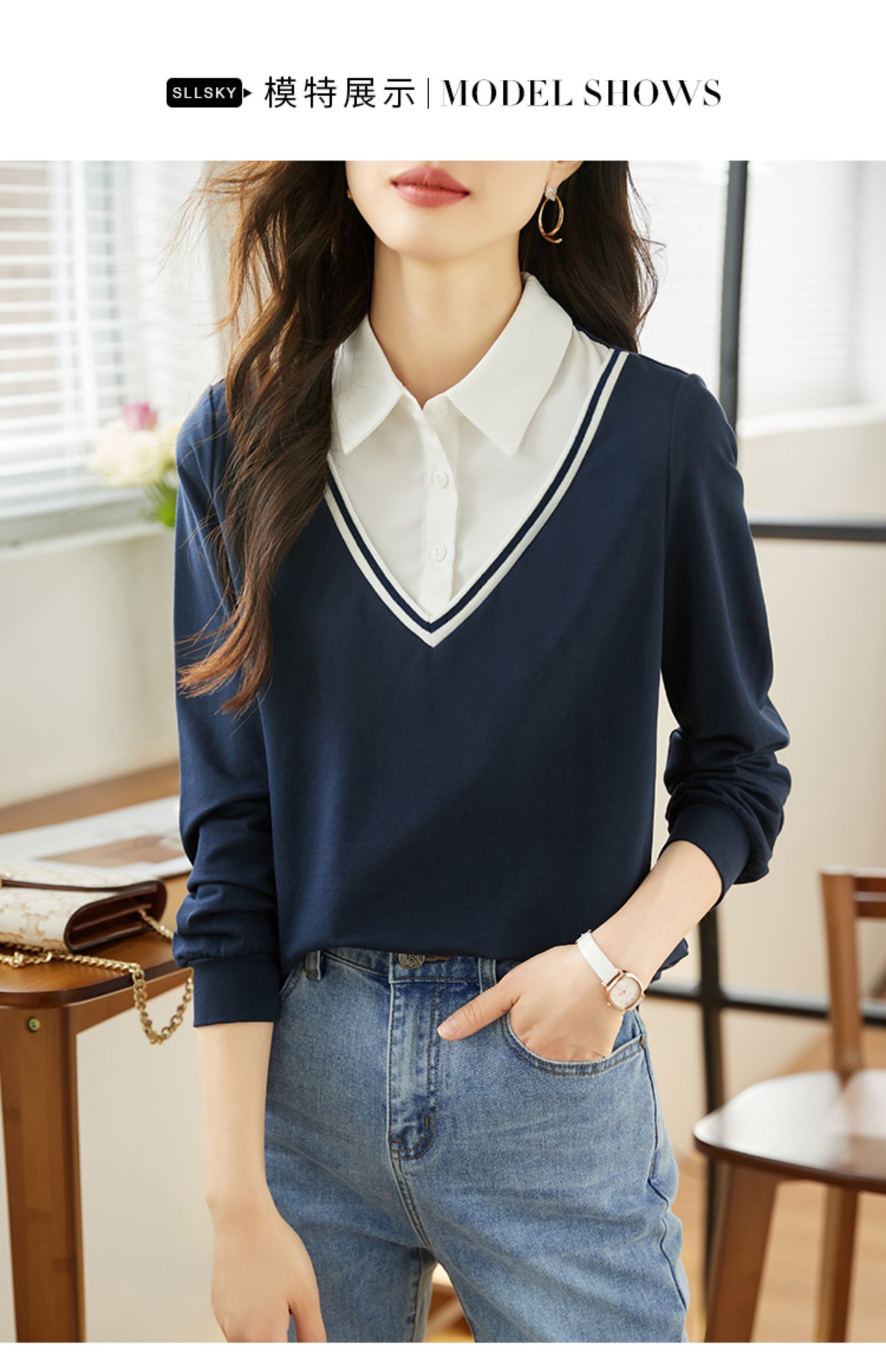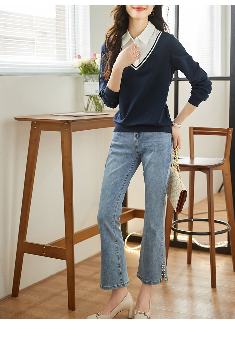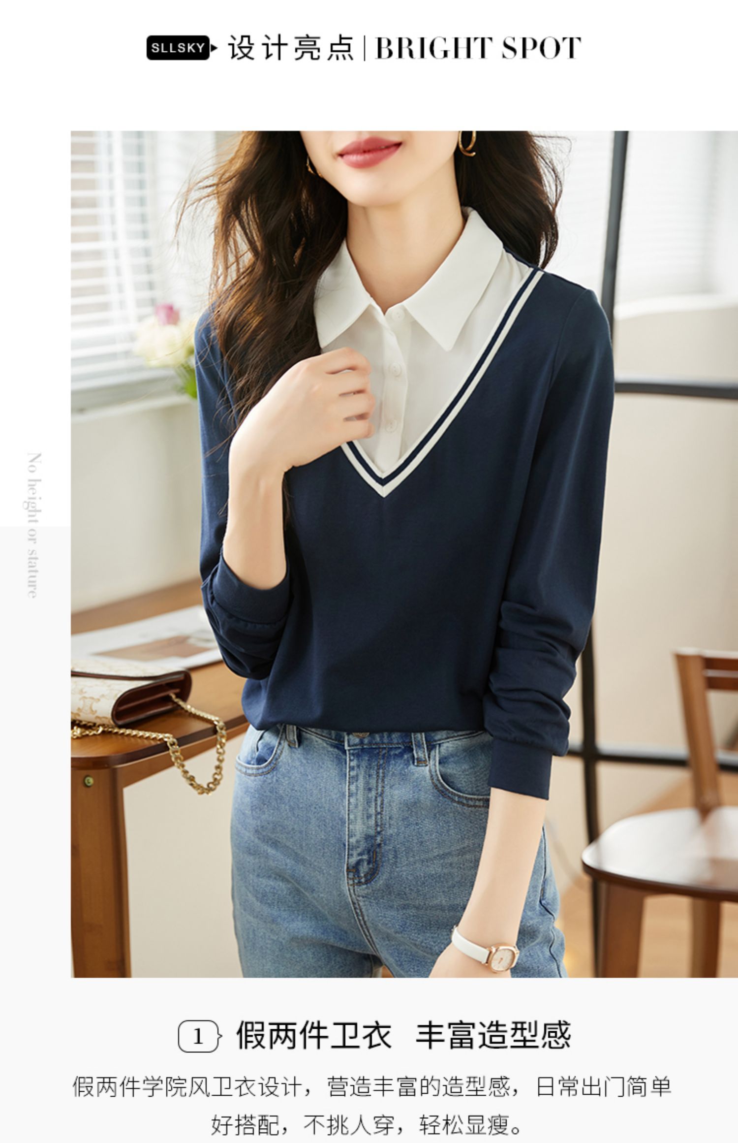 【59元福袋不支持退换】熙世界秋装新款学院文艺风衬衫翻领上衣拼接长袖假两件卫衣女