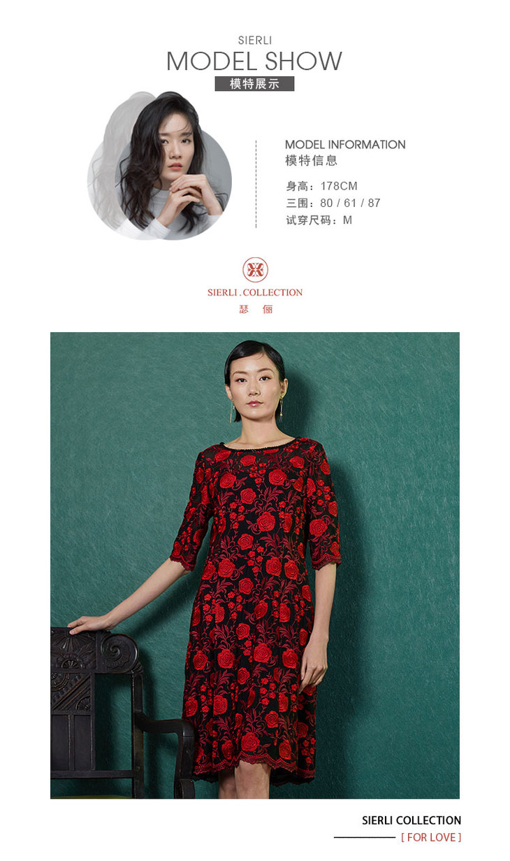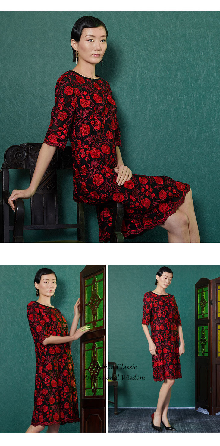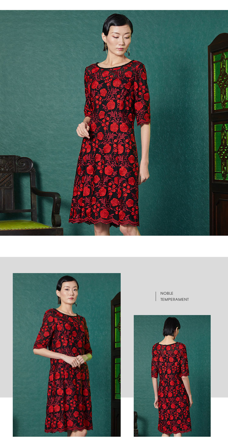 QG8A1夏季新品丝质数码印花钉珠中款宽松蕾丝长袖连衣裙