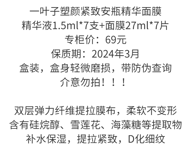 【爆款超低价预售 急单慎拍】24.3月临期 一叶子塑颜安瓶面膜7片装小V脸提拉紧致D化细纹精华液