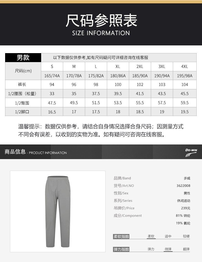 多威(Do-win)运动裤男士弹力休闲裤冰感针织长裤3622008
