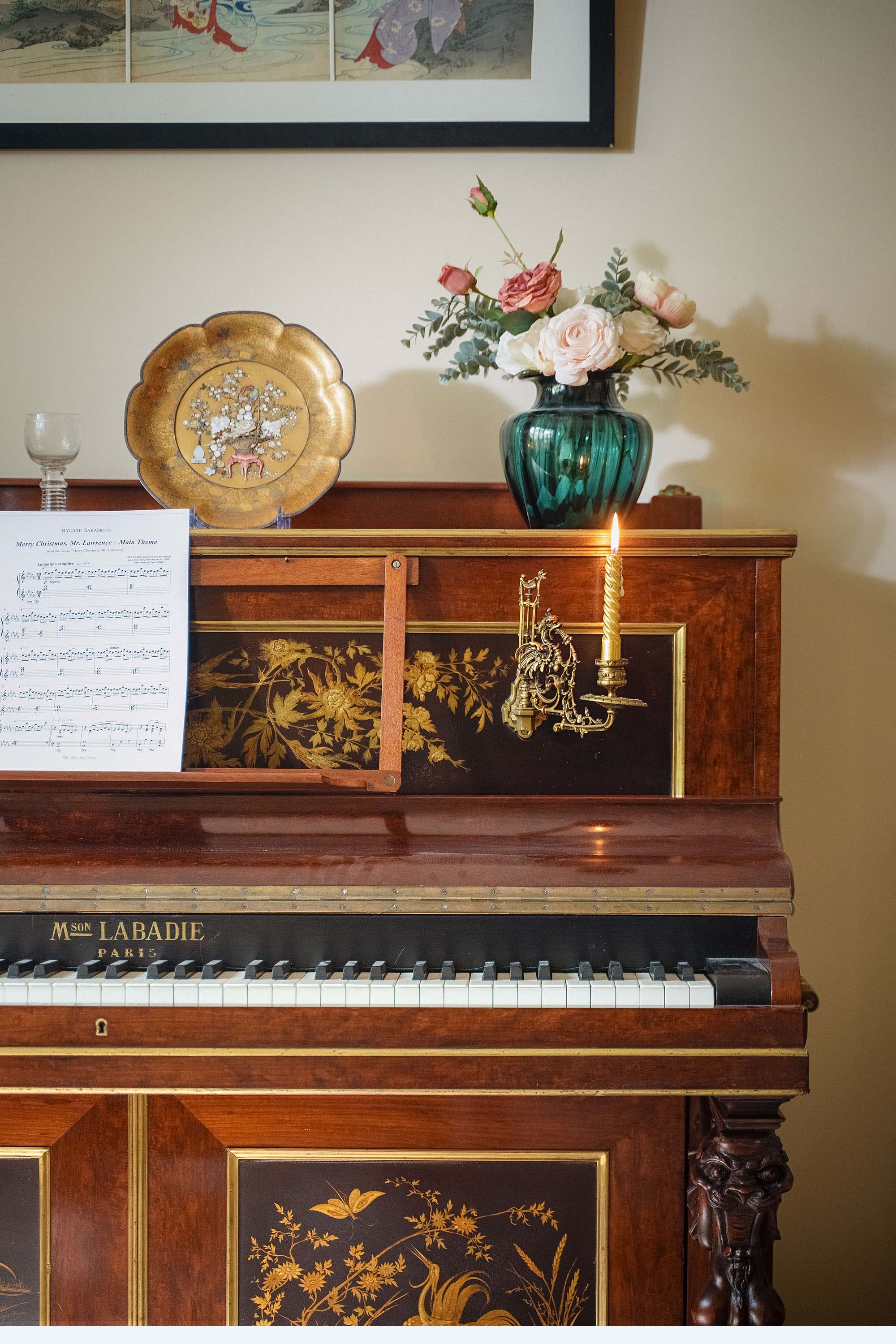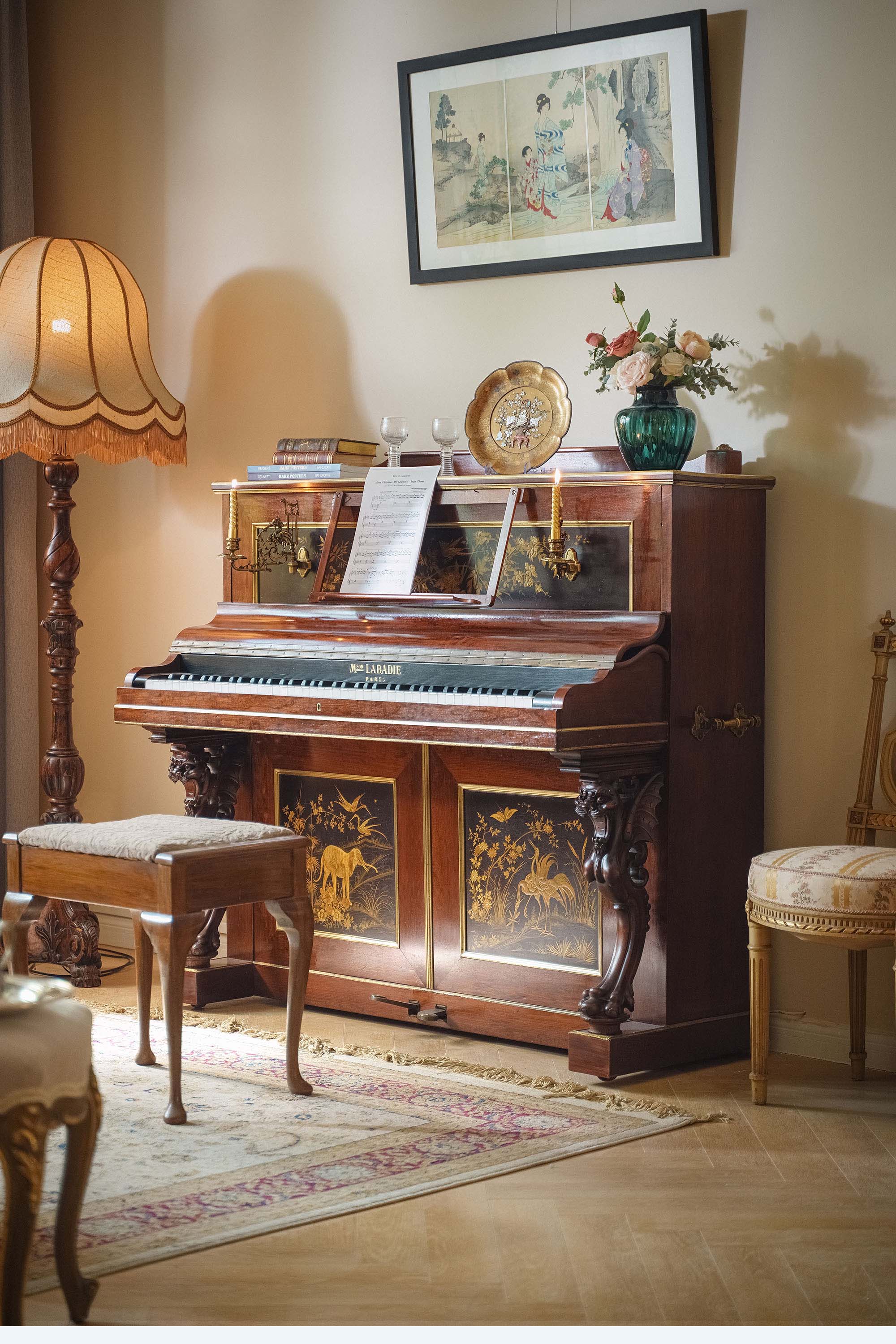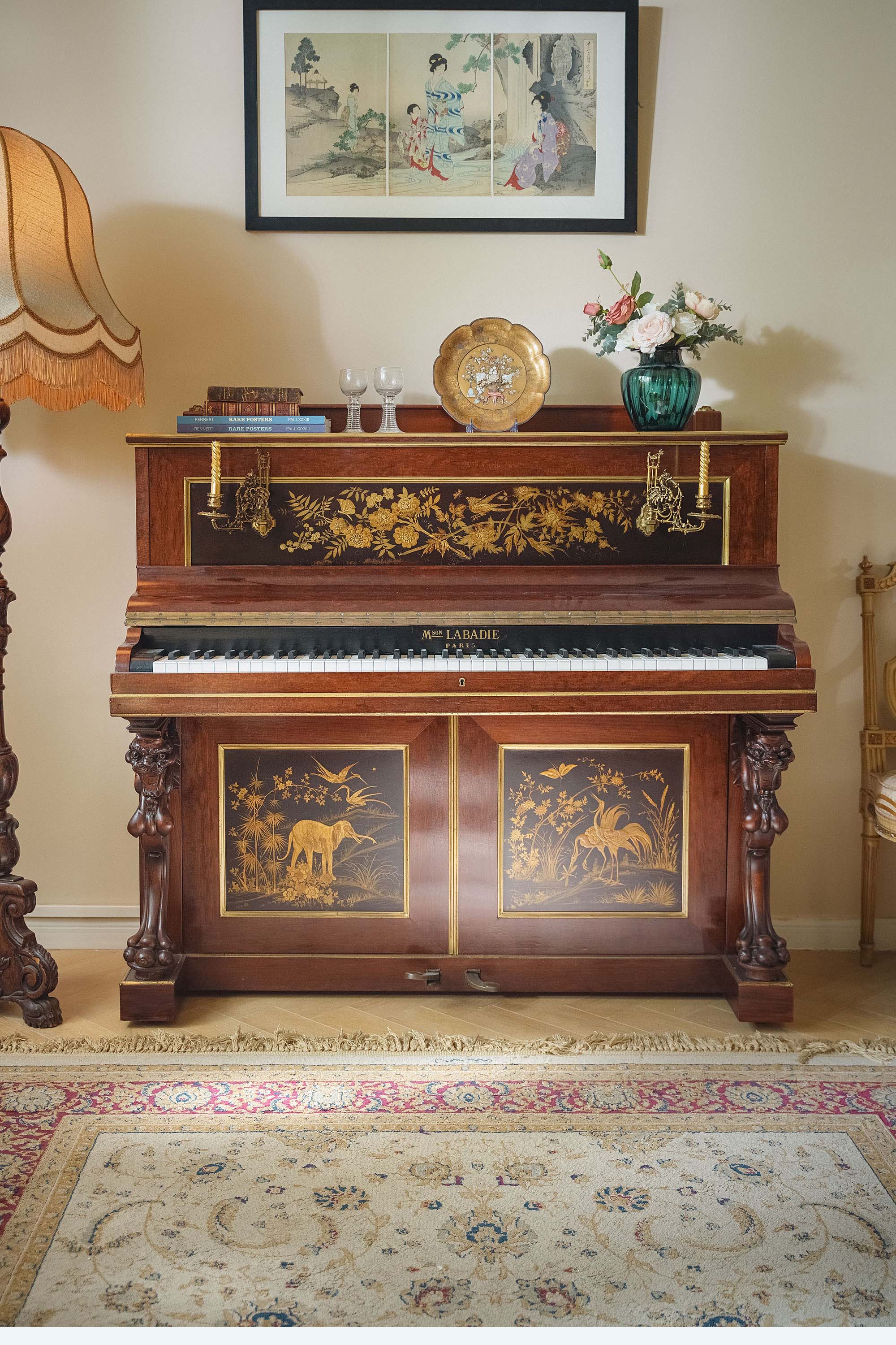 独角鹿西洋古董1890年代法国LABADIE PARIS签名出品东方风格铜鎏金烛台嵌象鹭花鸟纹莳绘漆画装饰瑞兽主题实木精雕立式钢琴