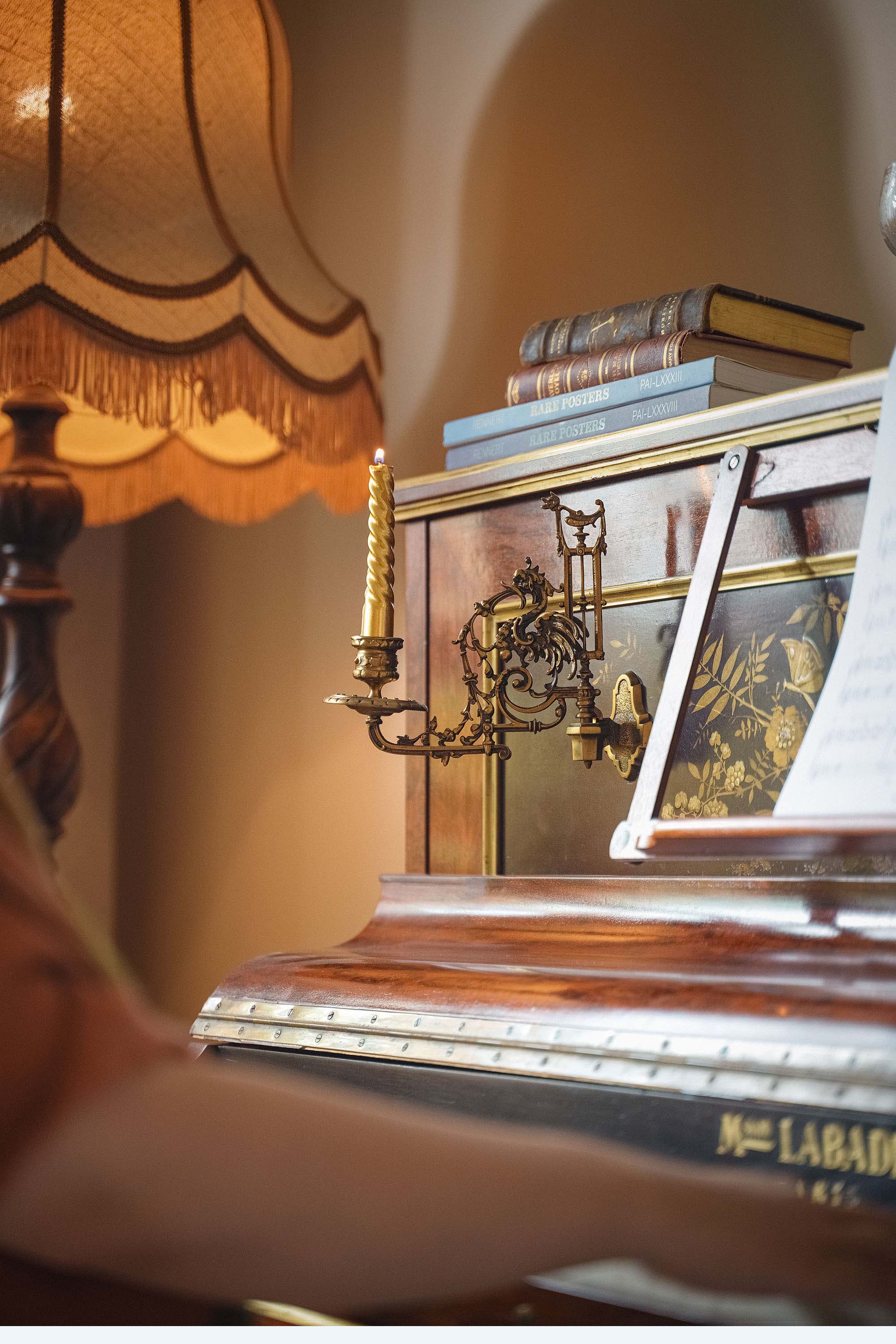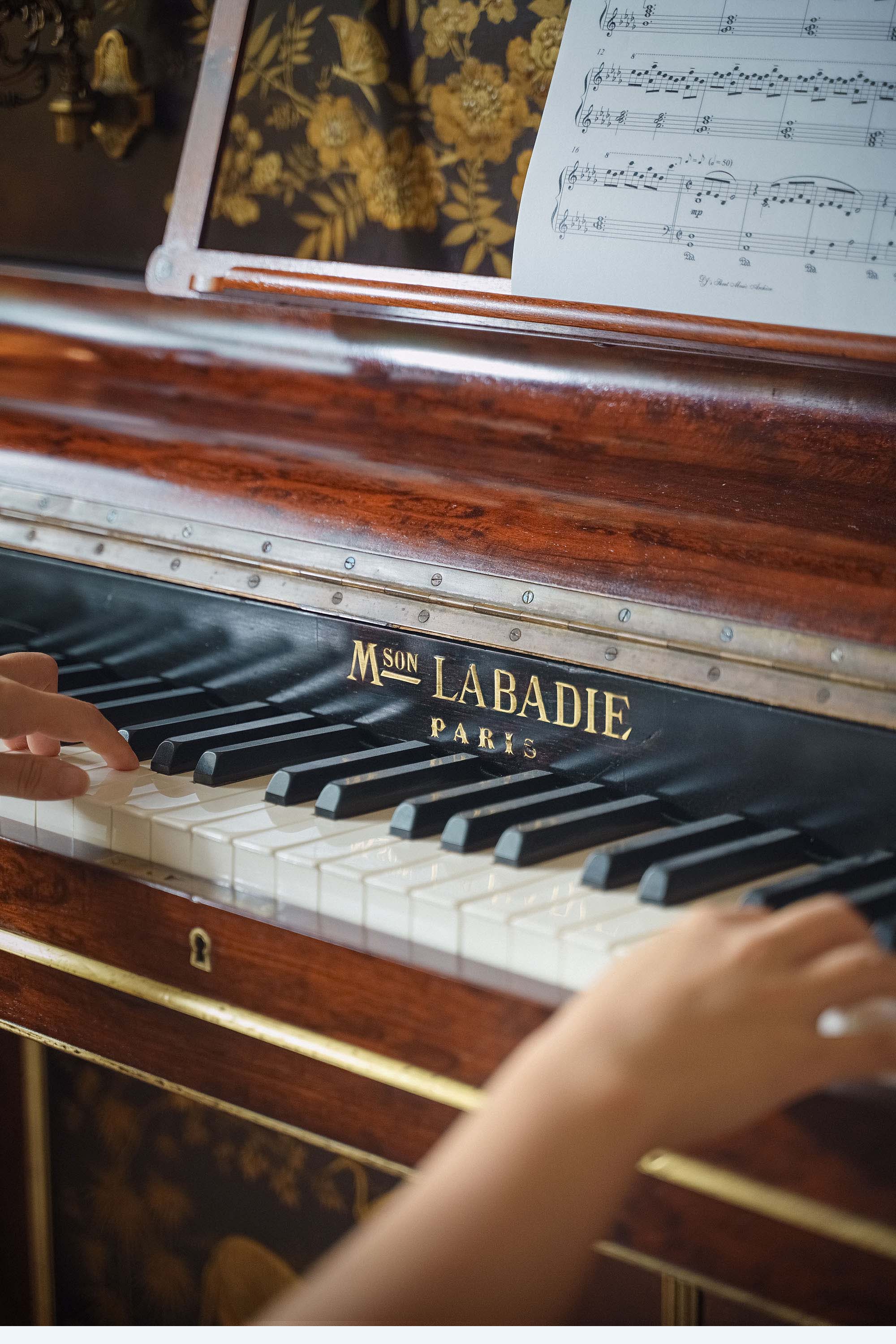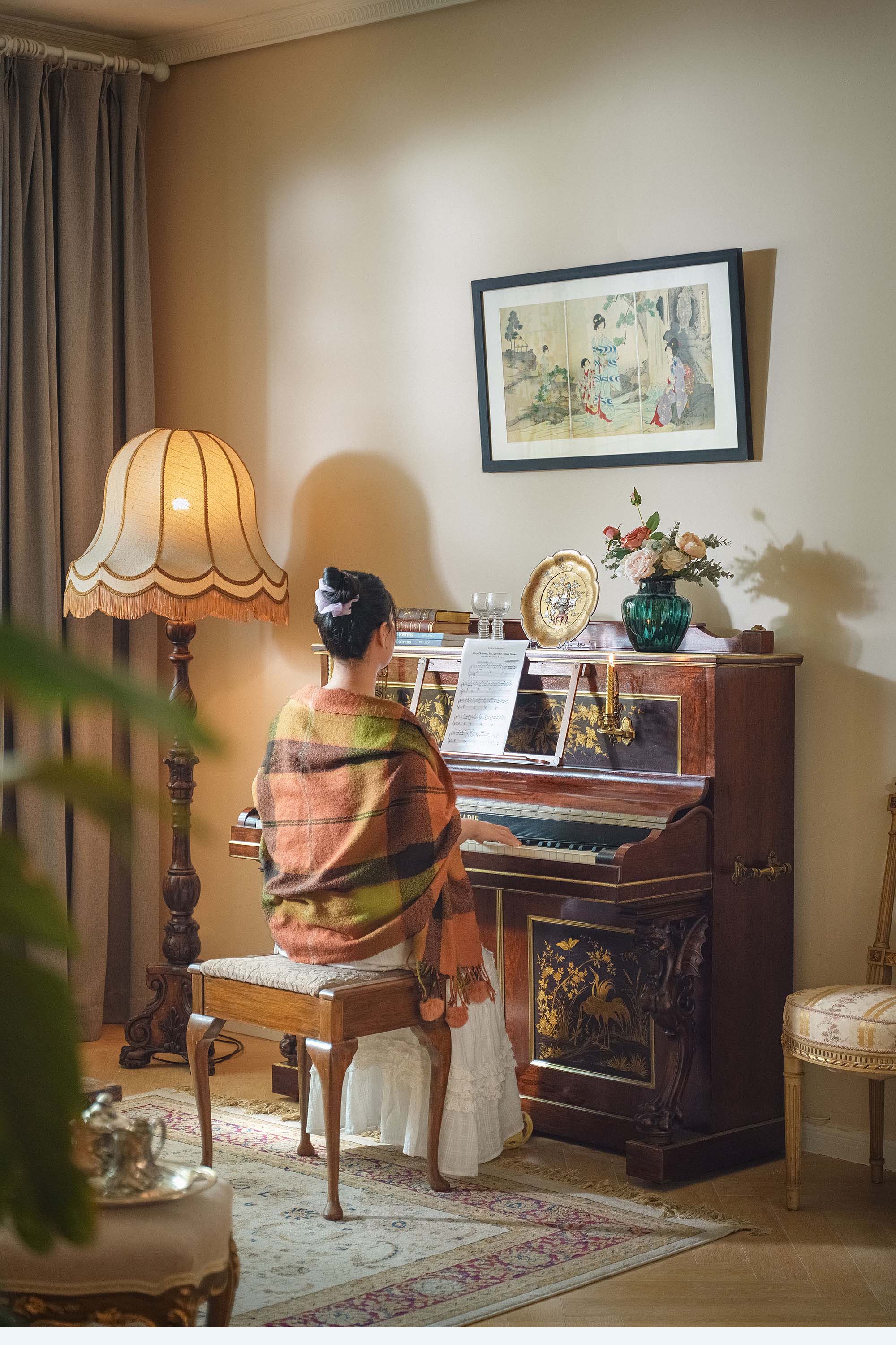 独角鹿西洋古董1890年代法国LABADIE PARIS签名出品东方风格铜鎏金烛台嵌象鹭花鸟纹莳绘漆画装饰瑞兽主题实木精雕立式钢琴