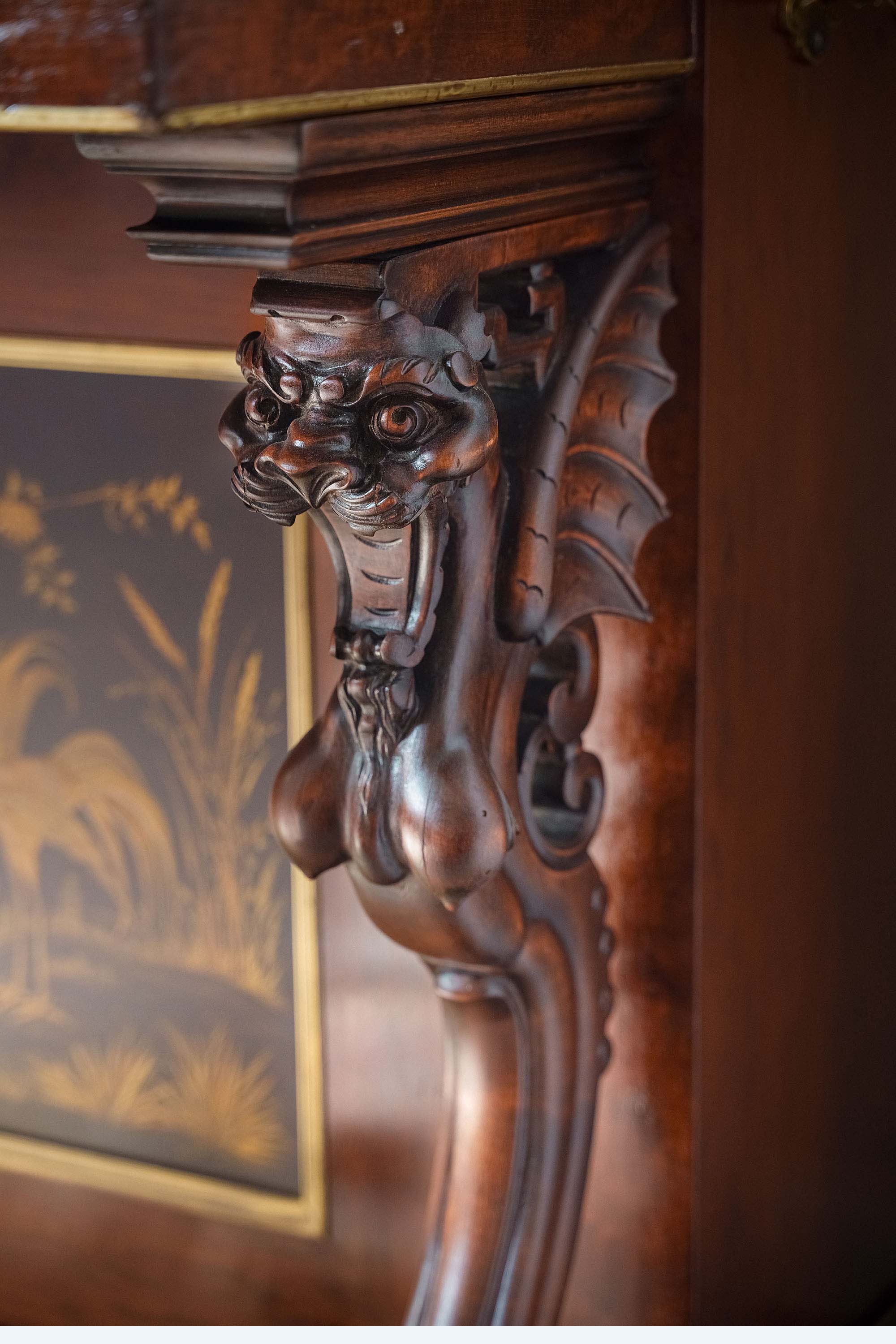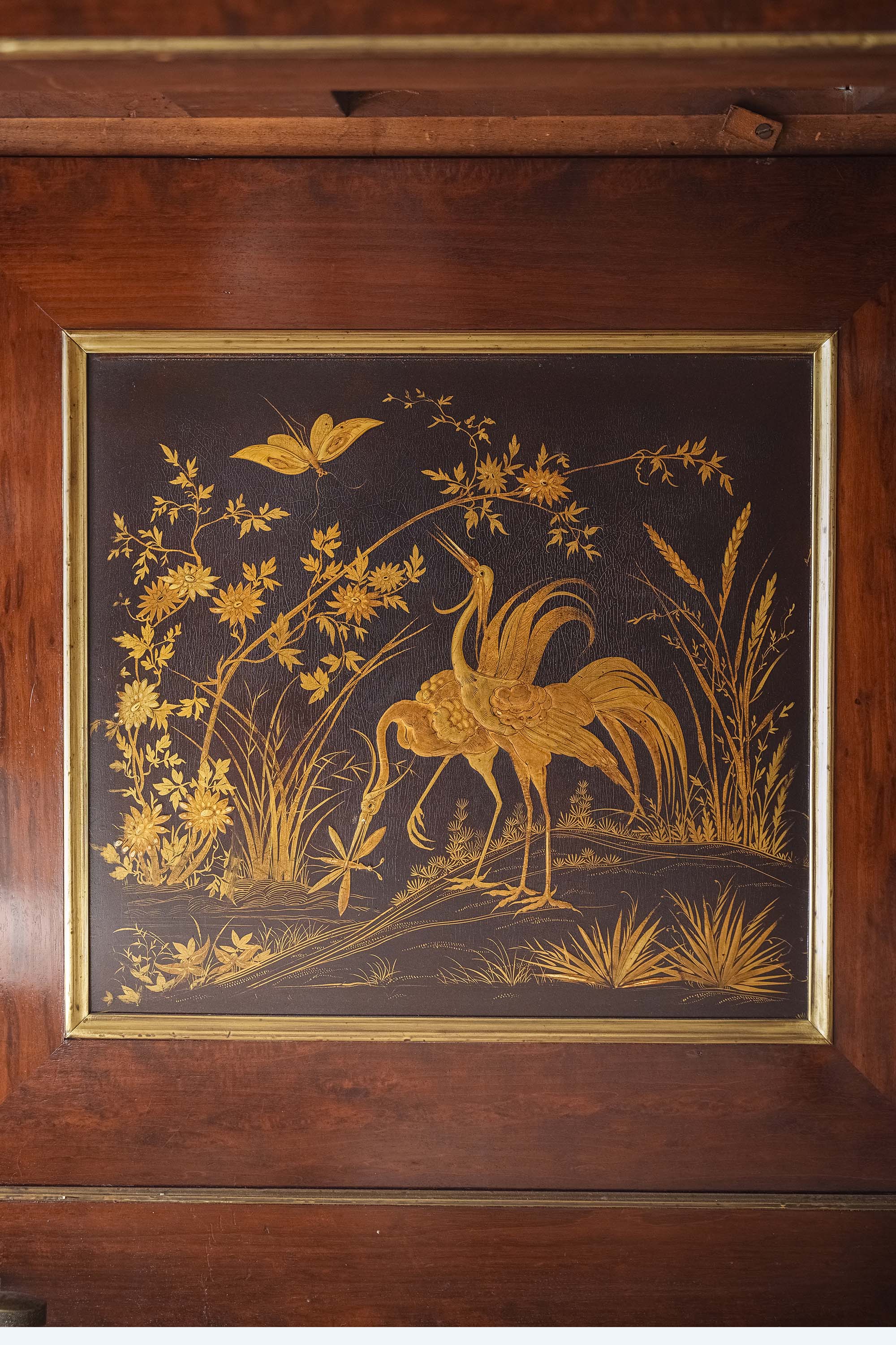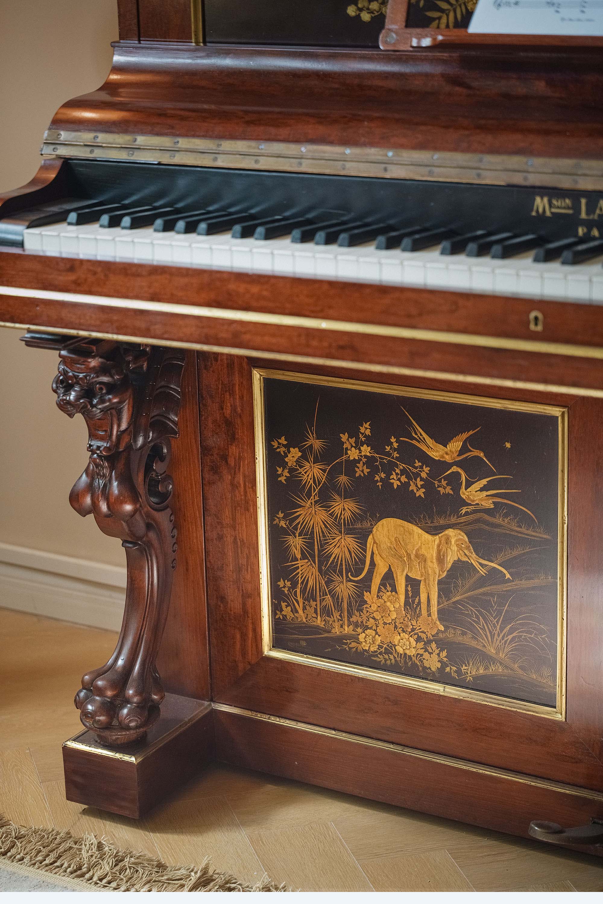 1890年代法国LABADIE PARIS签名出品东方风格铜鎏金烛台嵌象鹭花鸟纹莳绘漆画装饰瑞兽主题实木精雕立式钢琴