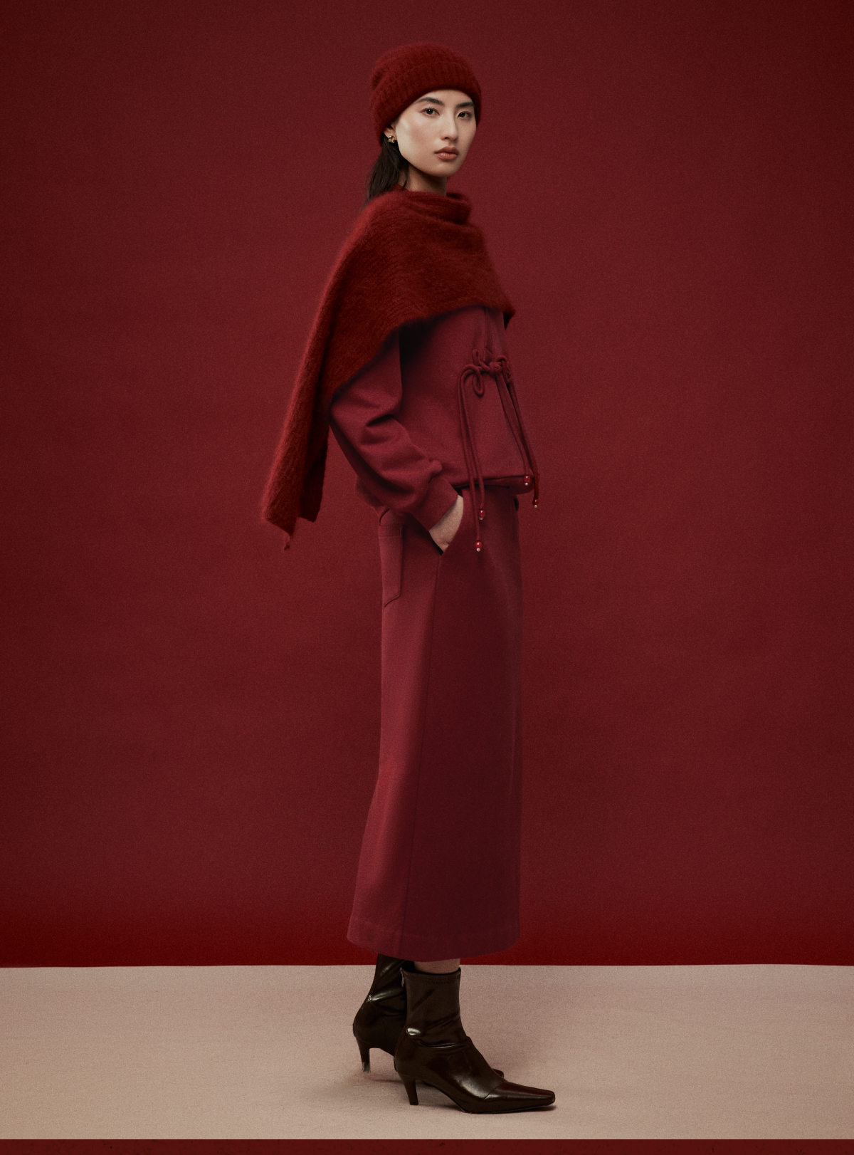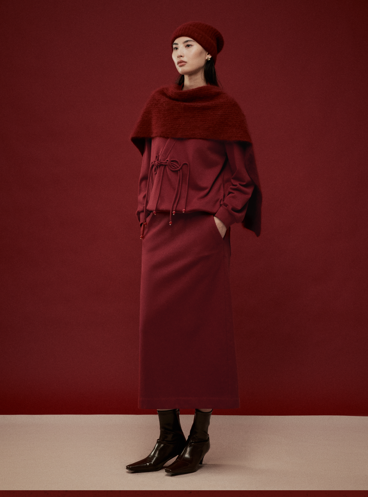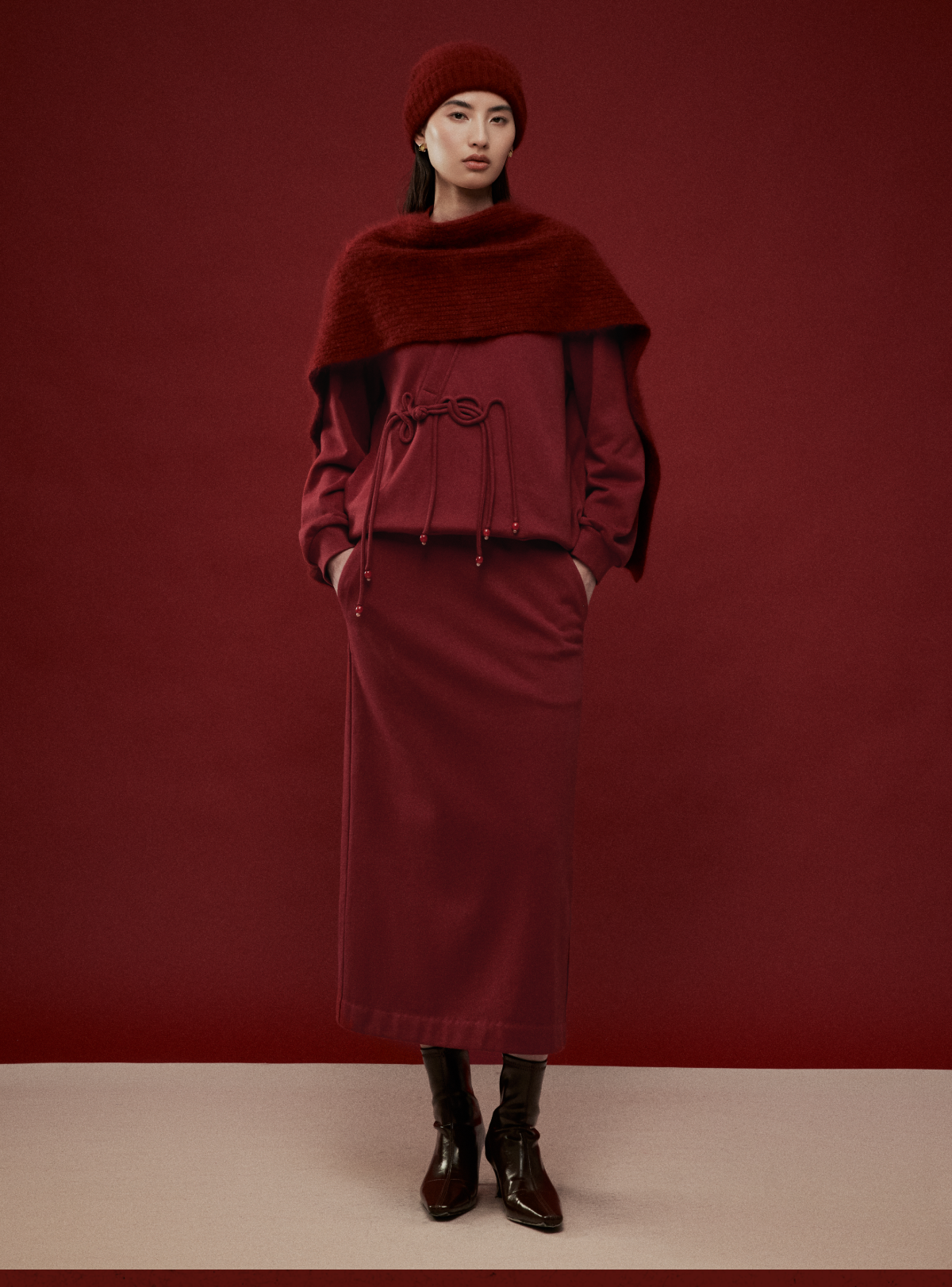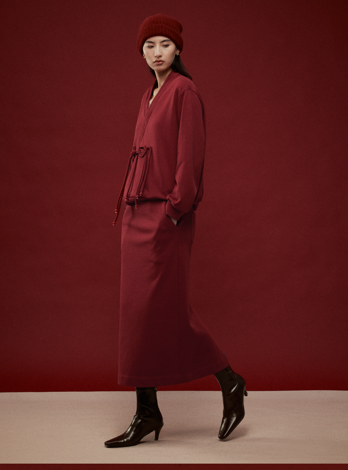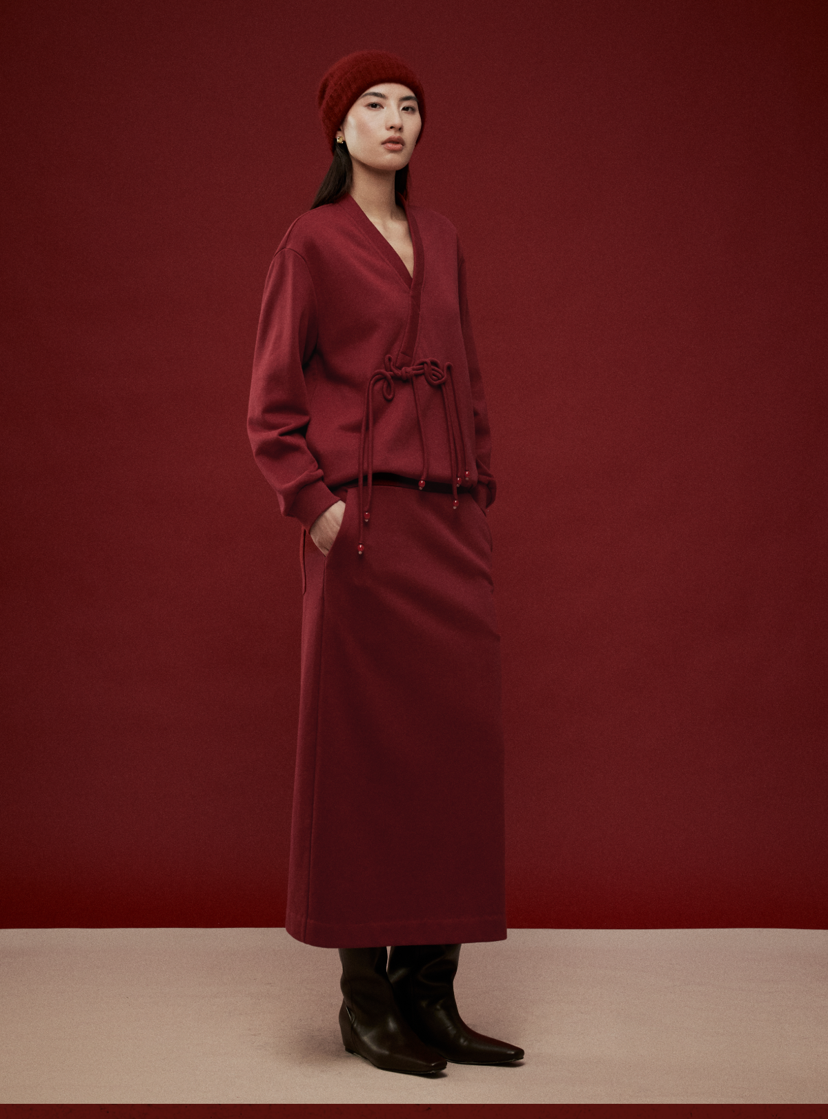 LIYIHAN岁暖红2025冬季新款新中式棉质盘扣V领红色套装