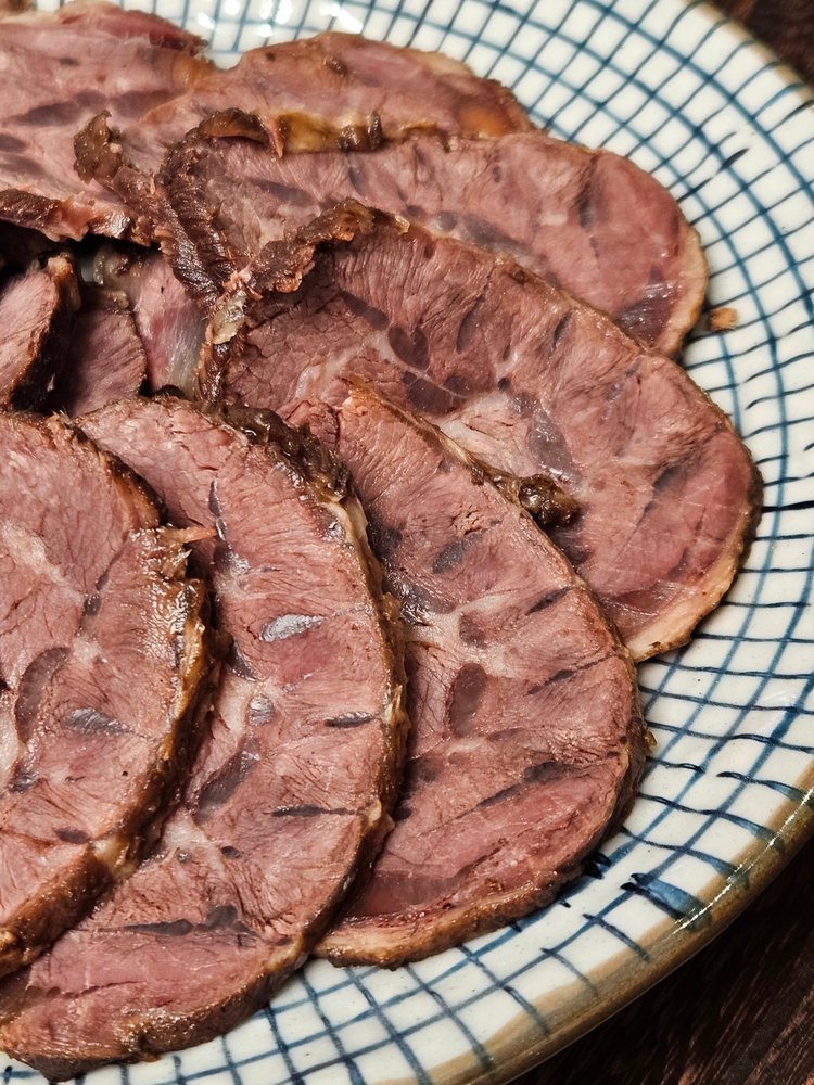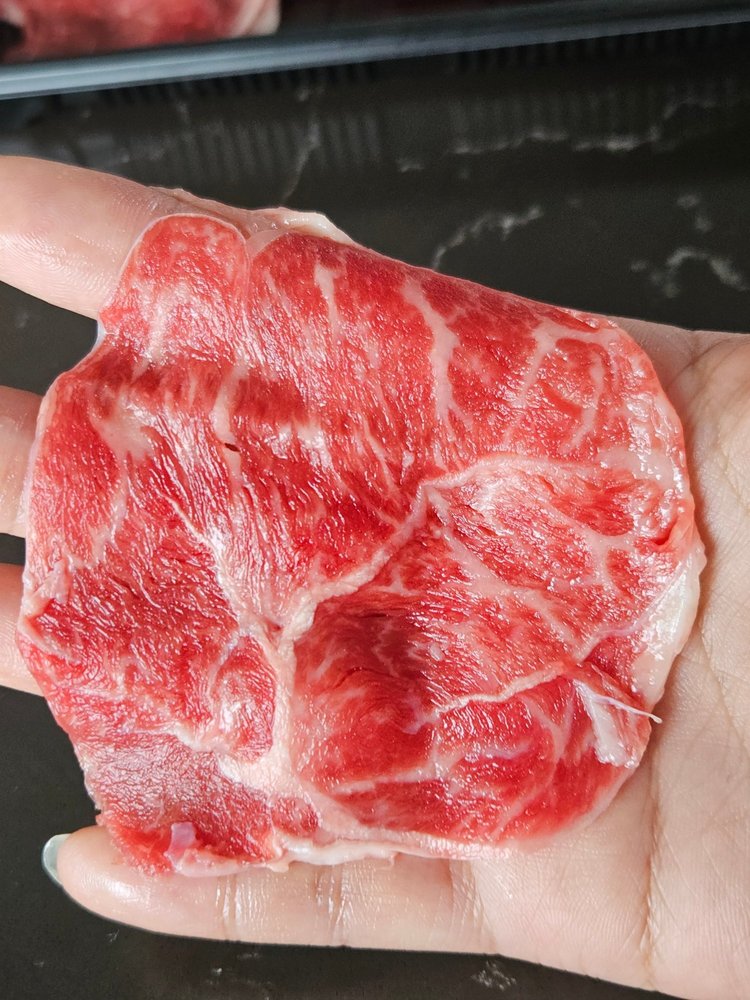 还有一种吃法👇冷透后切片,更为漂亮平整。若追求极致爽脆Q弹的口感,则推荐将整条腱子心切成薄片。在火锅内涮烫十数秒即可食用。
