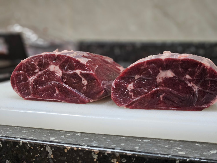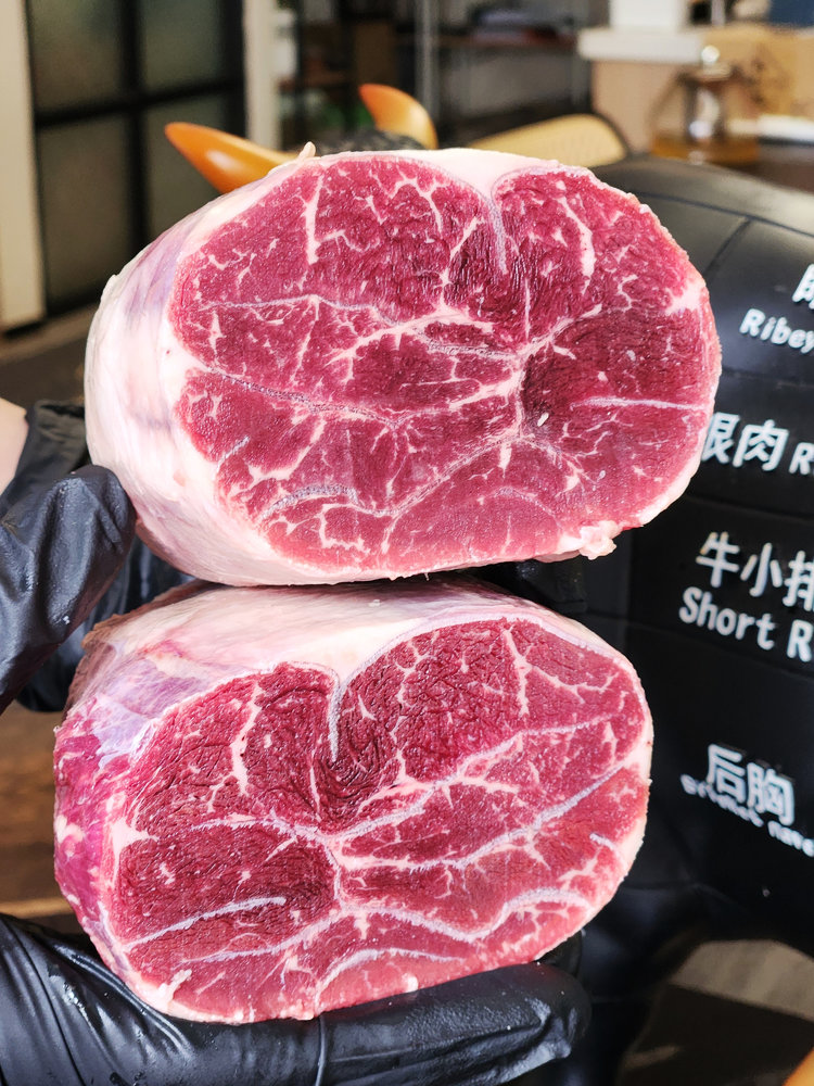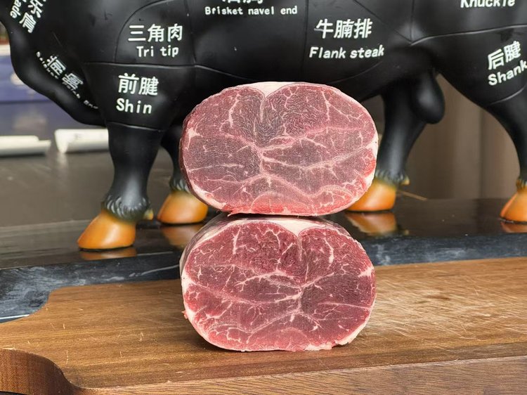 金钱腱,花纹不是一般的美,肉里包筋,筋内有肉,肉质软糯甘香,脂肪低。