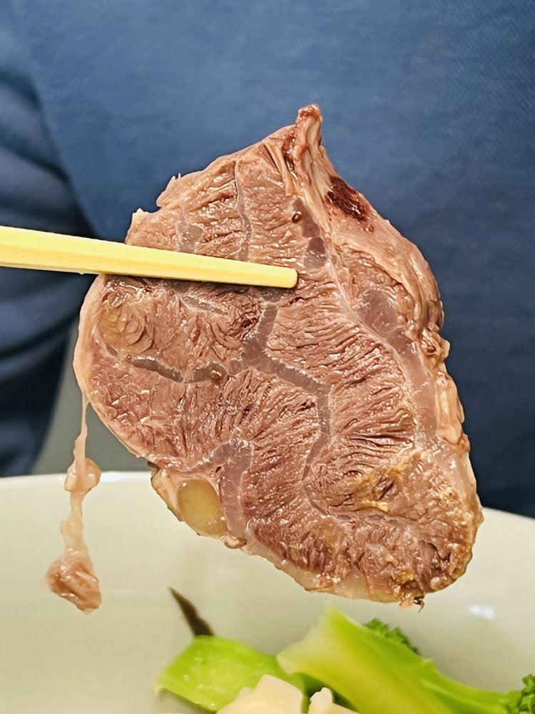 鲜嫩:金钱腱的肉质鲜嫩多汁,咬上去不会感到过于柴硬。很软糯!