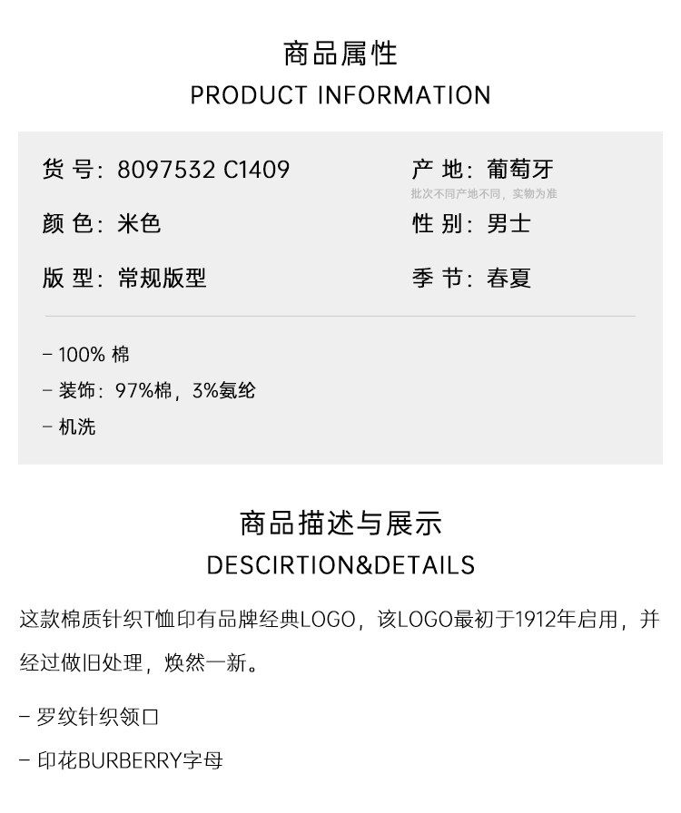 【一】BURBERRY 巴宝莉 男士字母徽标棉质圆领短袖T恤 米色 8097532 C1409