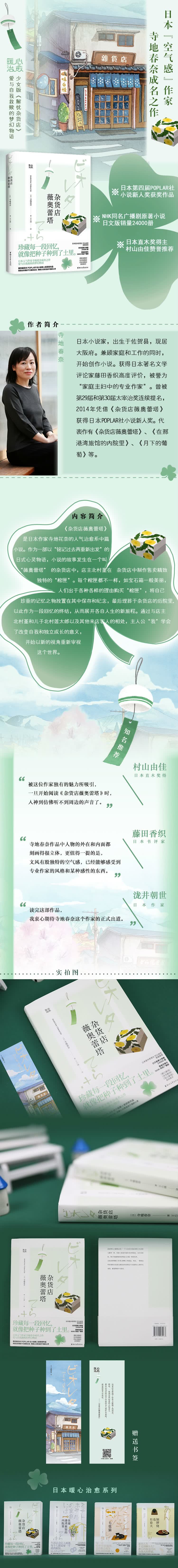 日本旧式杂货店随着时代的发展已经越来越少了,所以其中的故事和人情就会显得格外珍贵,《杂货店薇奥蕾塔》以女性新店员的视角来带领读者感受这个杂货店背后的故事。寺地春奈的“空气感”作家的名号也是从这部作品开始的。不同于传统杂货店老店主回忆的模式,这部作品以一个少女的视角讲述杂货店中不同人物各自复杂经历为特色。