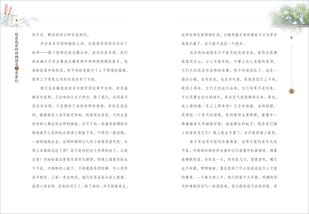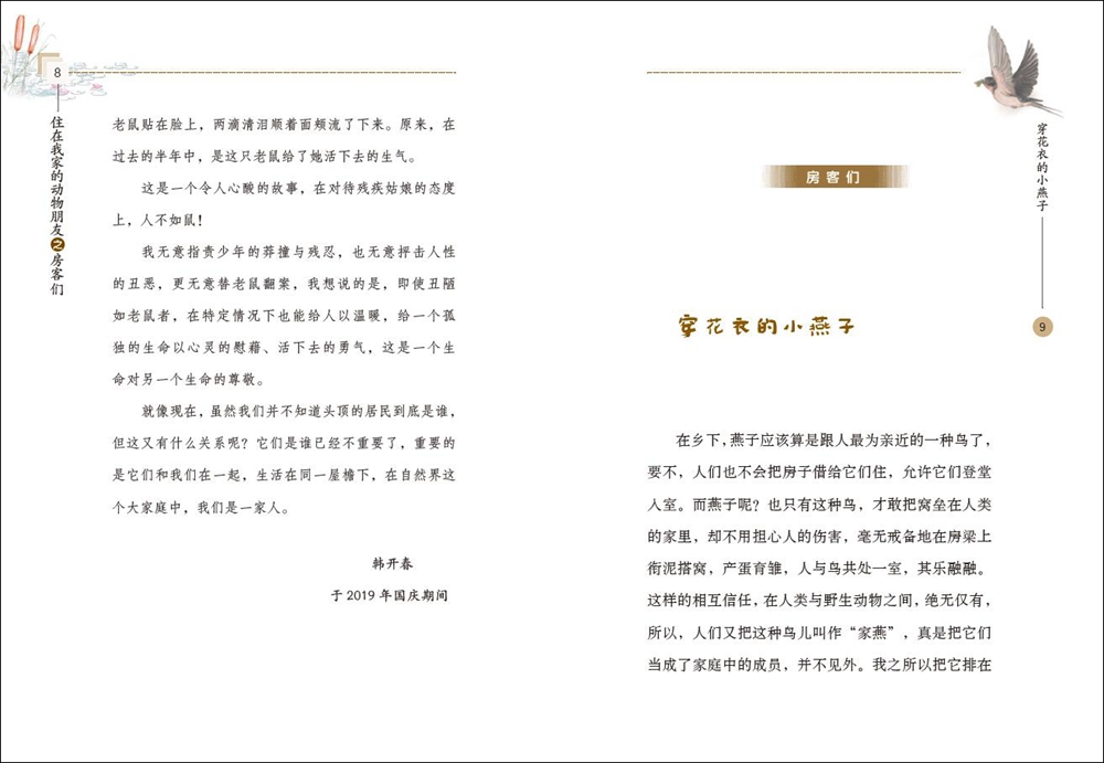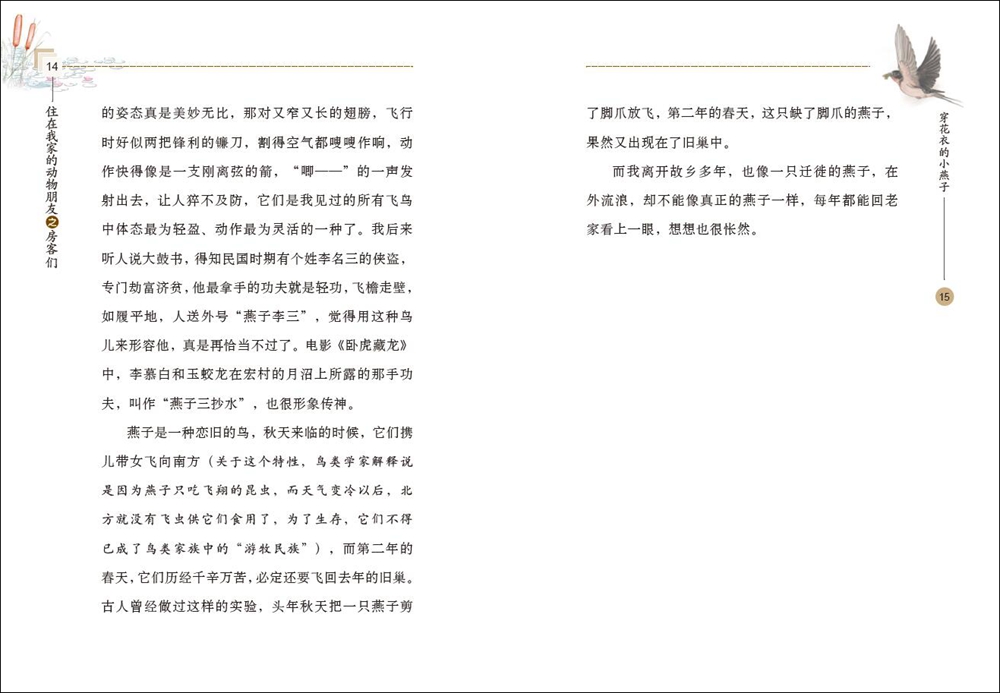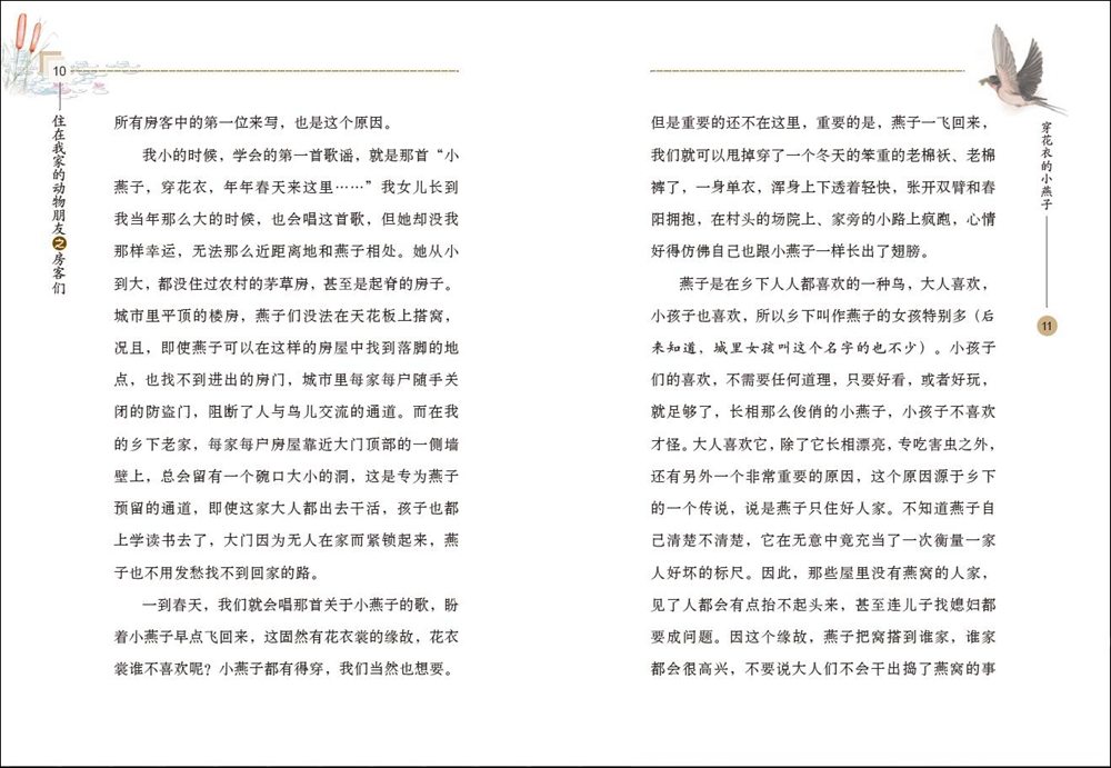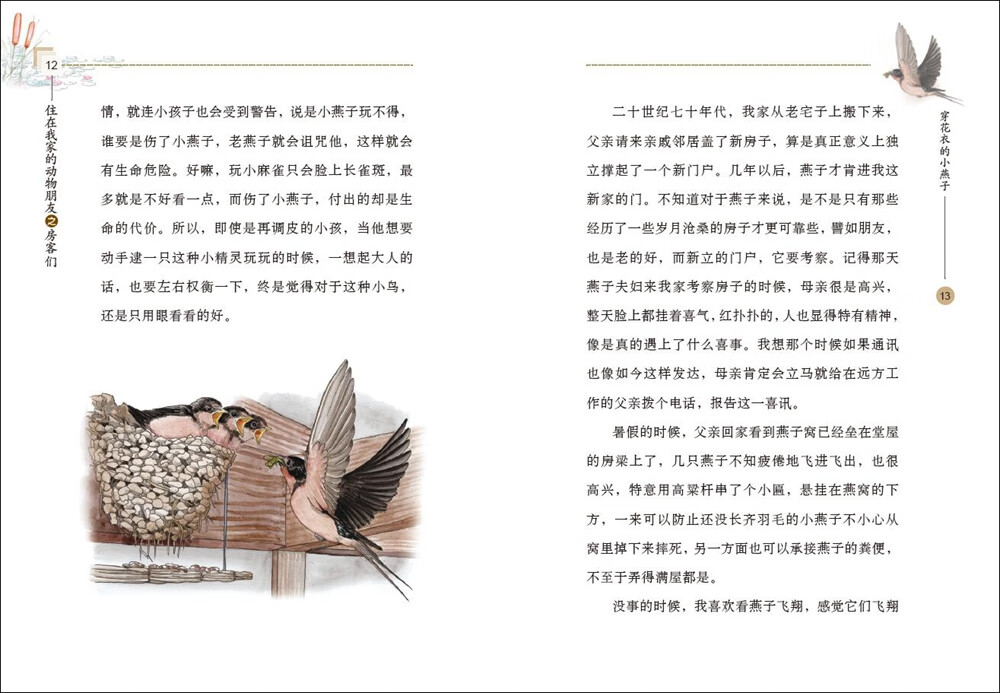 作品中旁征博引、引经据典,既有广博的人文知识,还有严谨的生物学科普知识,不仅蕴含着真情实感,而且具有浓浓的乡野生活气息,字里行间让读者感受到大自然的无限生机和魅力。这些住在我家的动物,牛羊鸡鸭鹅就像我的家庭成员一样亲切,那些偶尔光顾我家的麻雀、燕子和蛐蛐更就像偶尔来我家的客人,一旦光顾,我必定热情款待,这种人与动物和谐相处的氛围,让读者情不自禁生发对于动物的关切之心和平等之思。