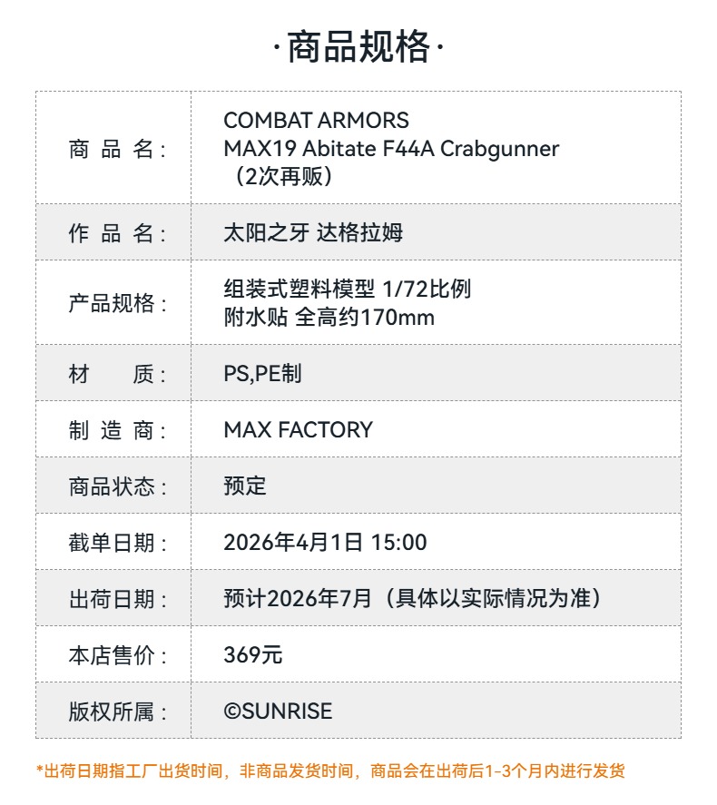 【GSC预售定金】COMBAT ARMORS MAX19 Abitate F44A Crabgunner 太阳之牙 达格拉姆