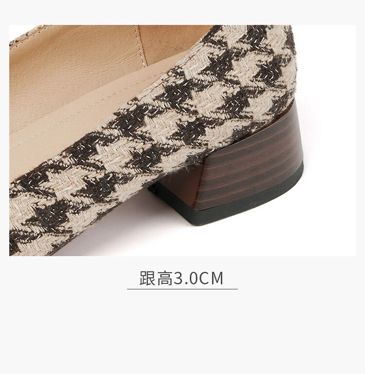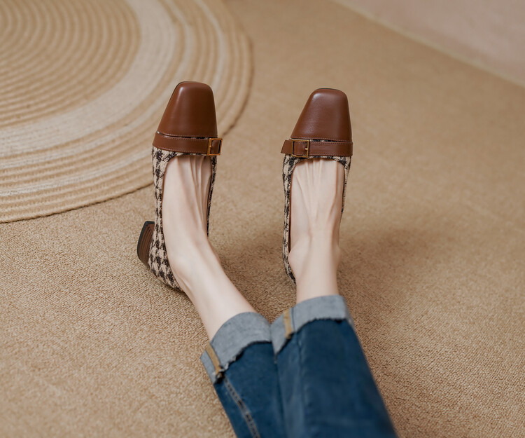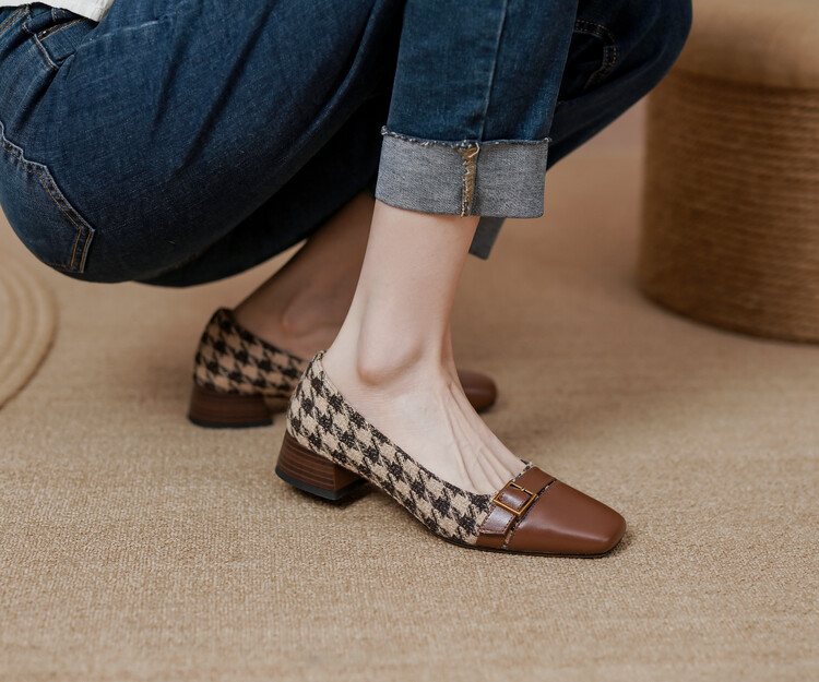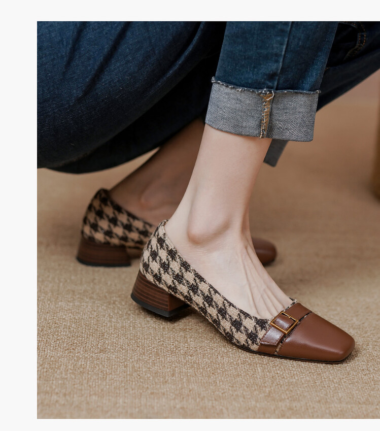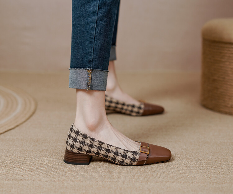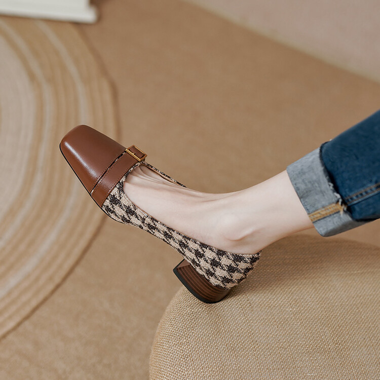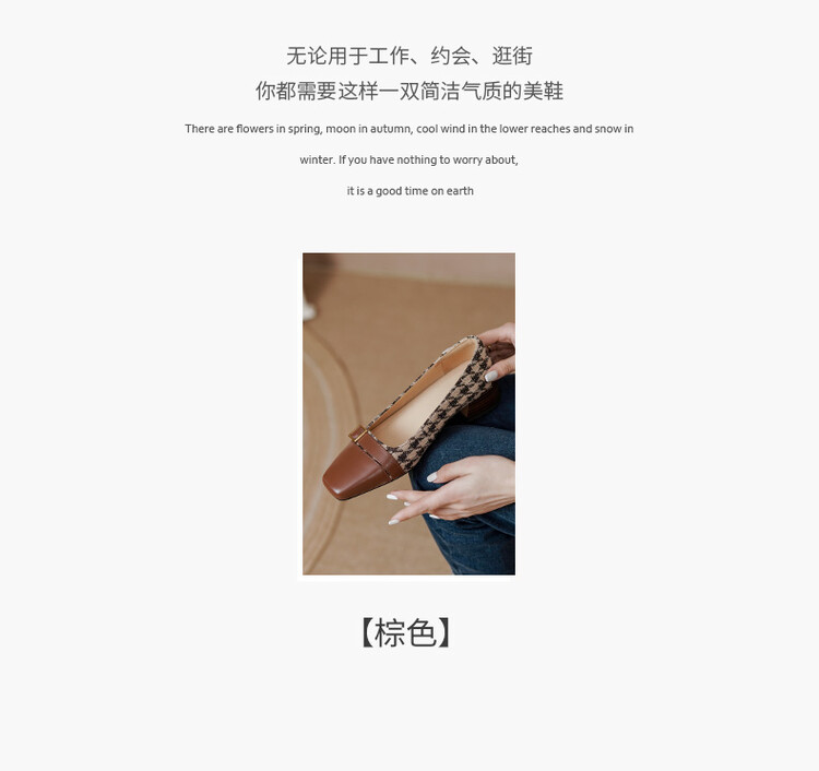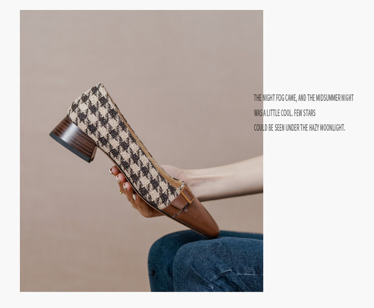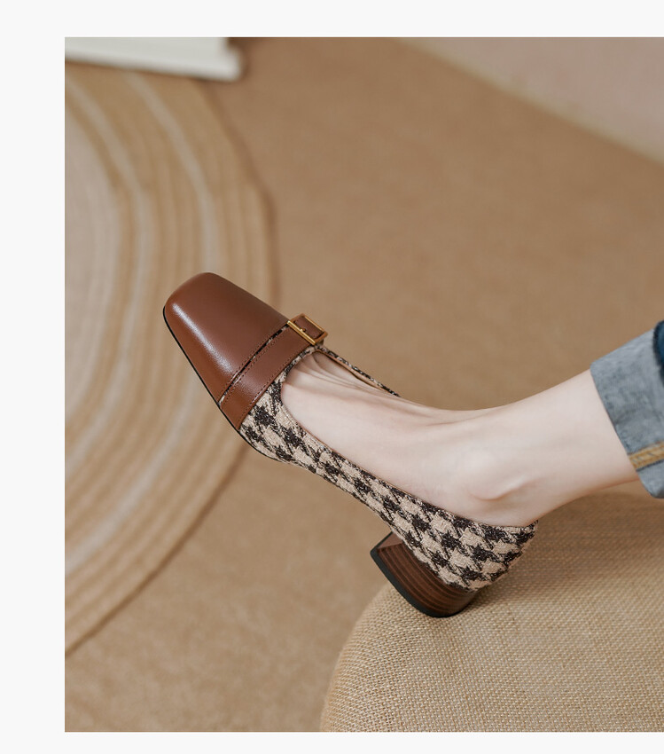 【预售5天】韩版浅口方头低跟单鞋头层牛皮配织物小香风复古女鞋PS&PS1200