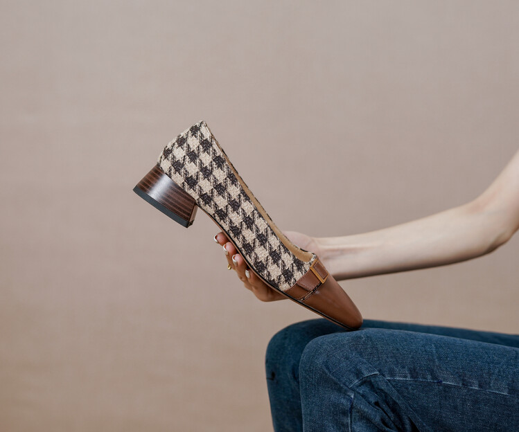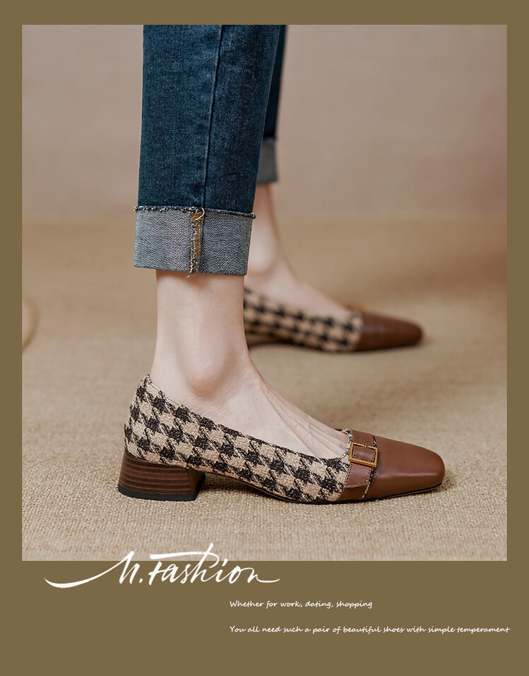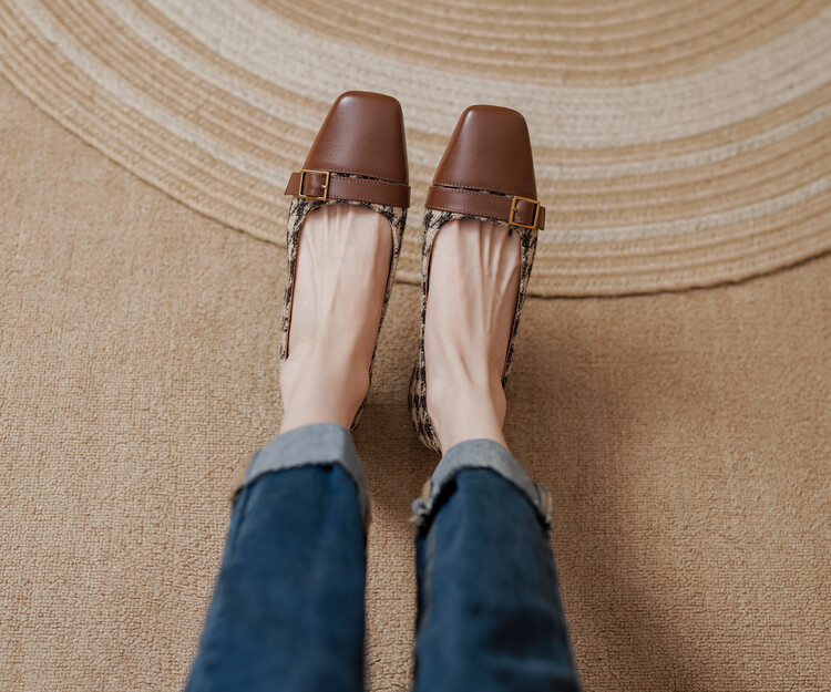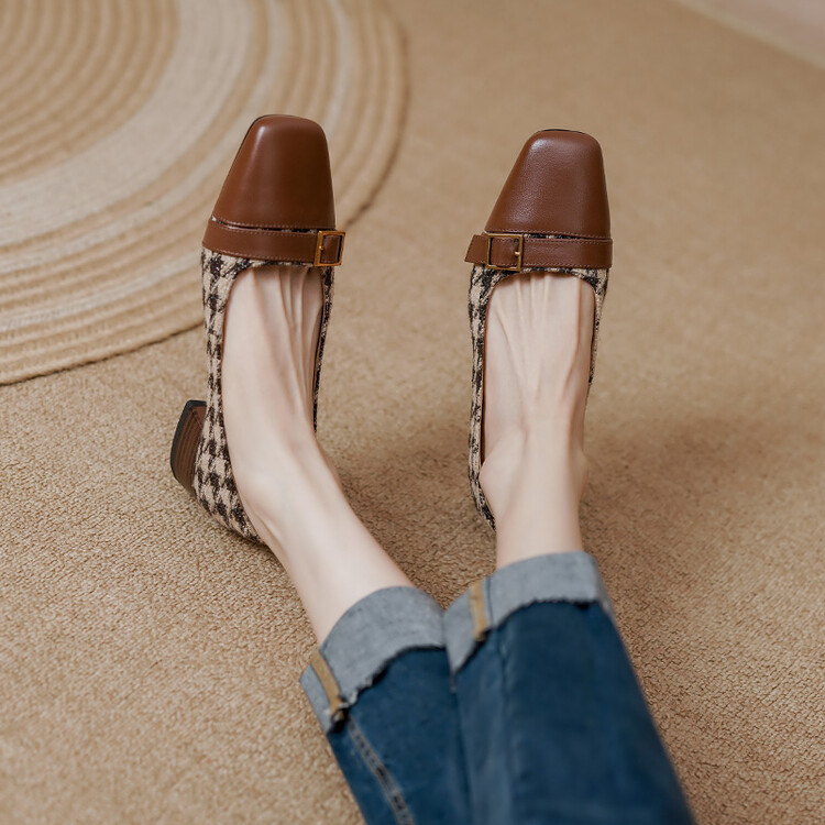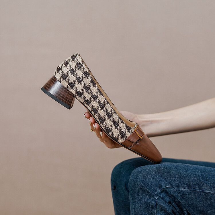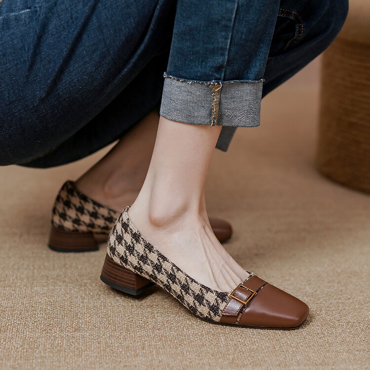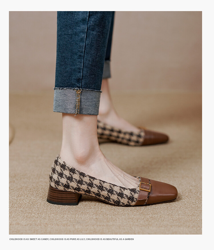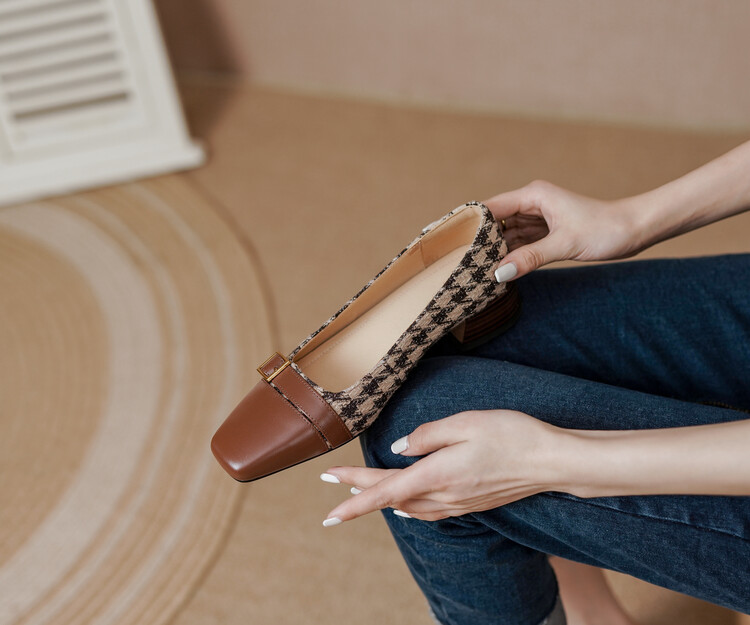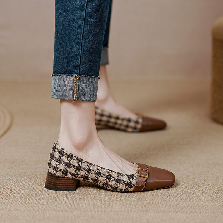【预售5天】韩版浅口方头低跟单鞋头层牛皮配织物小香风复古女鞋PS&PS1200