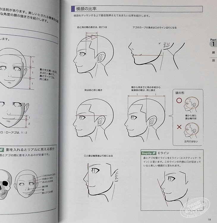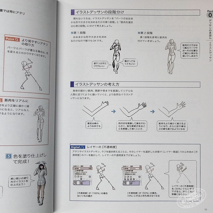 内容依据「素描的基础(身体比率、插画素描、身体重要部分、插画素描的秘诀)」、「脸(脸型、眼、眉、鼻、口、唇、齿、耳、发/各种角度的脸部画法)」、「胴体(体干、颈、胸、乳房、肩、腹肌、背、股关节、臀/图层与色彩区分、男女画法差异、肌肤的着色)」、「手、臂(手、指、臂、肘、腋下)」、「脚、腿(大腿、小腿、膝、脚)」等区分来详细解说描绘的方法,卷末还附上角色描绘的完整步骤、肌肉图解、肌肉型人物的画法、不对称姿势&K字理论。