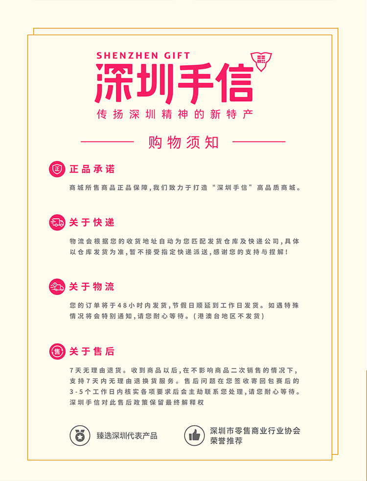 欢迎关注【深圳手信商城】 深圳手信是城市礼品的选购平台,臻选深圳八大优势产业代表产品,深圳市零售商业行业协会推荐。 闭着眼睛挑,每一份都是好礼,是商务往来、旅游出差、走亲访友、员工福利的好礼