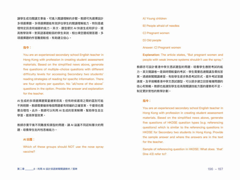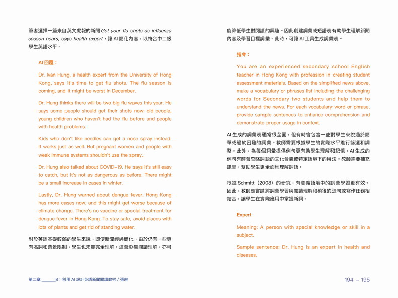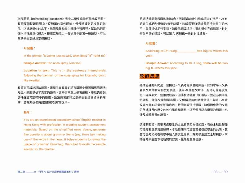 本書透過在不同學科、不同年級實踐以AI輔助教學的案例,說明AI能協助教師設計個人化的教學方案,照顧不同學生的需要。使用AI學習,有助提升學生的自主學習及高階能力,從而提升學生的能動性。AI不會削弱學生的能力,也不會取代教師的功能。透過人機協作,AI將會成為學生的學習良伴,實現「把學習還給學生」。