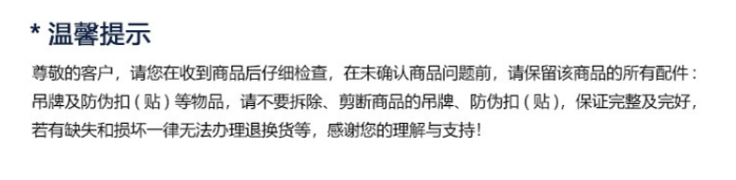 七天无理由退货需保持包包加防尘袋,中检吊牌加品牌吊牌,两个吊牌完好,中检标防伪验证涂层完整,包五金贴膜不能拆,否则,不予退换。
