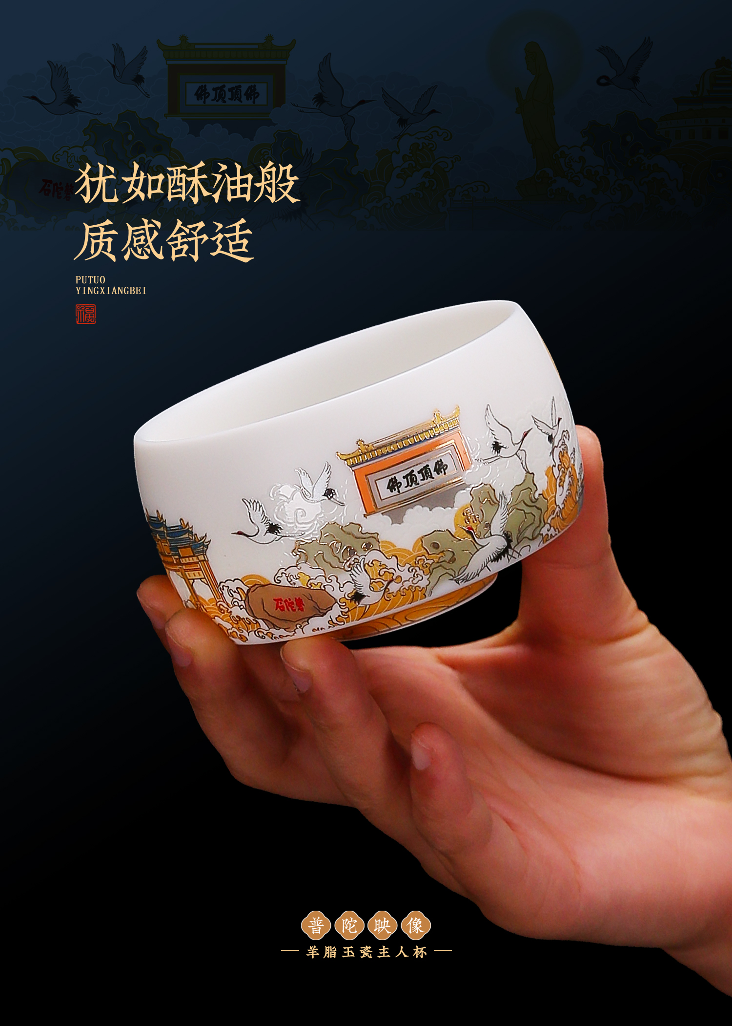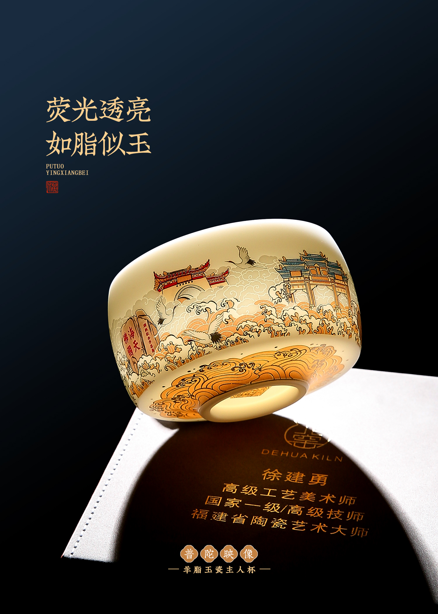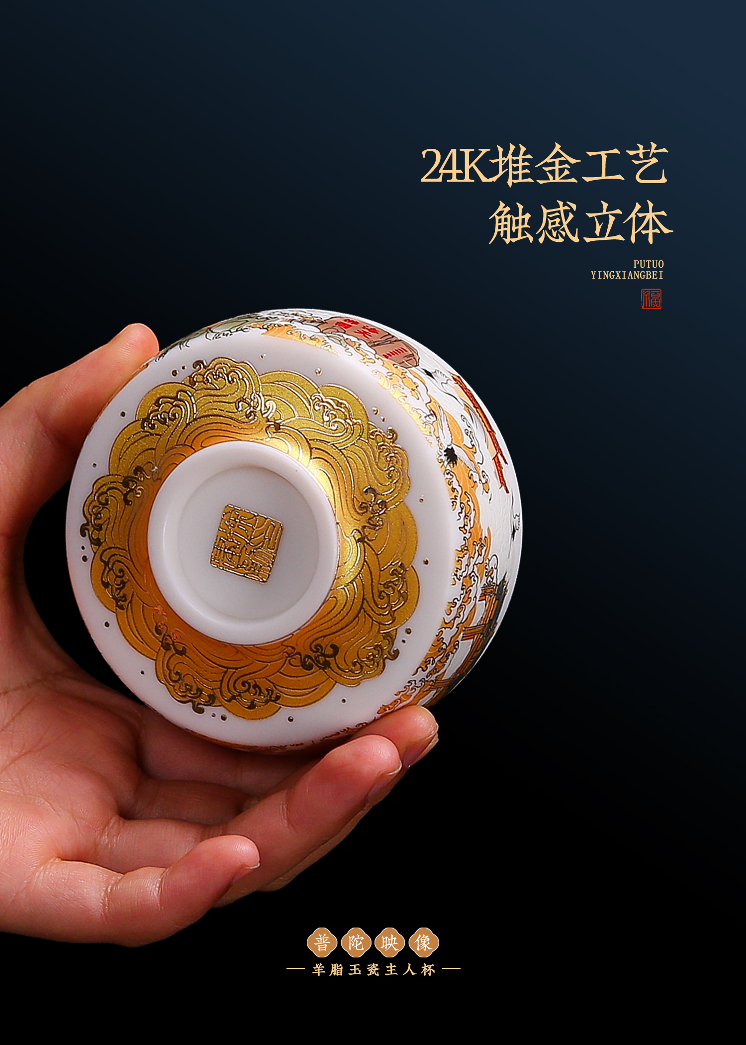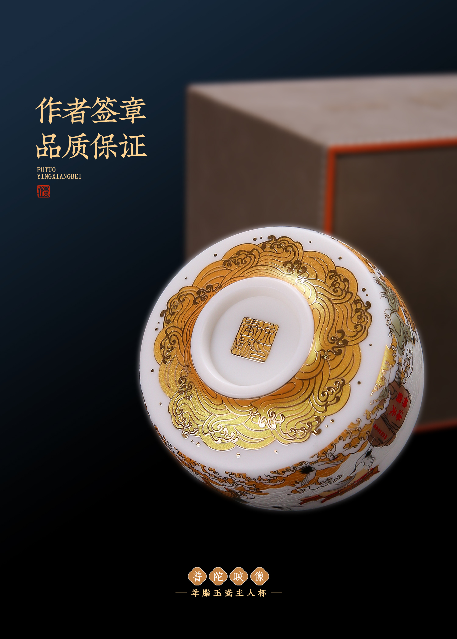 【匠心制作 韵味高雅】普陀映像 羊脂玉瓷主人杯,24K堆金工艺 作者签章,荧光透亮 如脂似玉,珍藏品鉴 送礼臻品