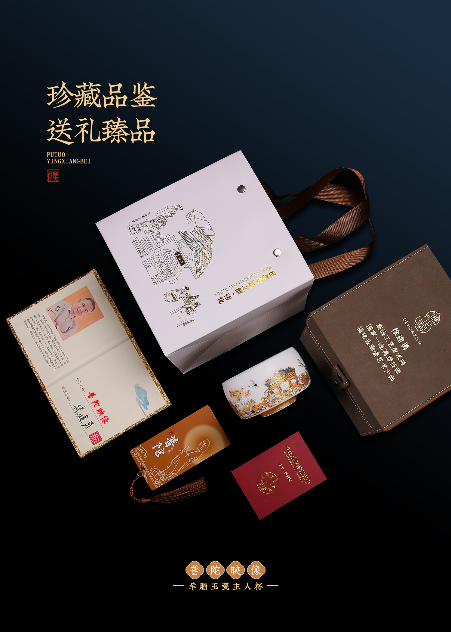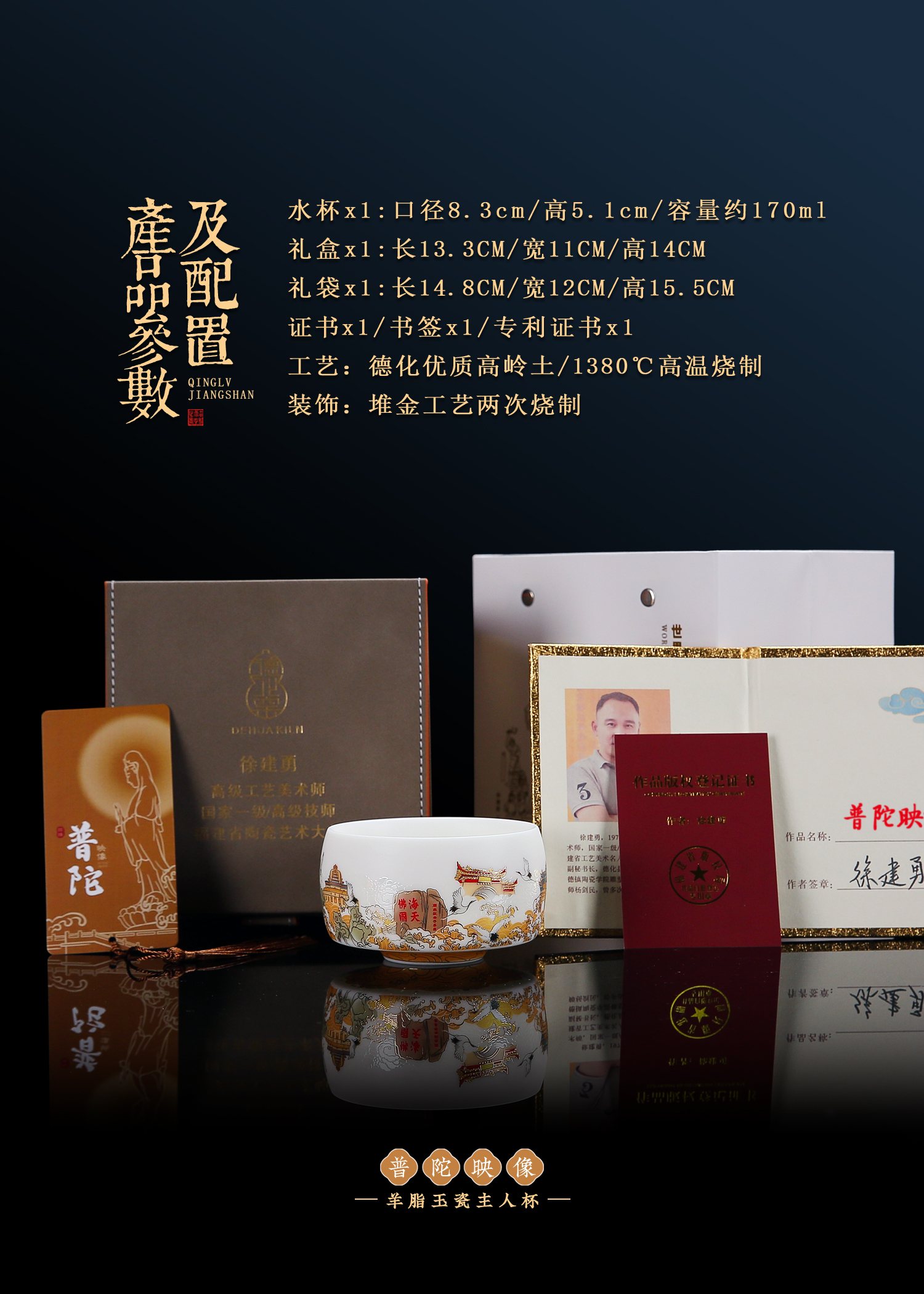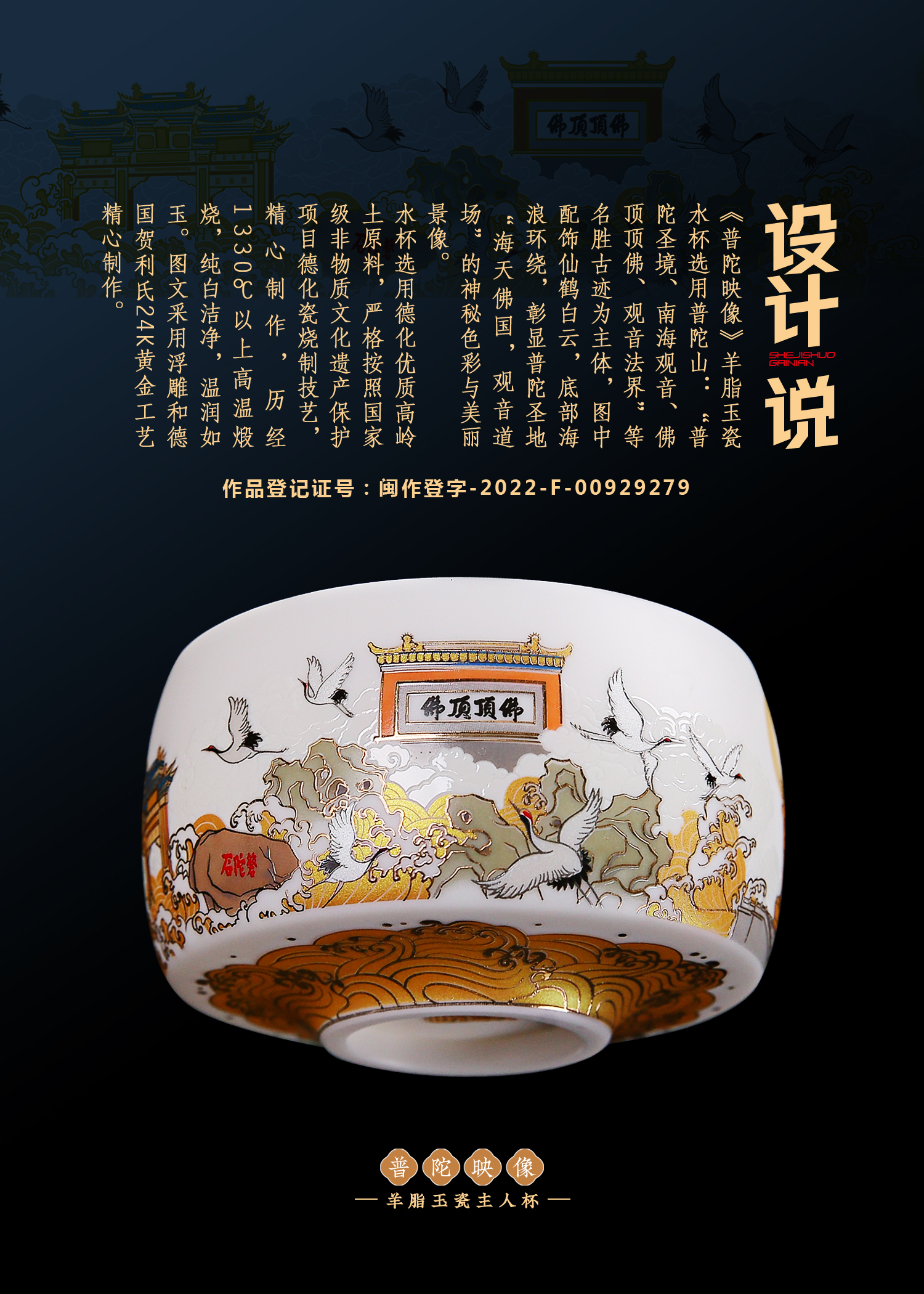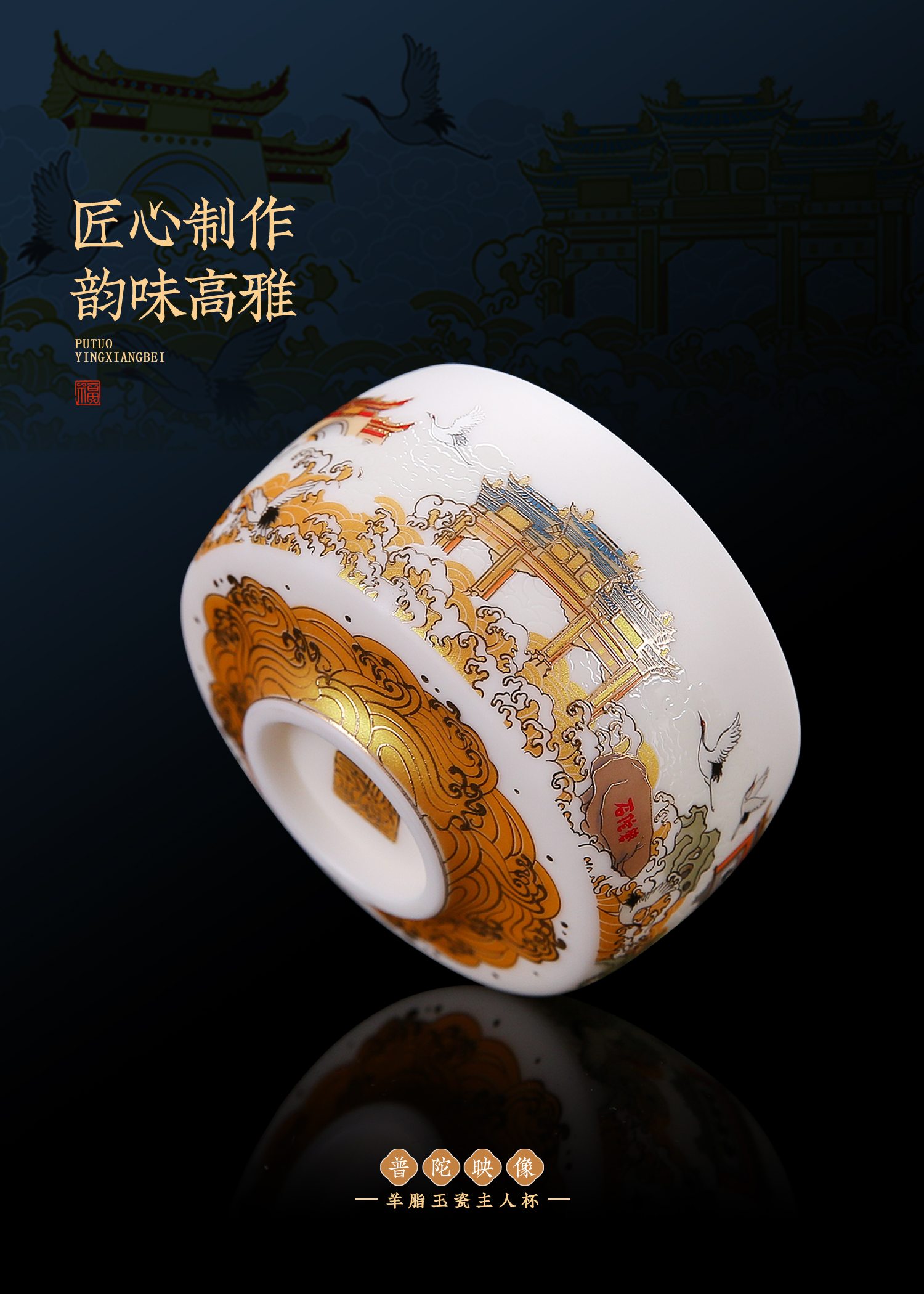 【匠心制作 韵味高雅】普陀映像 羊脂玉瓷主人杯,24K堆金工艺 作者签章,荧光透亮 如脂似玉,珍藏品鉴 送礼臻品