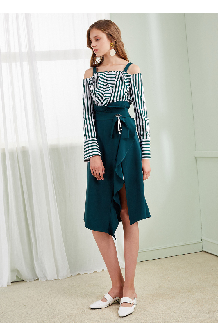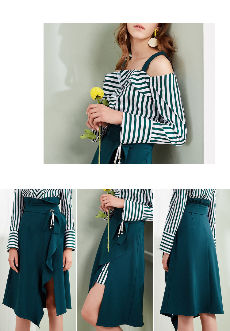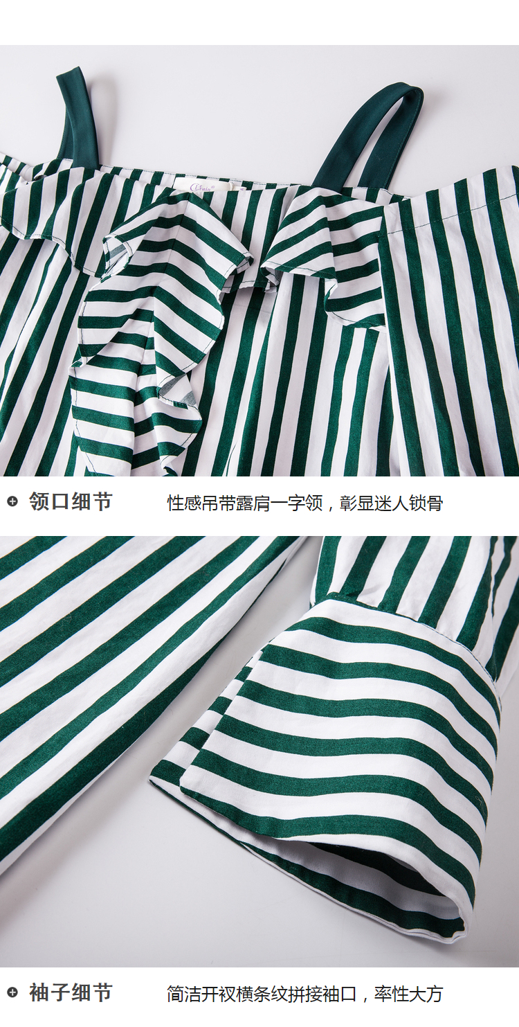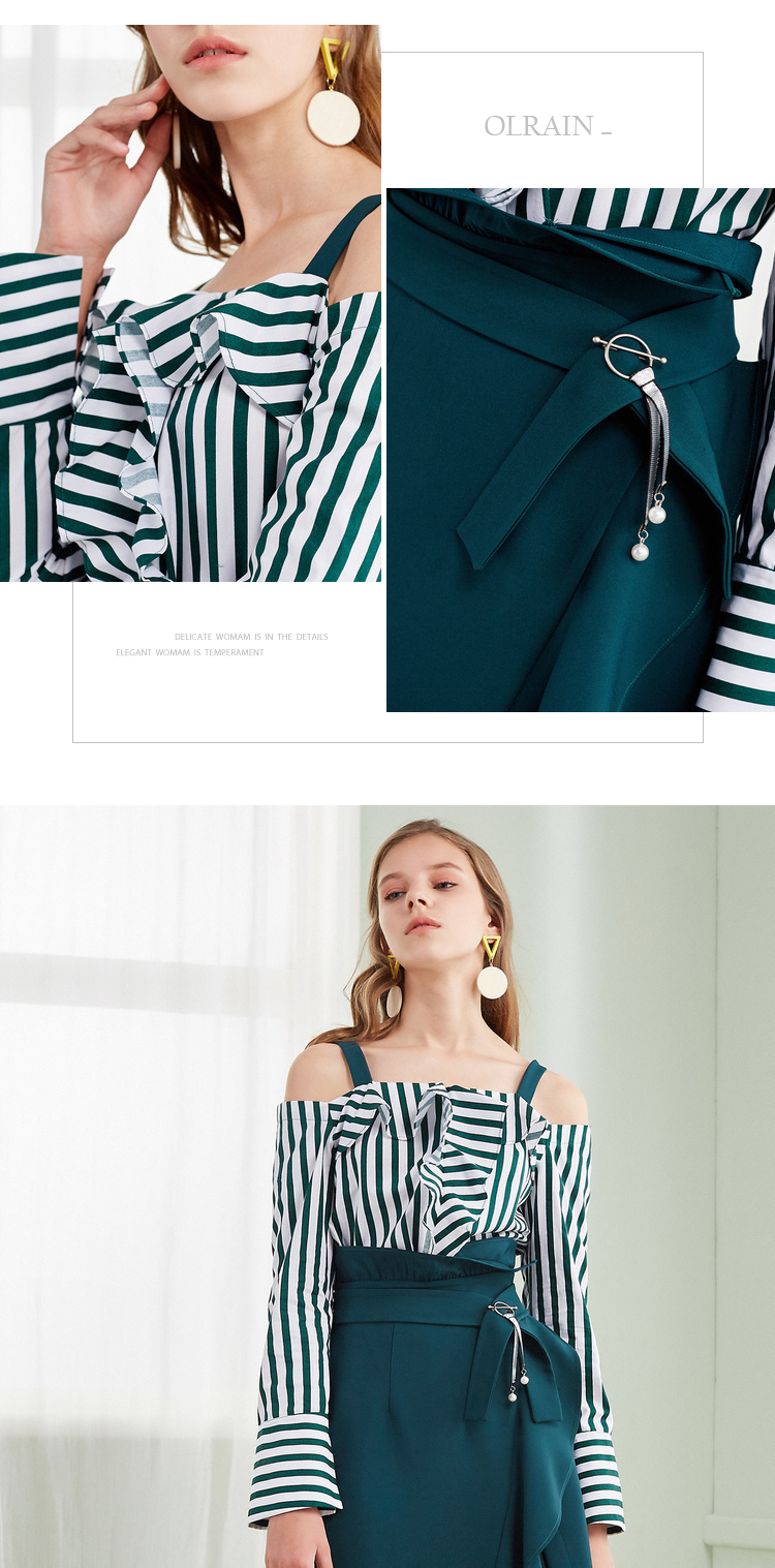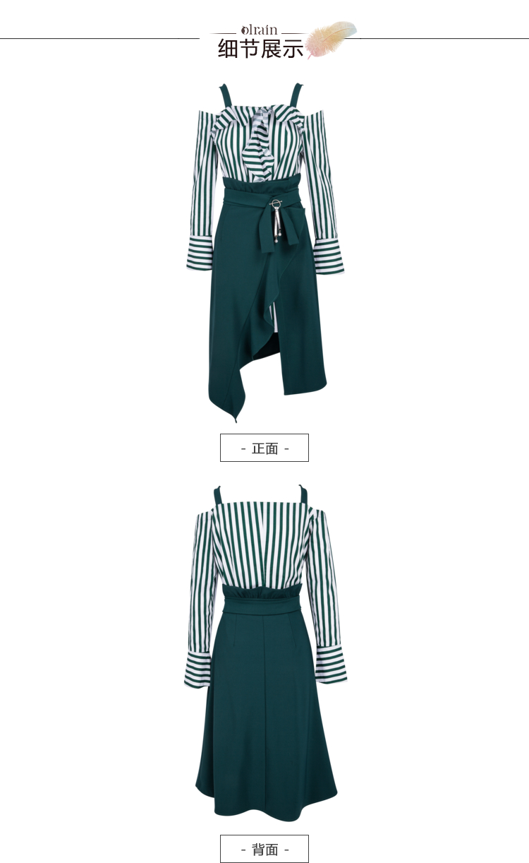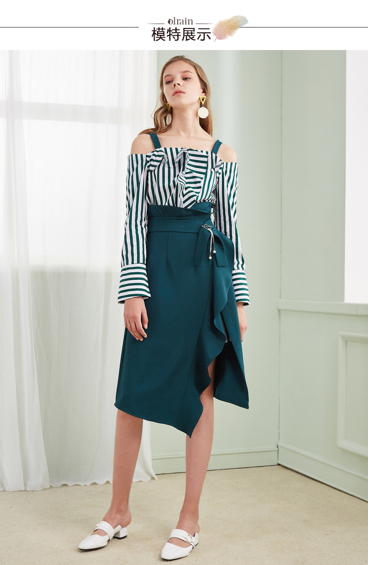 欧芮儿2018春新款露肩吊带条纹一字领上衣+荷叶边半身裙套装裙