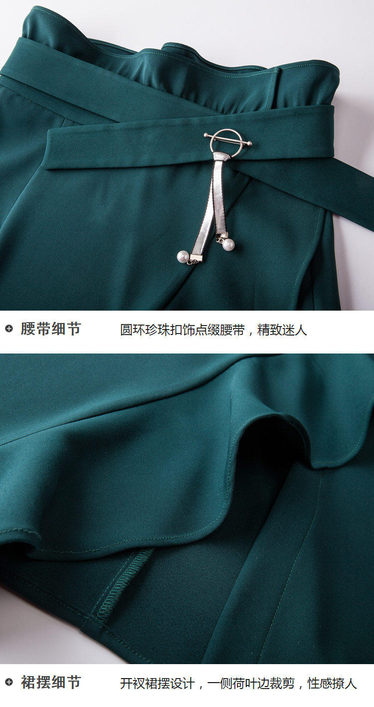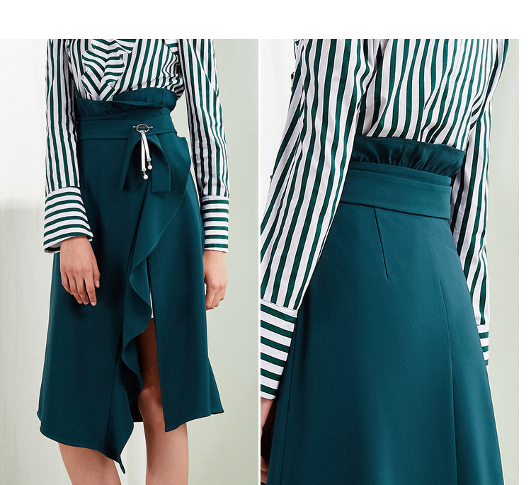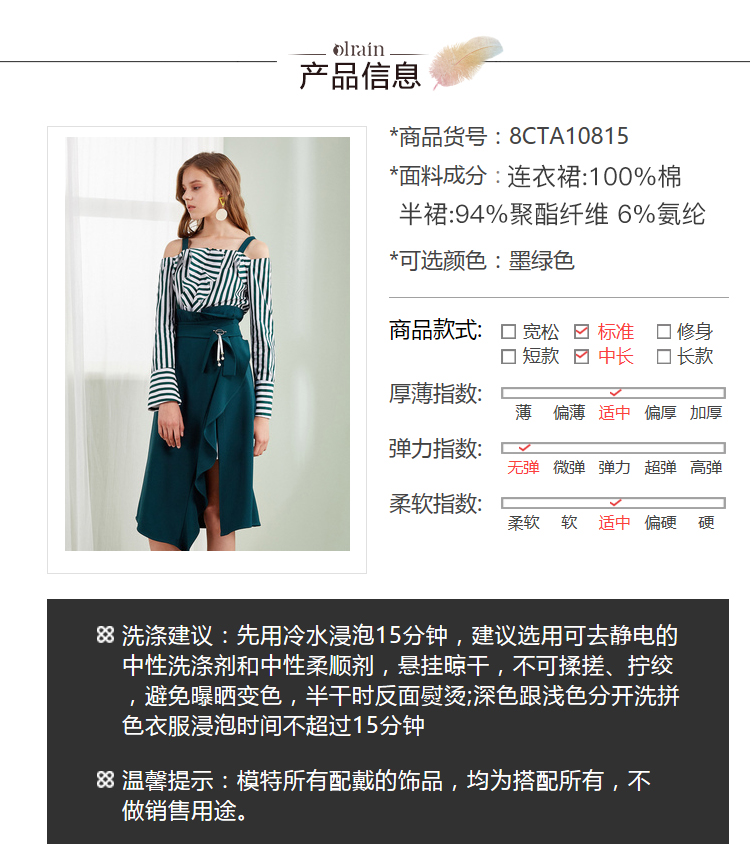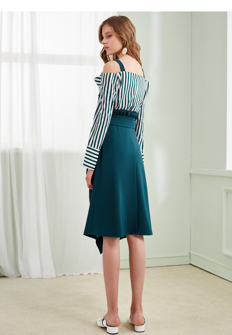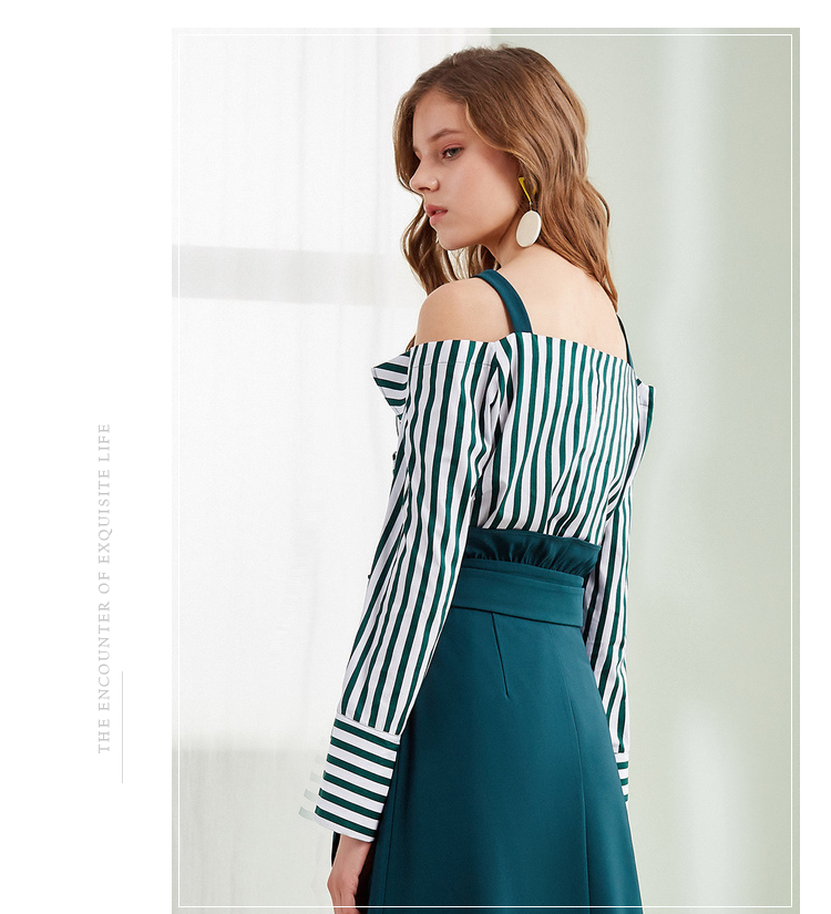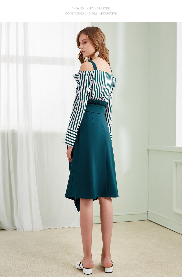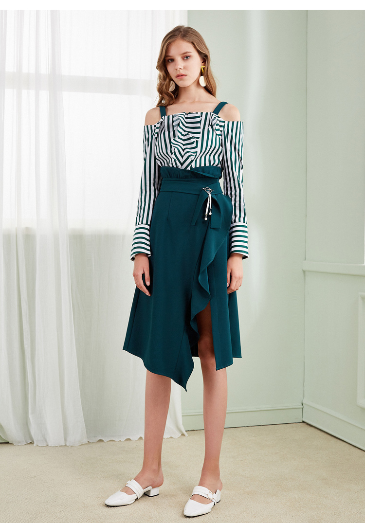 欧芮儿2018春新款露肩吊带条纹一字领上衣+荷叶边半身裙套装裙