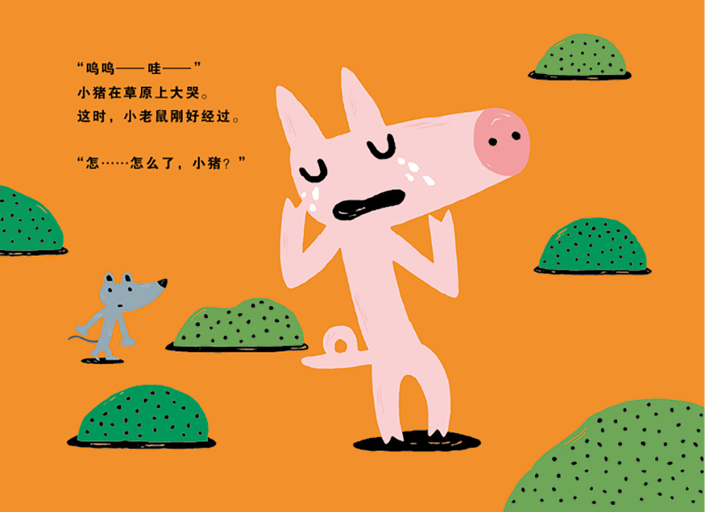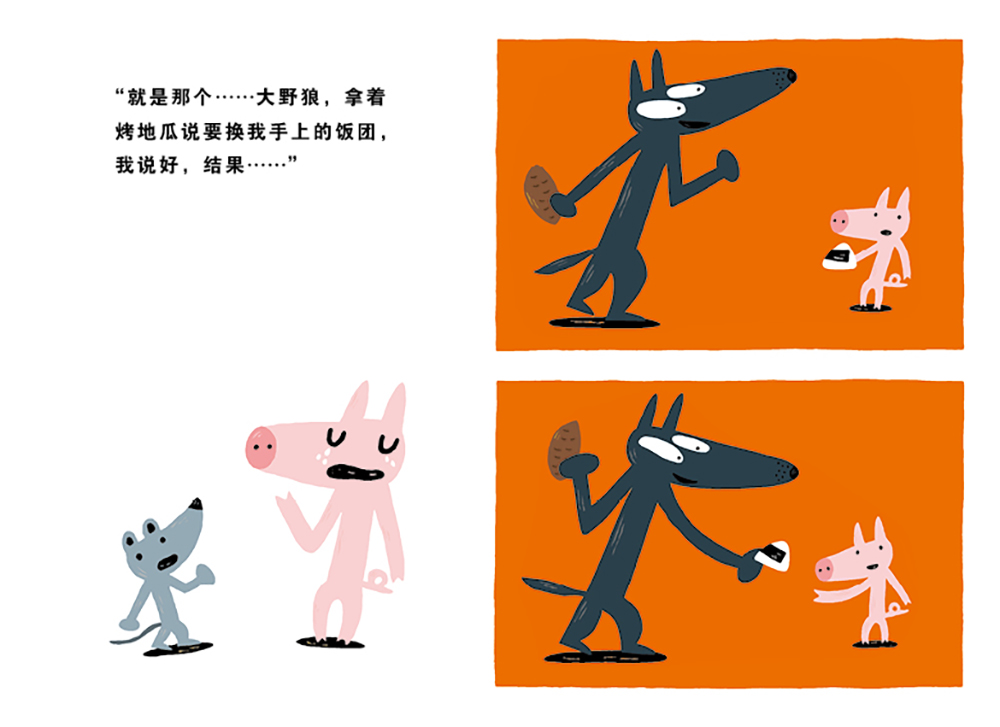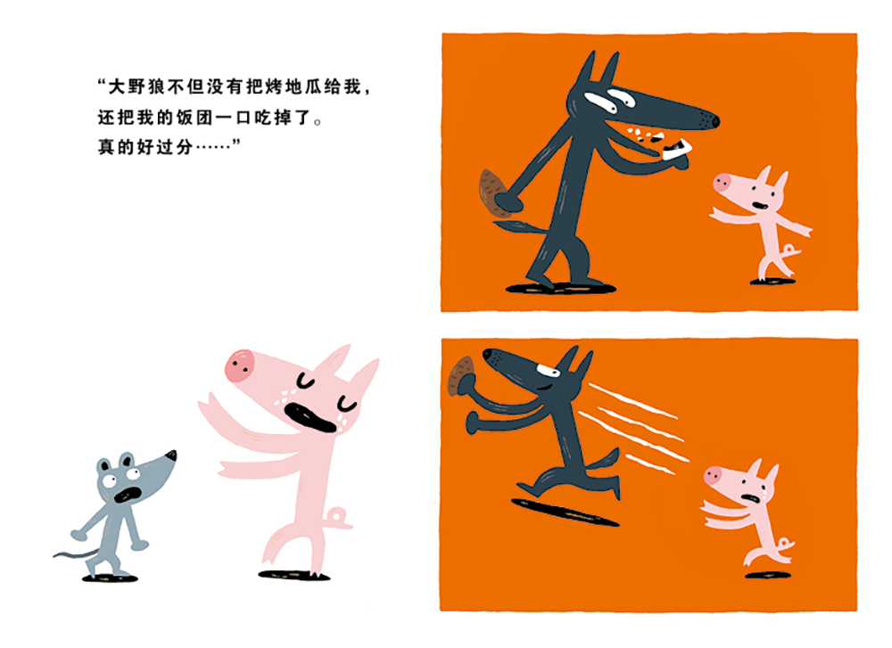 故事是这样开始的,一只小猪在草原上大哭,小老鼠刚好路过,问起缘由,原来是“大野狼拿着手上的烤地瓜说要换我手上的饭团,我说好,结果……大野狼不但没有把烤地瓜给我,还把我的饭团一口吃掉了。”路见不平的小老鼠急吼吼地跑去找人帮忙了。