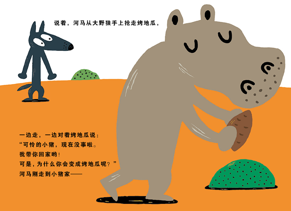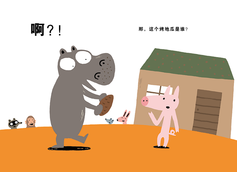 以为烤地瓜就是小猪的河马抢过大野狼手里的烤地瓜后遇见了小猪,“啊?!那,这个烤地瓜是谁?”