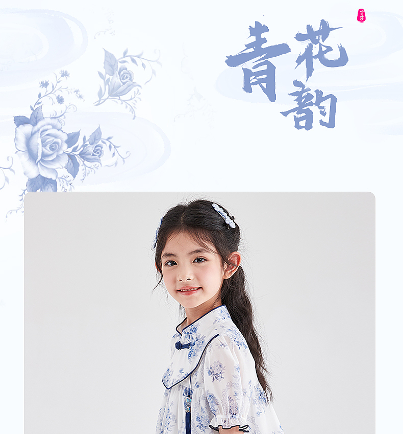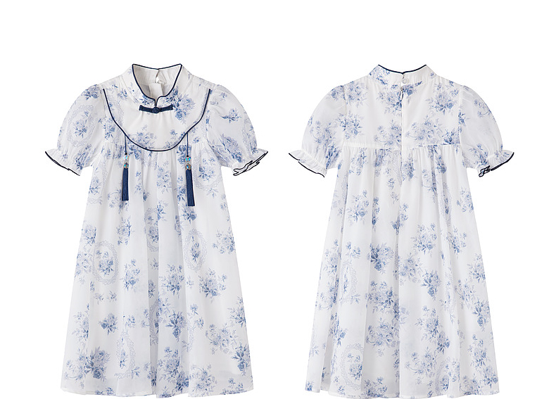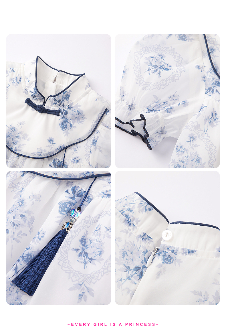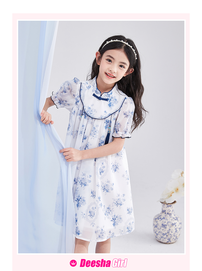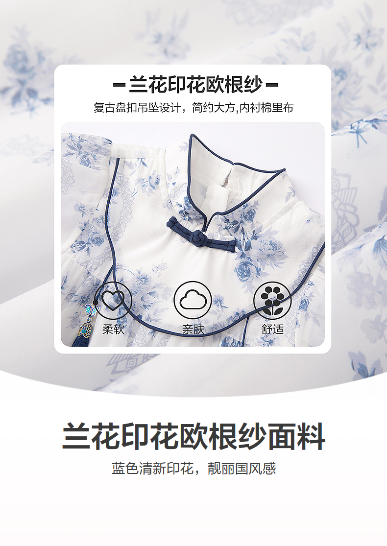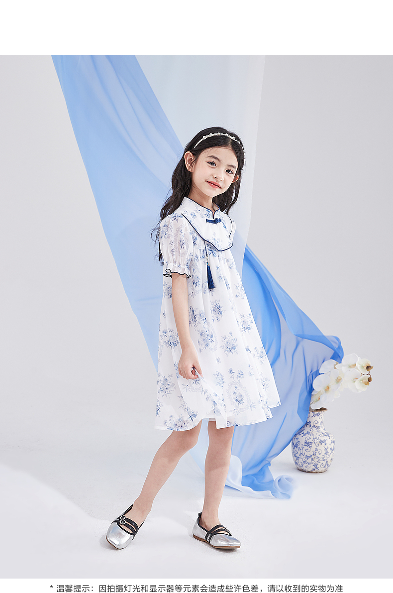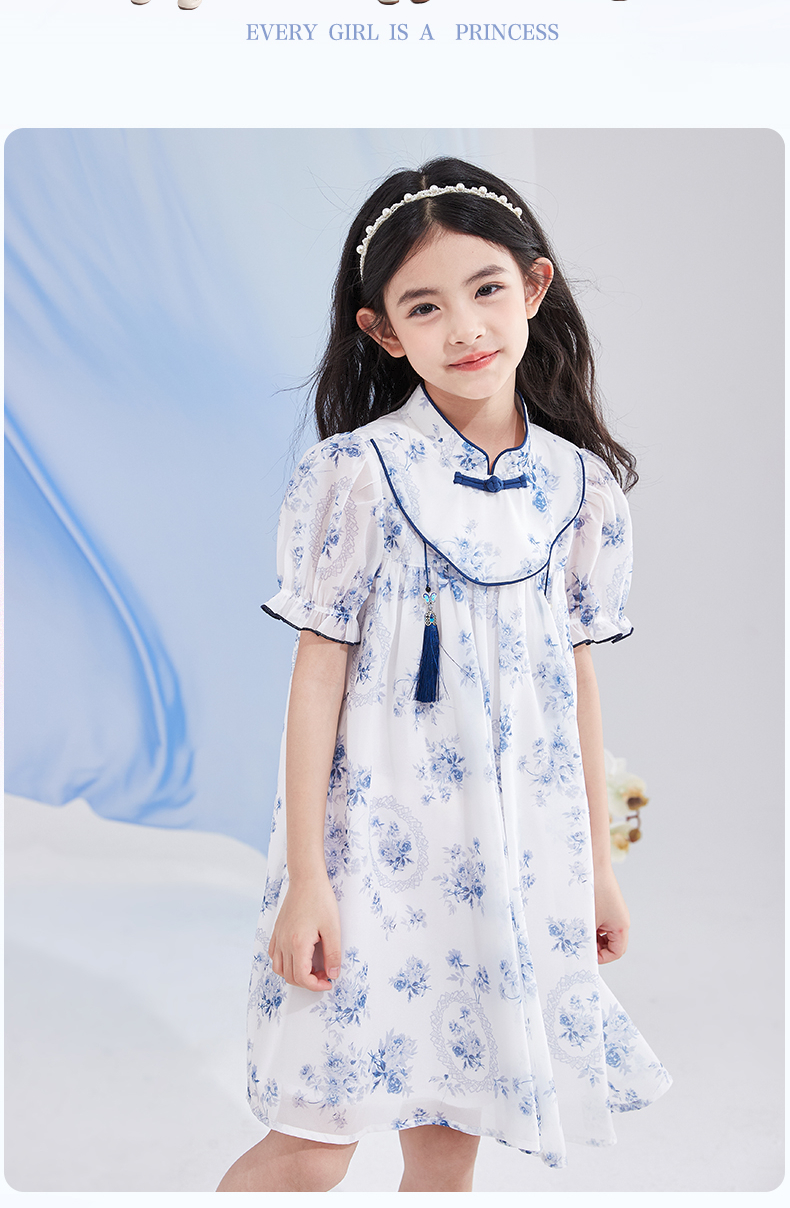 笛莎官方童装女童连衣裙2023年夏装新款儿童兰花印花欧根纱汉服裙