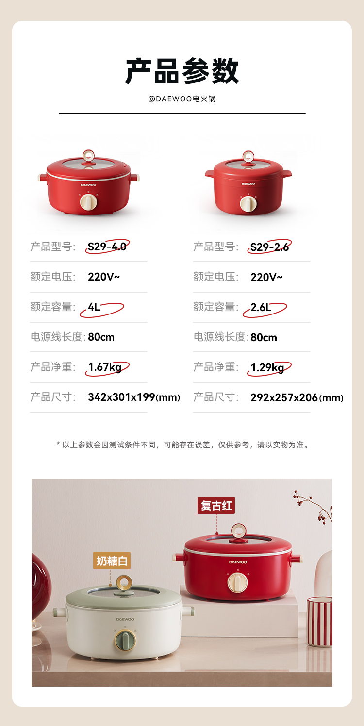 【产品容量】:2.6L(复古红)、4L(复古红、奶糖白)