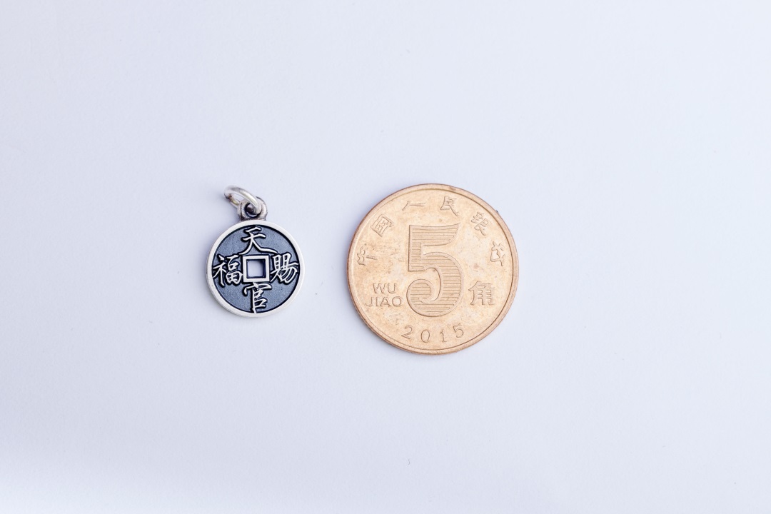 尺寸:直径约12毫米(不含挂扣),厚约1.6毫米,钱币孔径约1.9毫米,穿绳孔径约2.7毫米,重约1.4克(手工作品有少许误差,请知晓)。