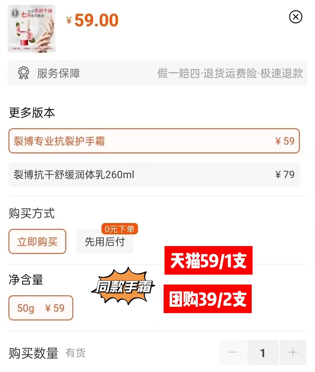 组合1:裂博手霜(50克)+足霜(50克)各1支,共
