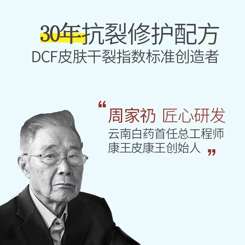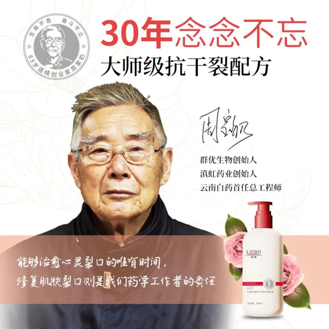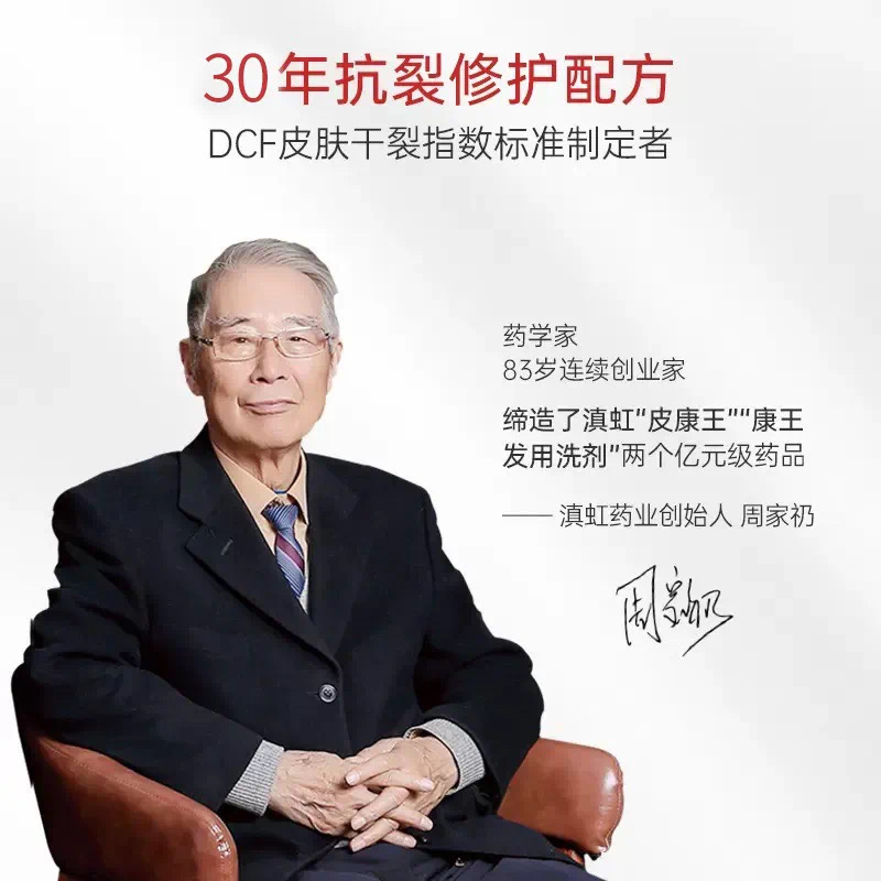 说到裂博手足霜,不得不提到云南群优生物科技创始人——周家礽老先生。 周家礽是谁? 他是 83岁连续创业家 云南白药首任总工程师 滇虹药业创始人 云南群优生物科技有限公司创始人 常人能有如此成就,又是80高龄,早就功成身退、颐养天年了。 确实,周老爷子81岁时,一手创办的滇虹药业被德国拜耳收购之后,也曾一度到加拿大养老。 可短短两年后,老爷子却毅然回国,再次创业! 因为,他还有个未了的心愿:做一款防治手足开裂的护肤霜!