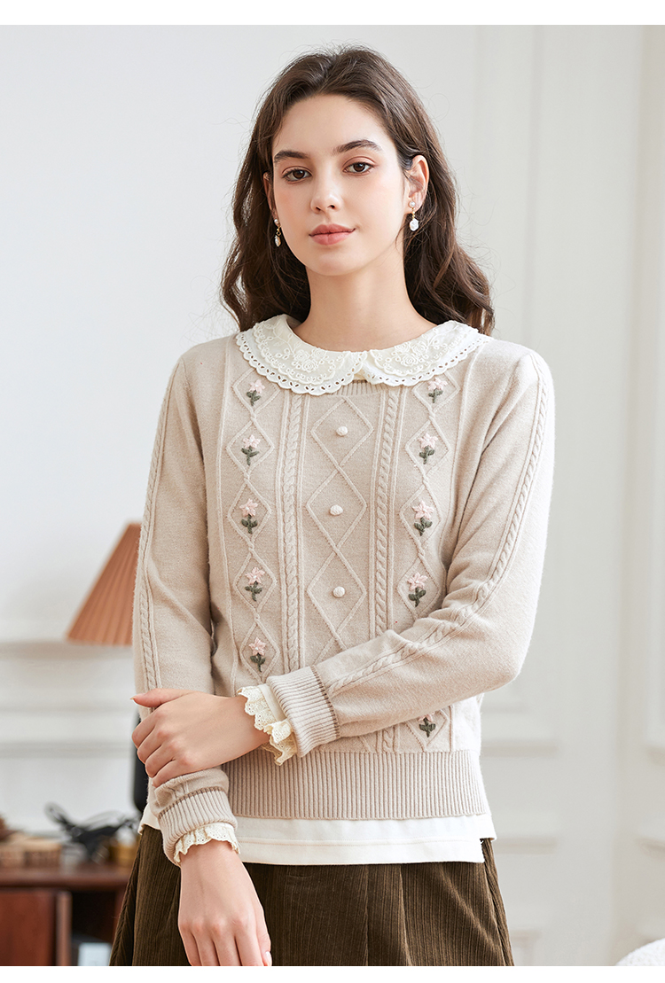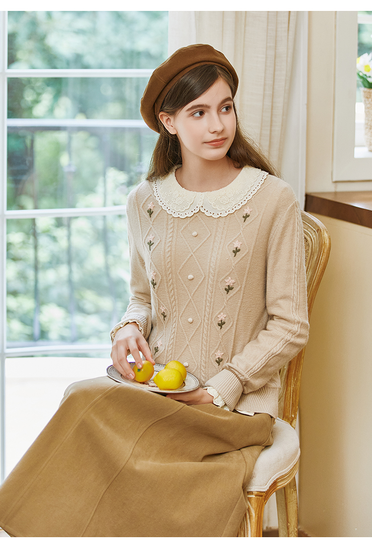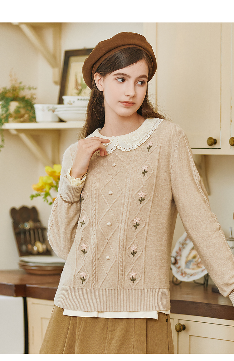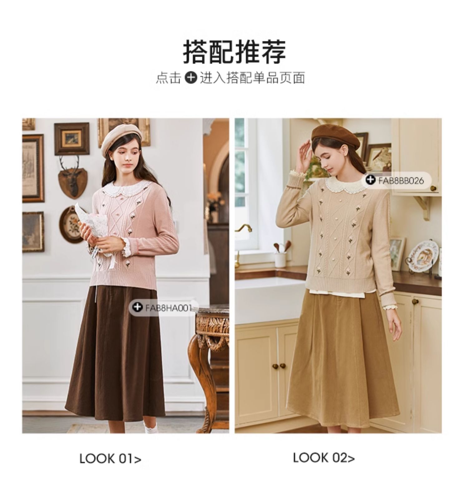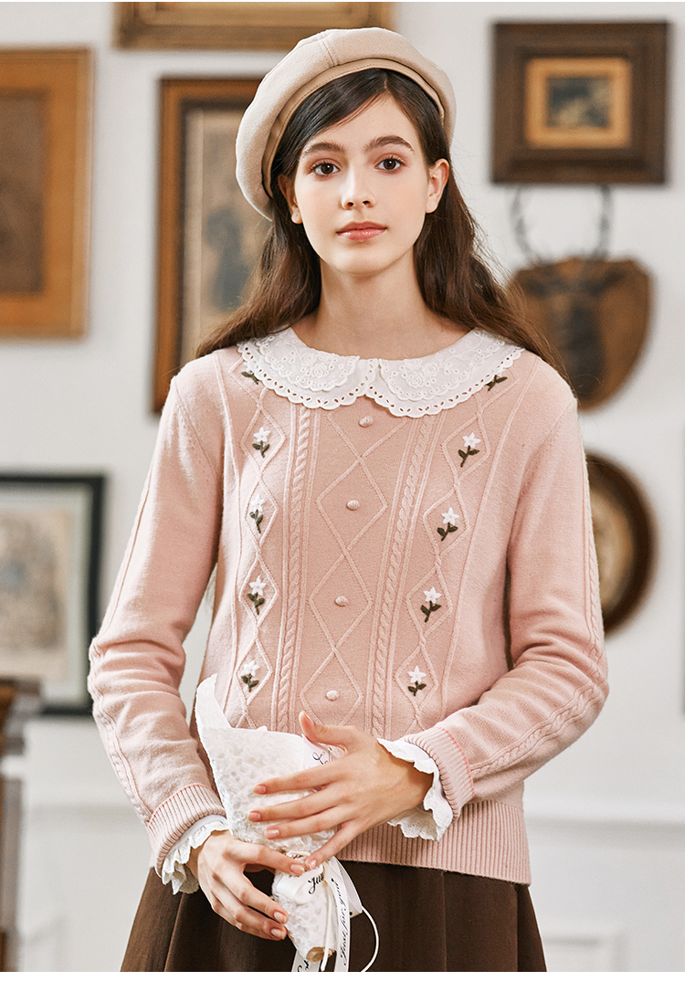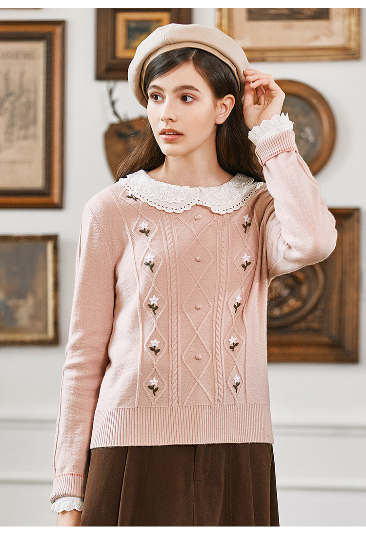 Famecoco范可儿圆领重工钩花套头毛衣秋冬FAB8DB040